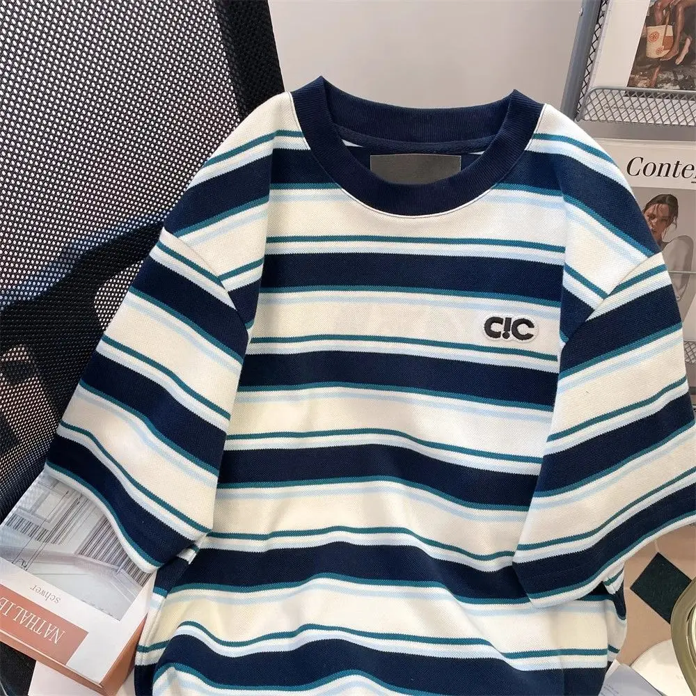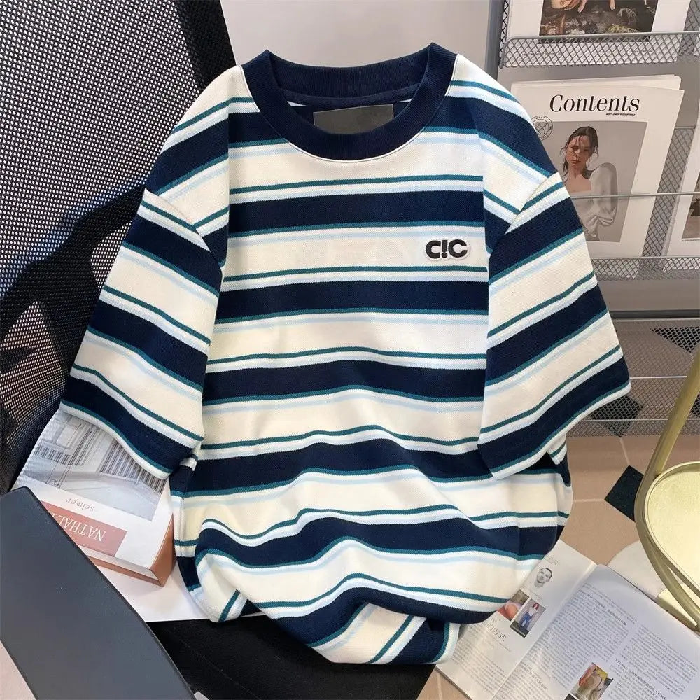 Hip Hop Street Men and Women Trendy Personality Stripe Round Neck Short Sleeve Couple Summer Loose Casual T-shirt Y2K harajuku