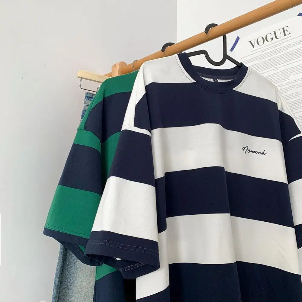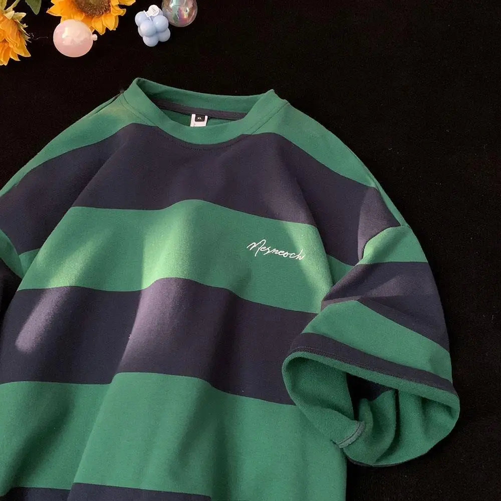 Summer American Street Retro Stripe Letter Print Graphic T-shirt Men and Women Trend Loose Casual Short Sleeve Top harajuku