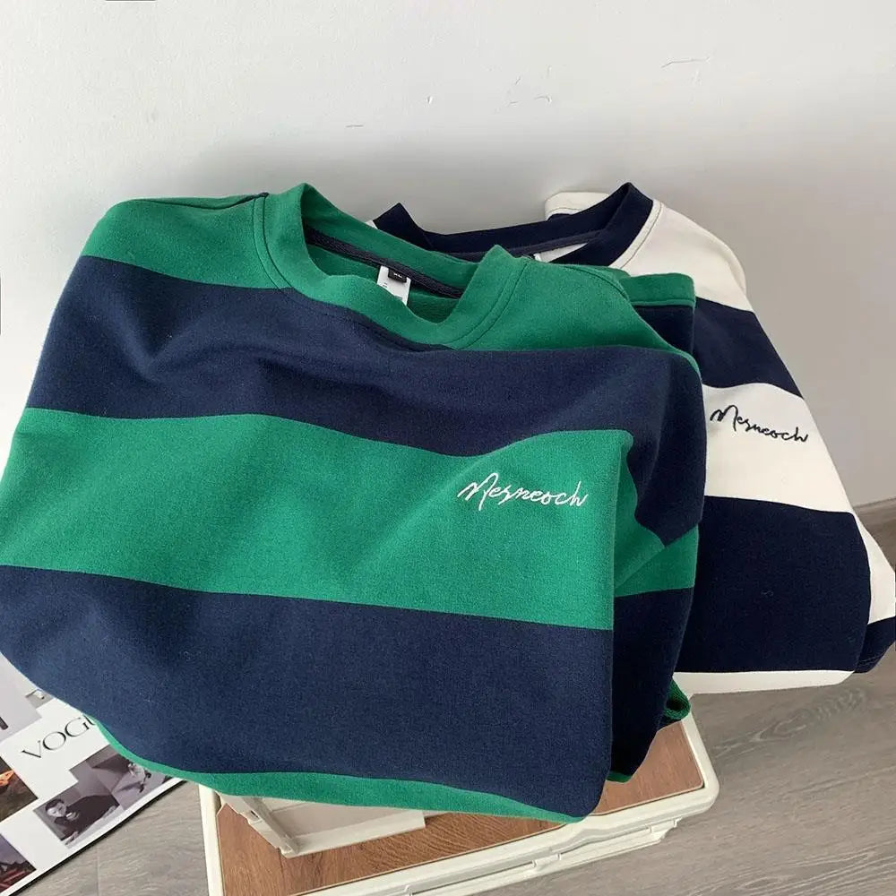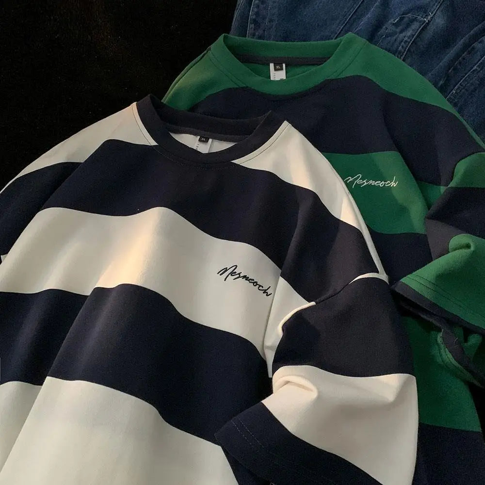 Aidase Summer American Street Retro Stripe Letter Print Graphic T-shirt Men and Women Trend Loose Casual Short Sleeve Top harajuku