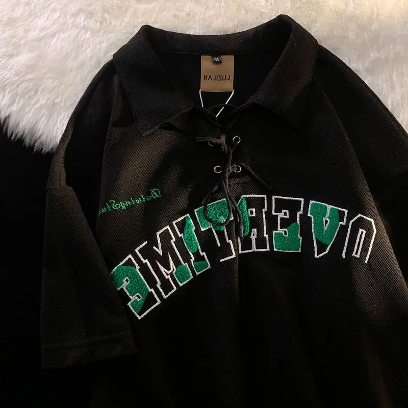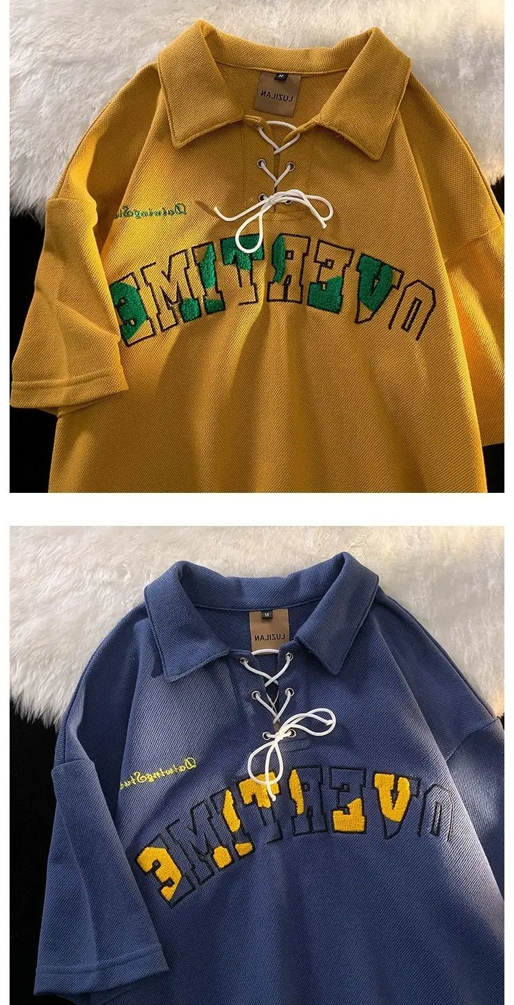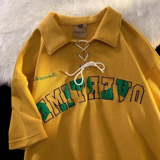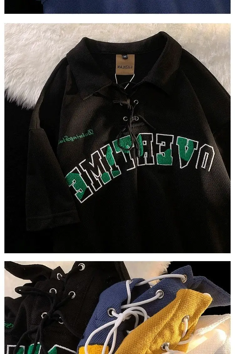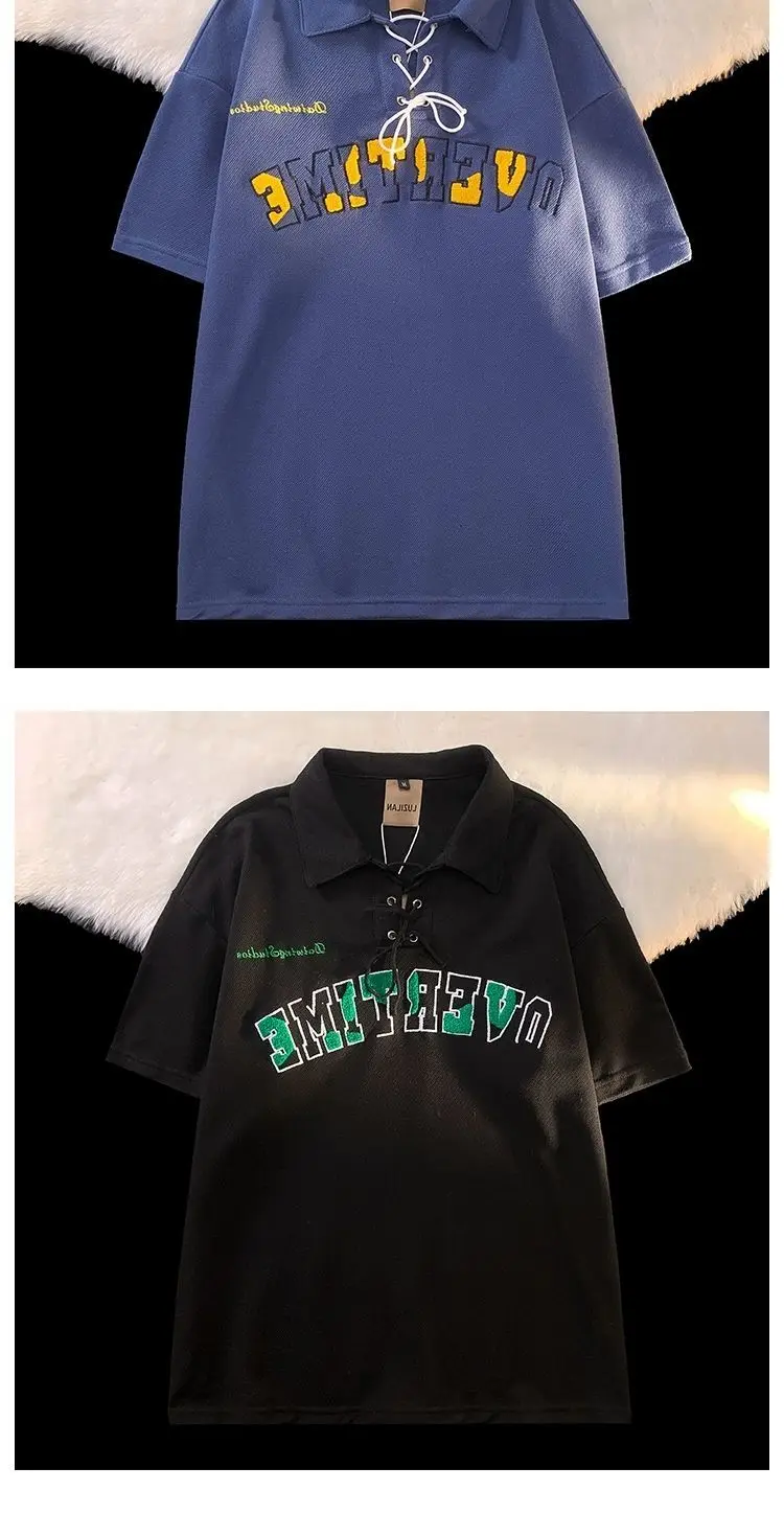 American Retro Personalized Lapel Tie Short Sleeved Men and Women Summer Street Loose Hip-hop Letter Graphic T-shirt Top Y2k