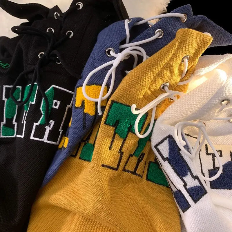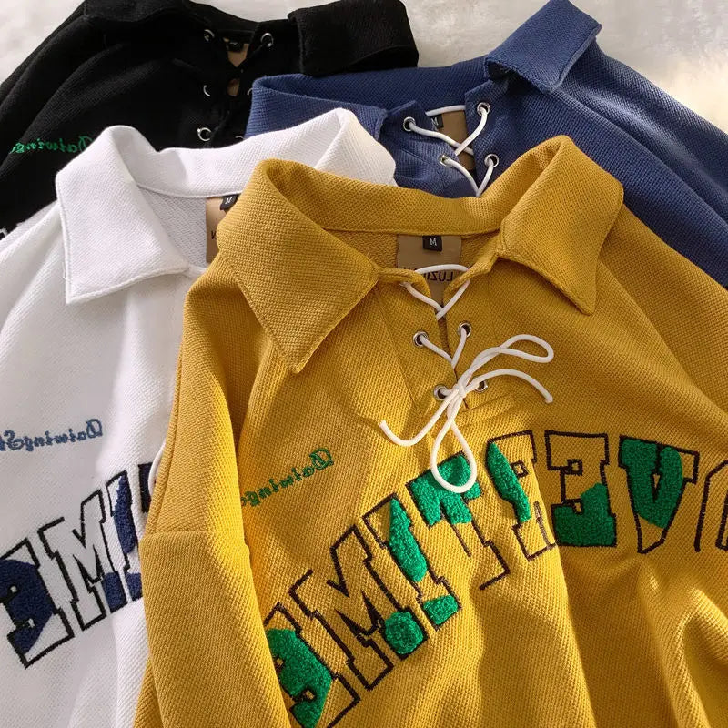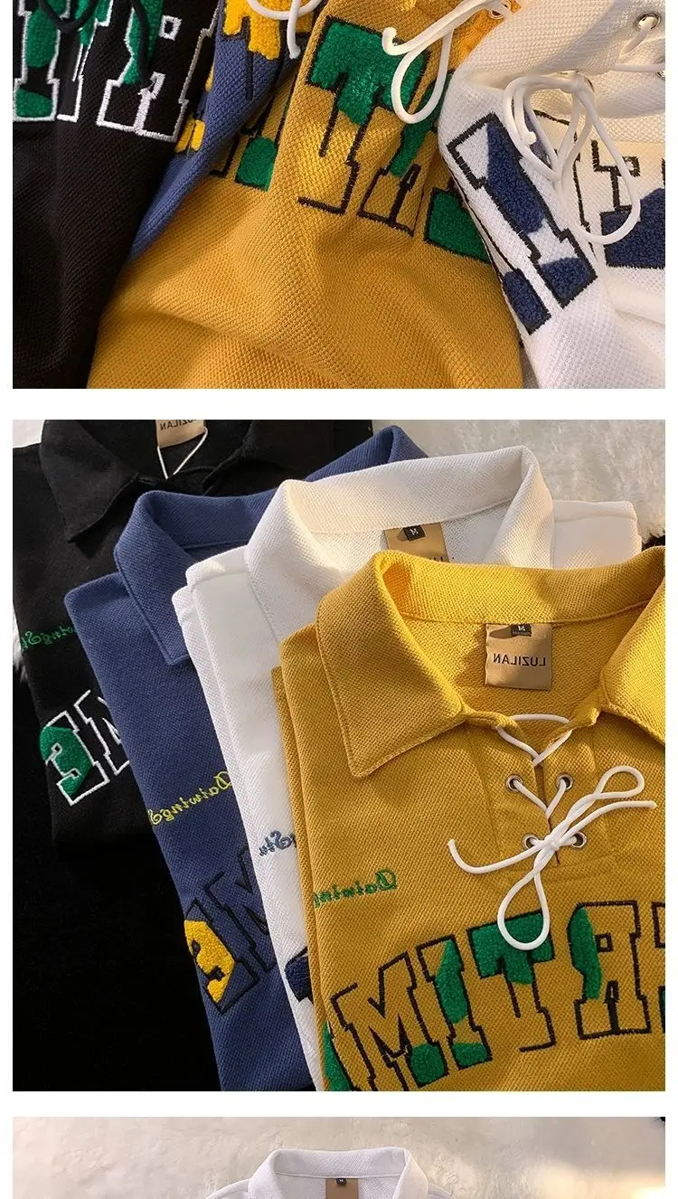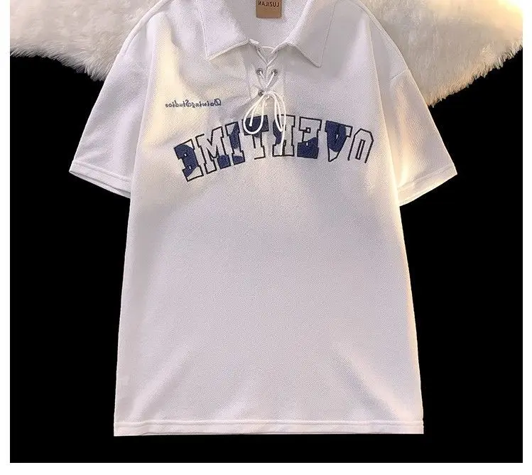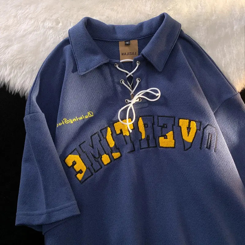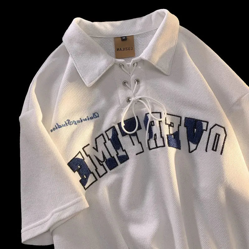 American Retro Personalized Lapel Tie Short Sleeved Men and Women Summer Street Loose Hip-hop Letter Graphic T-shirt Top Y2k