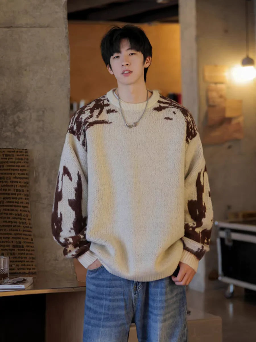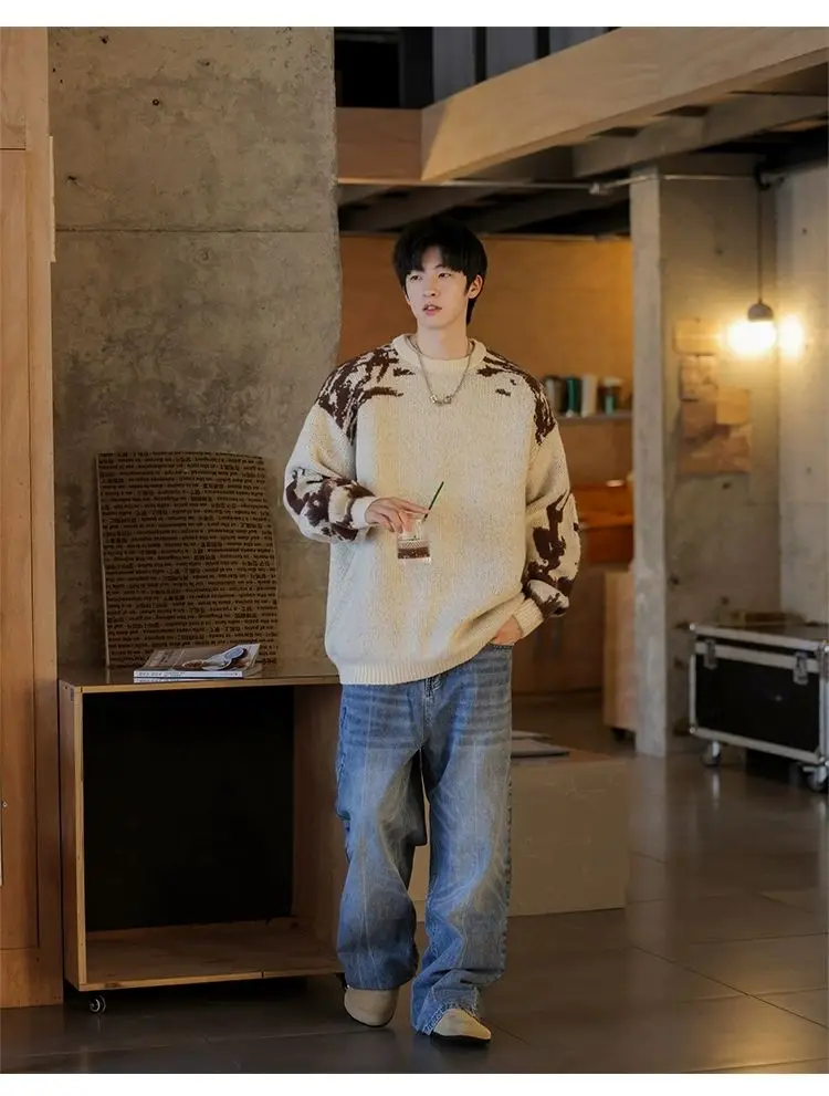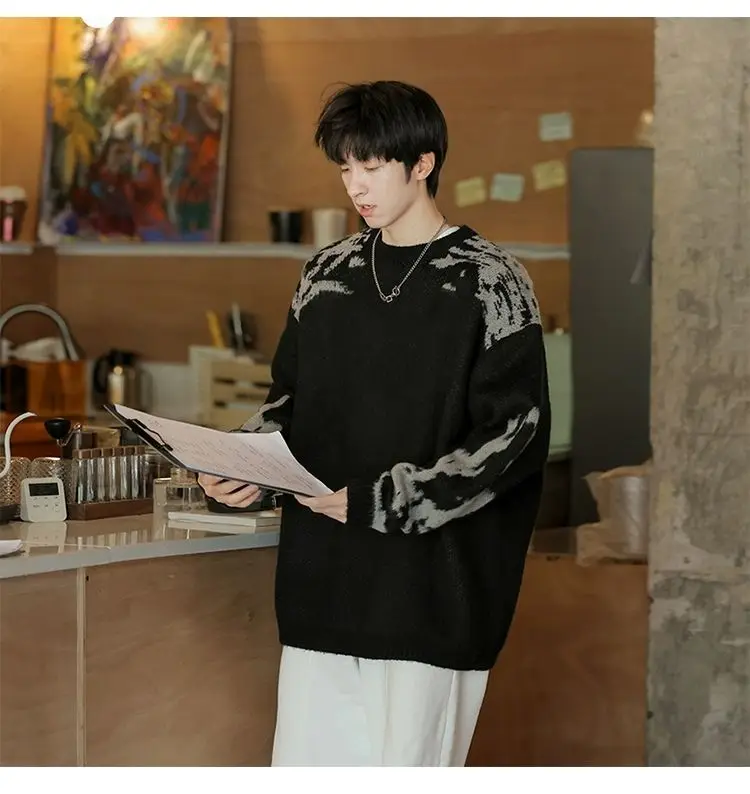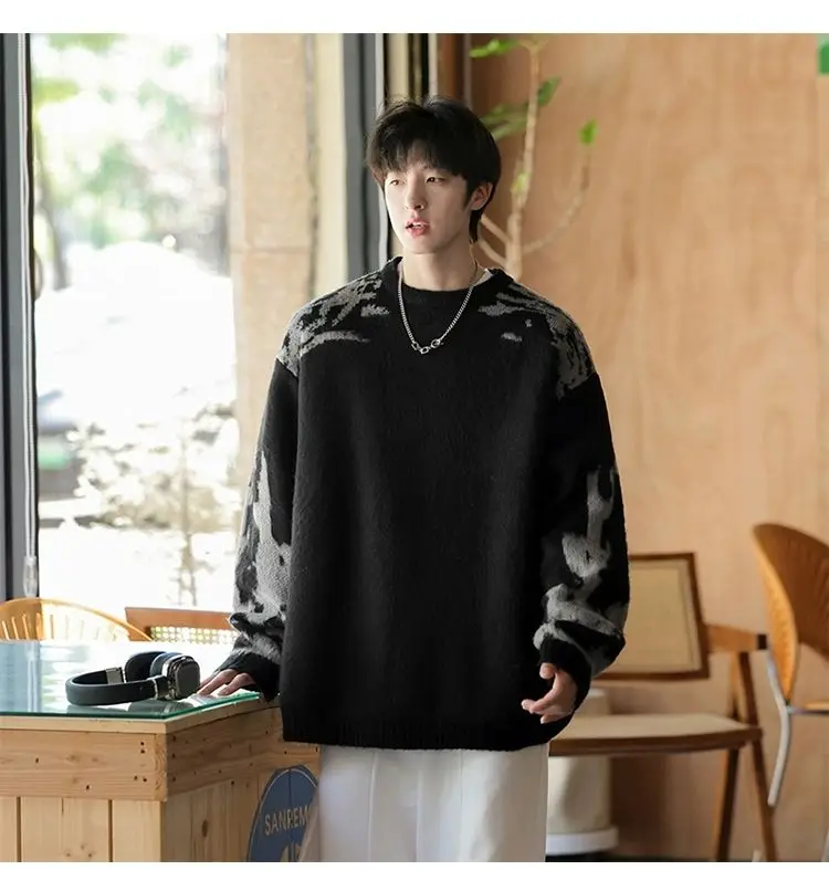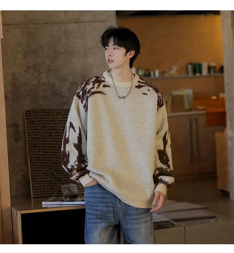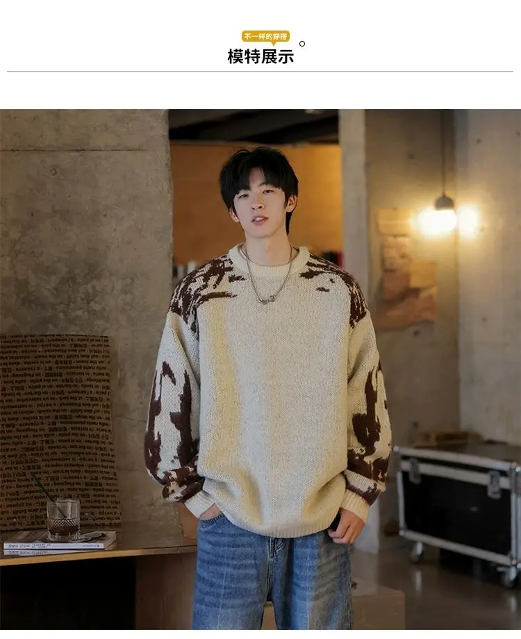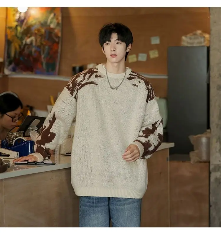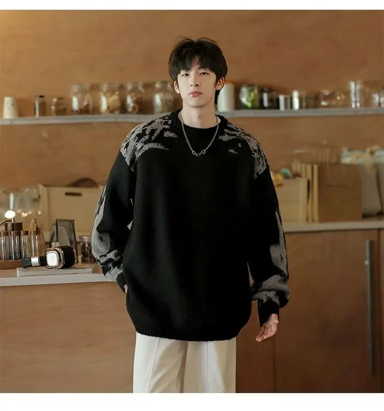 Aidase Street Korean Retro New Contrast Color Sweater Men's Ins Youth Versatile Retro Y2K Loose Personalized Round Neck Sweater Top