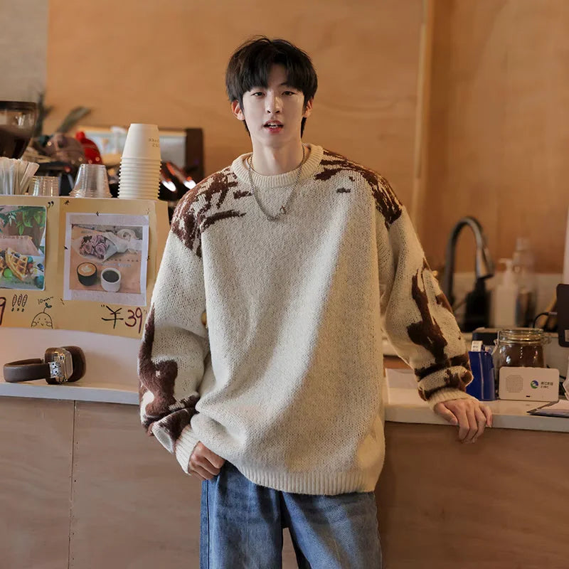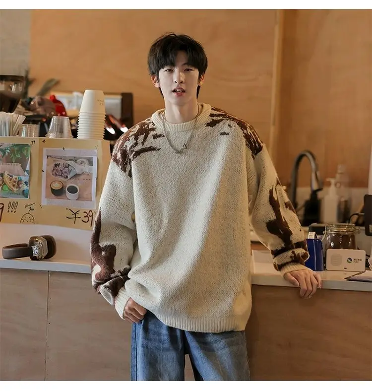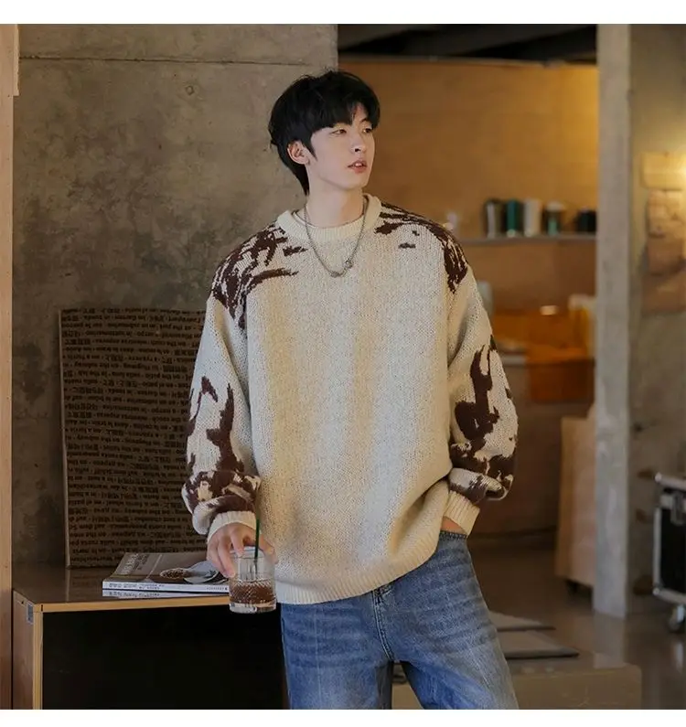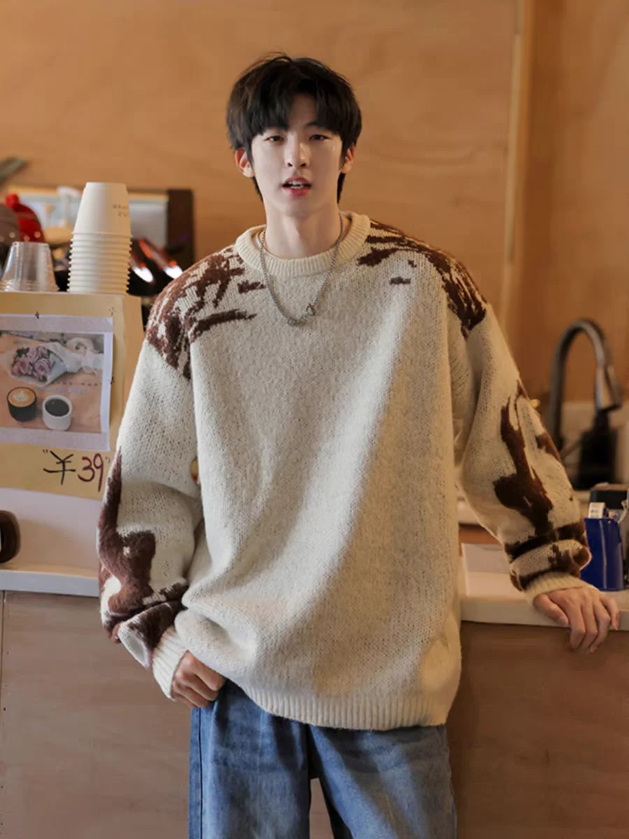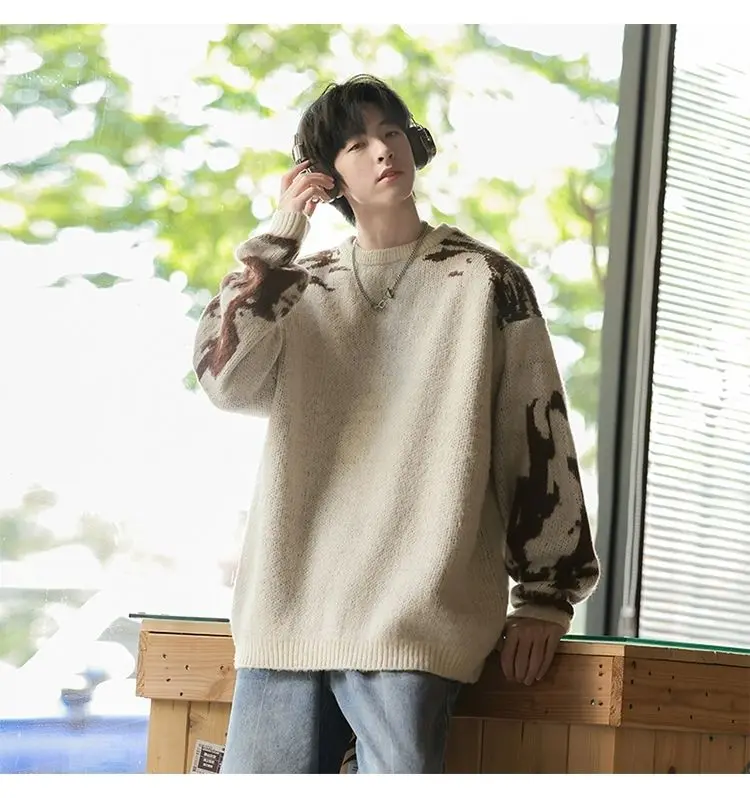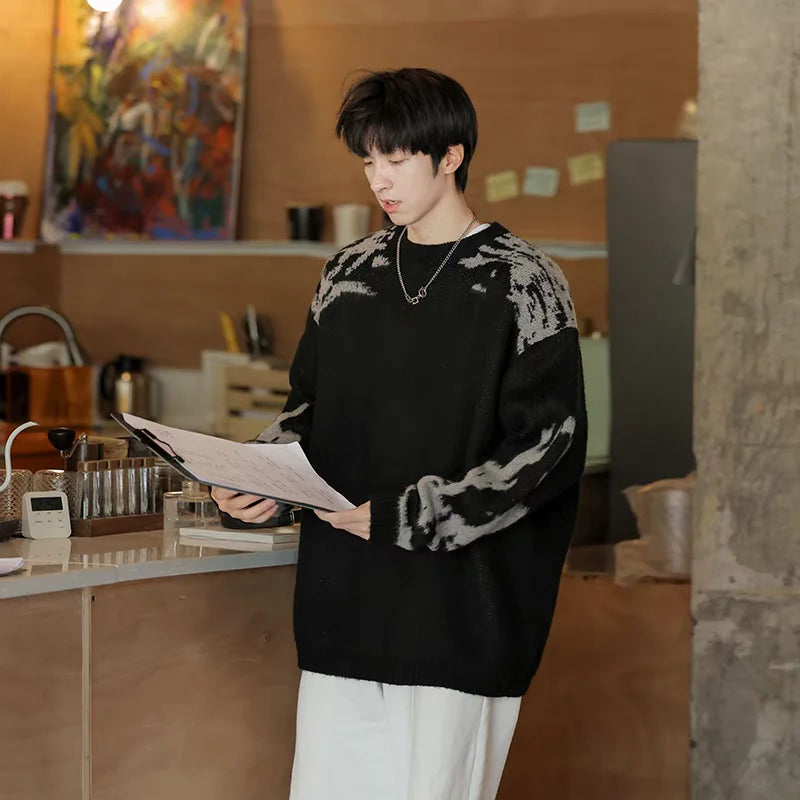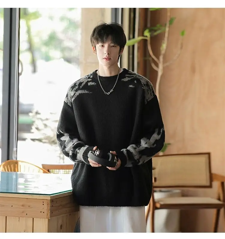 Aidase Street Korean Retro New Contrast Color Sweater Men's Ins Youth Versatile Retro Y2K Loose Personalized Round Neck Sweater Top