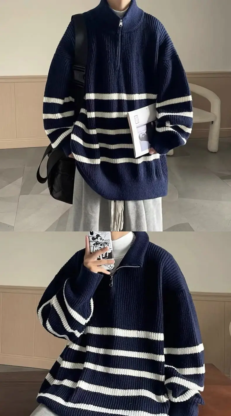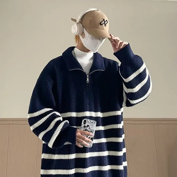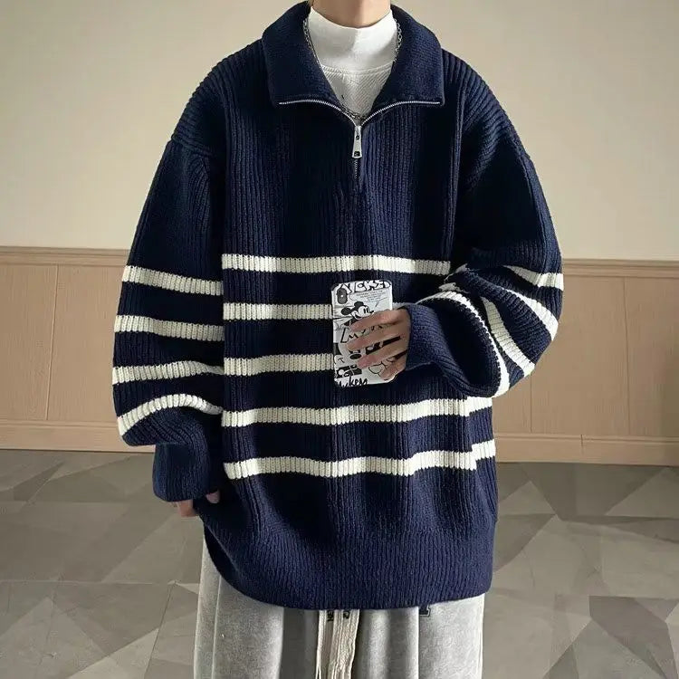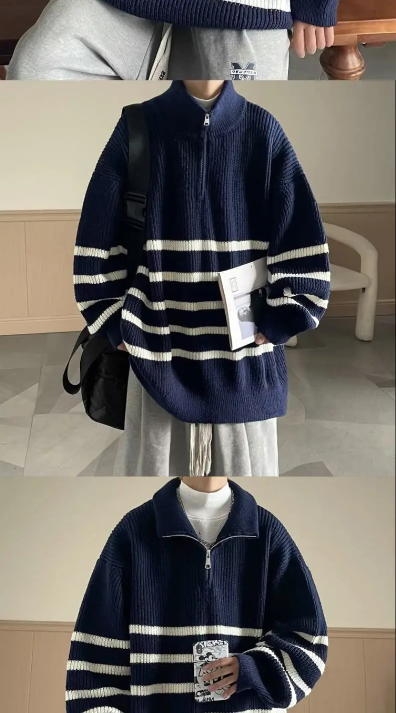 Aidase Korean Half Zip Street Retro Men Lazy Style Sweater Autumn Winter Thickened Youth Stand Up Collar Sweater Striped Sweater Jacket