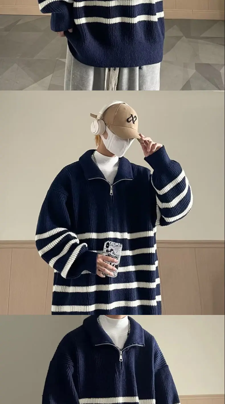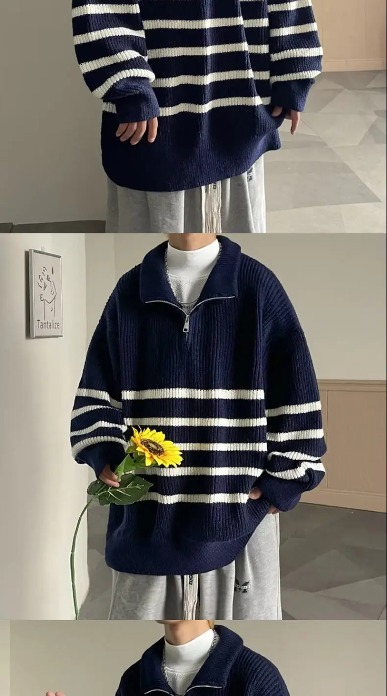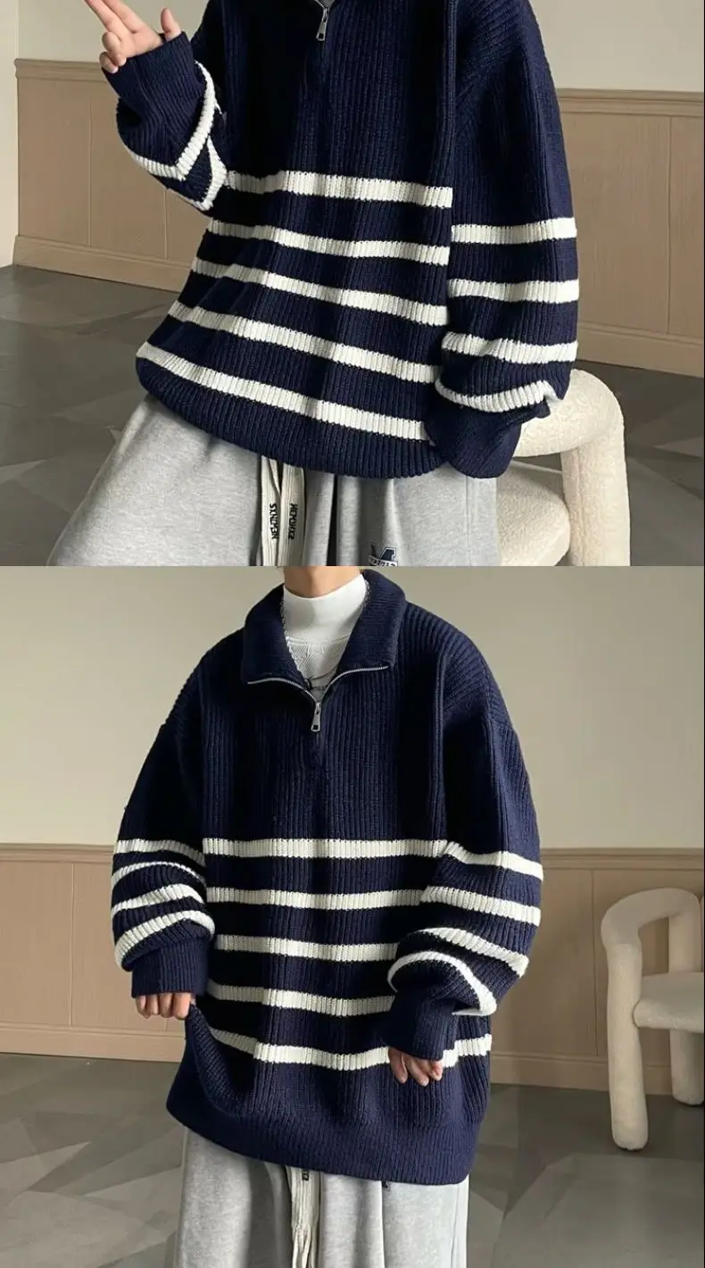 Aidase Korean Half Zip Street Retro Men Lazy Style Sweater Autumn Winter Thickened Youth Stand Up Collar Sweater Striped Sweater Jacket