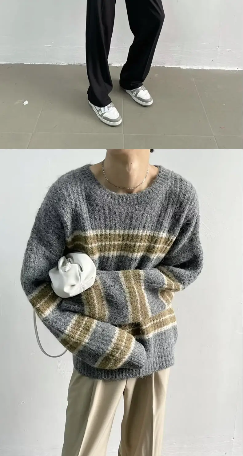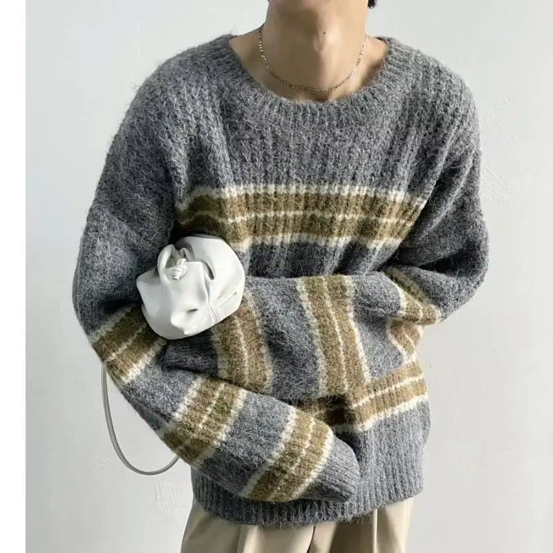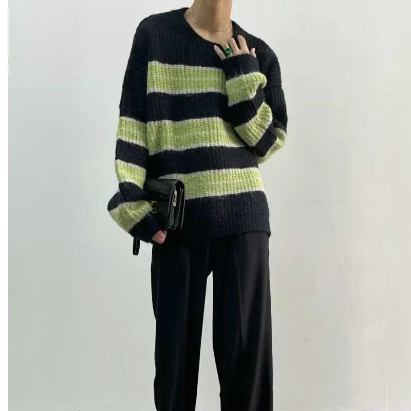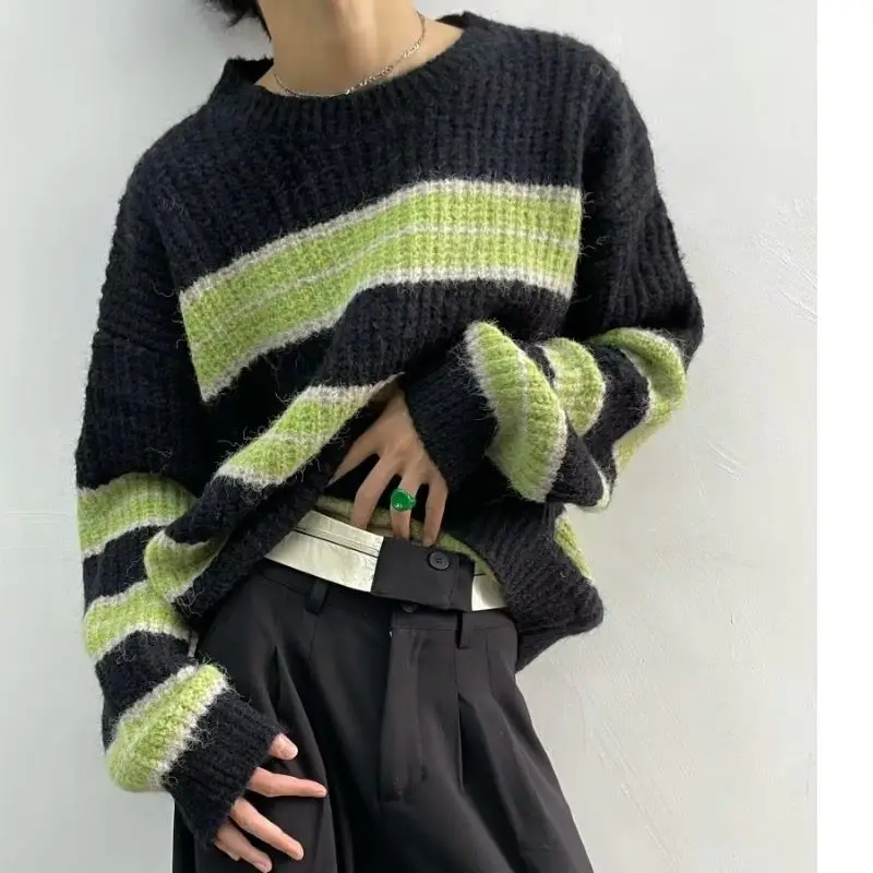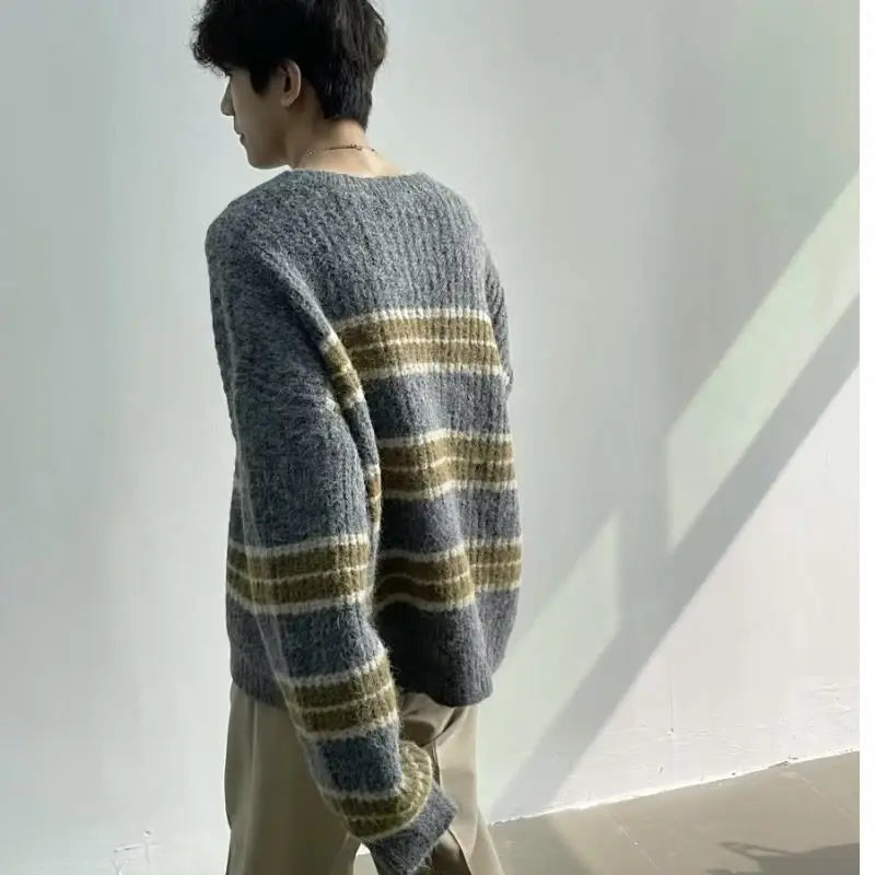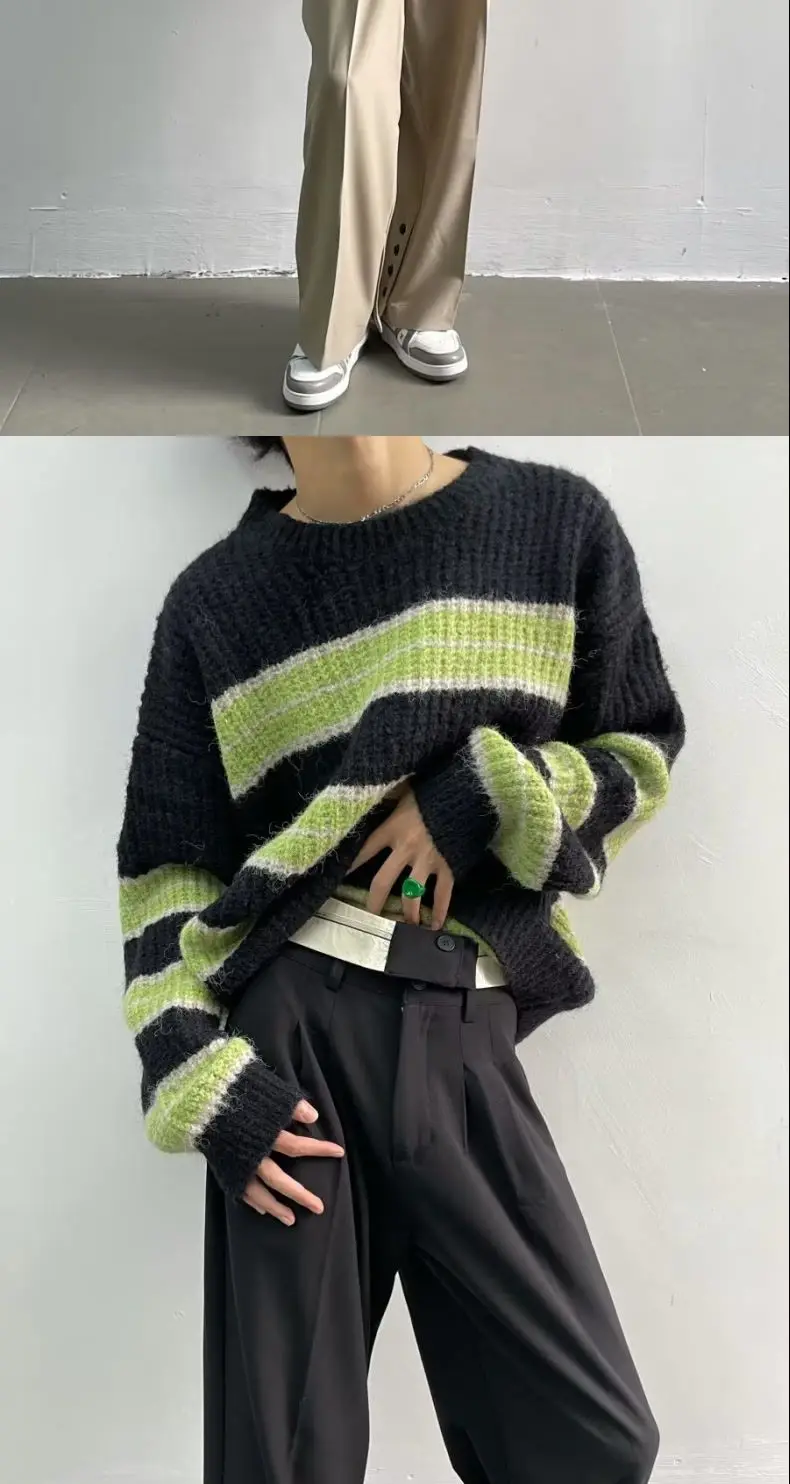 Aidase Korean Style Lazy Style Contrast Striped Sweater Men's Autumn and Winter American Loose Y2K High-end Design Street Sweater Top