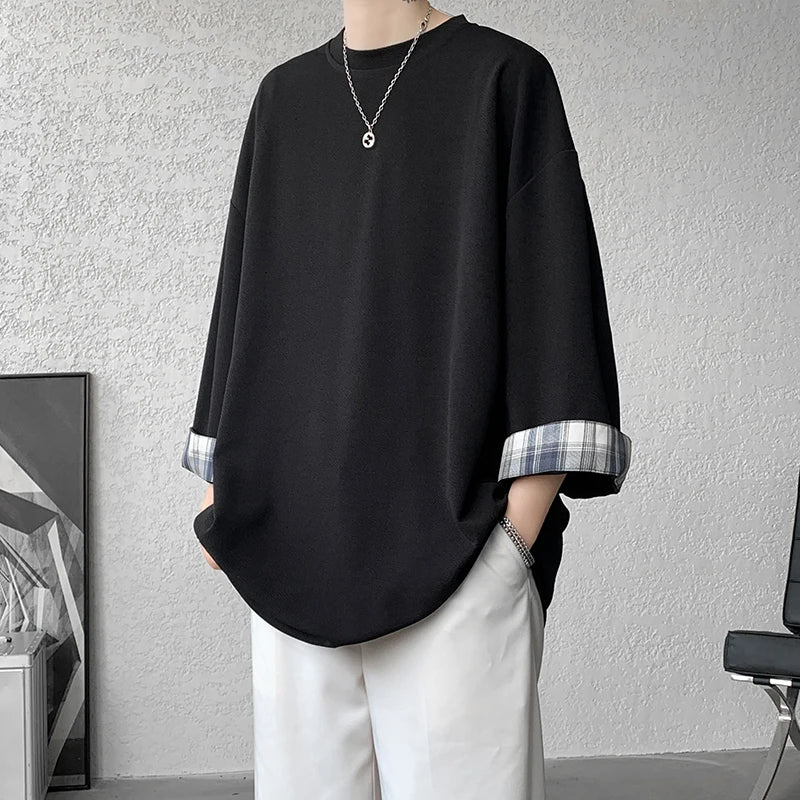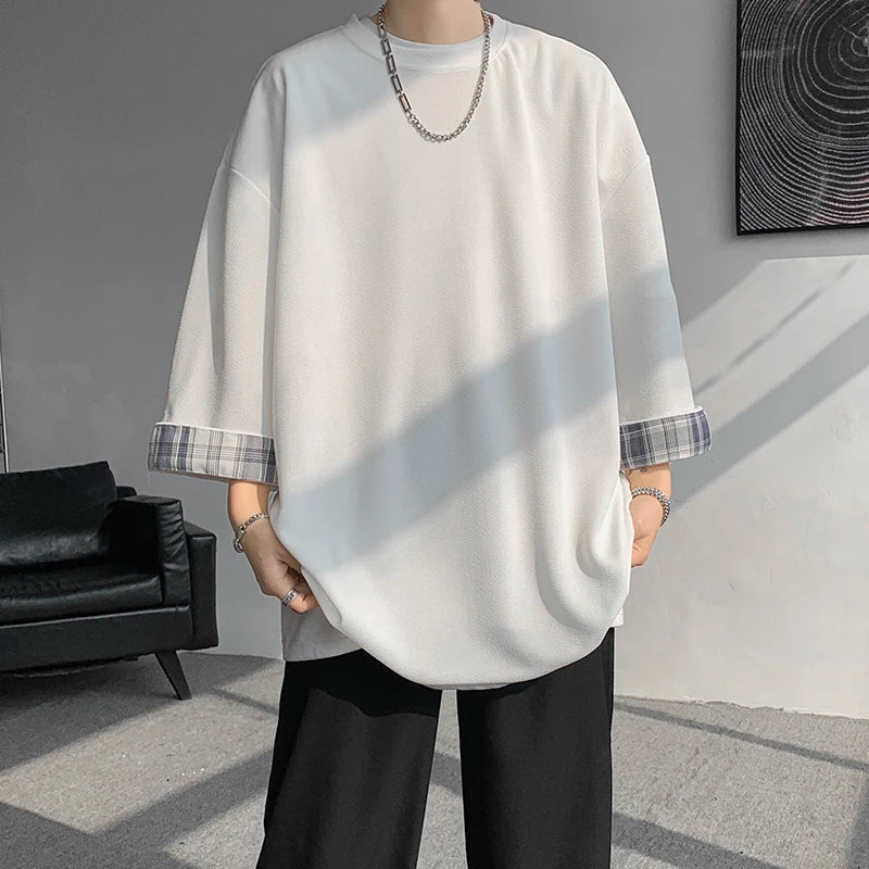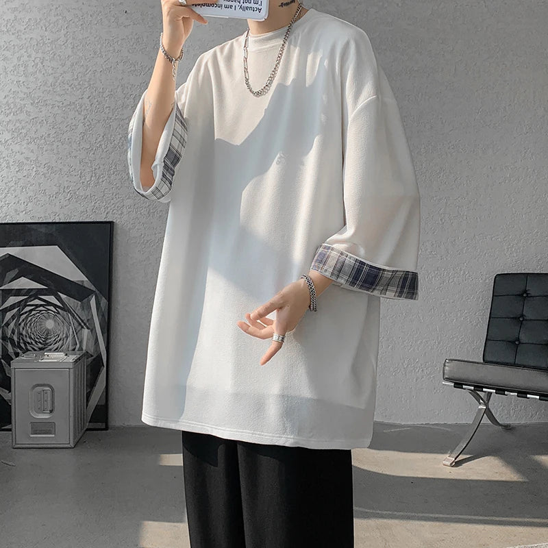 Aidase 8XL-M Spring Summer Men's Ice Silk T-shirts Women Oversized Plaid T-shirt Korean Style Casual Seven sleeves T-Shirt Male