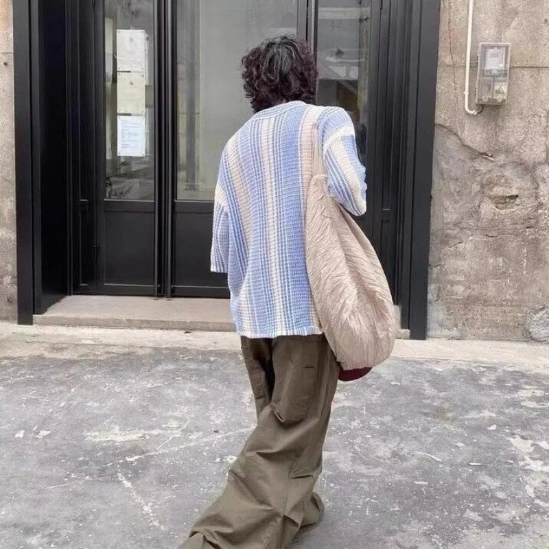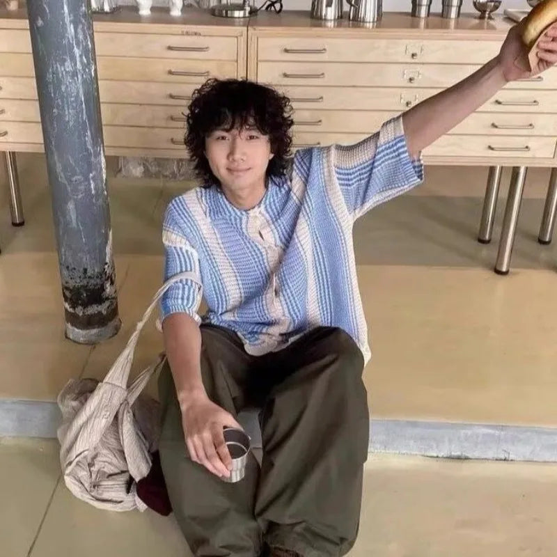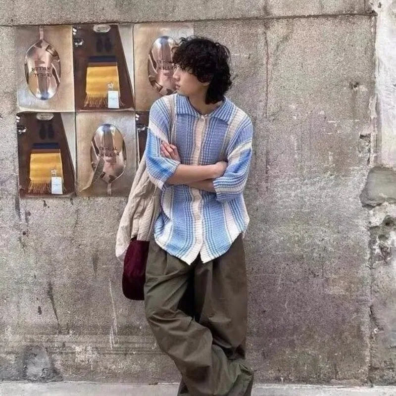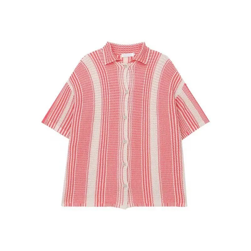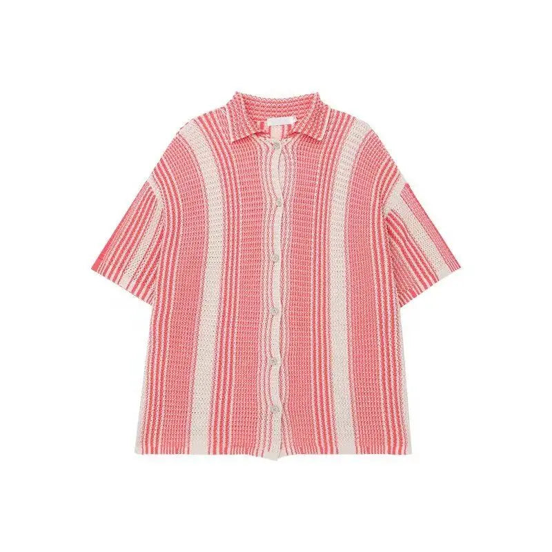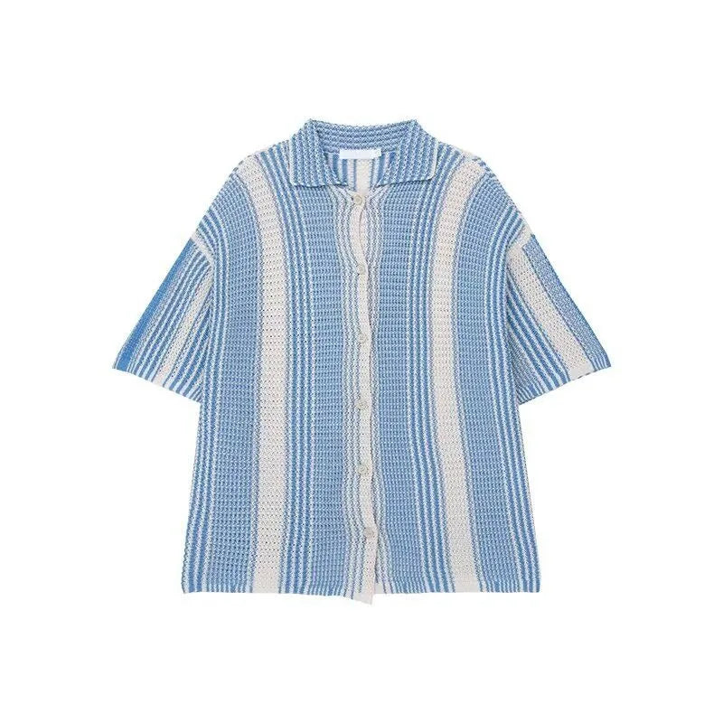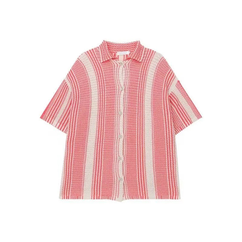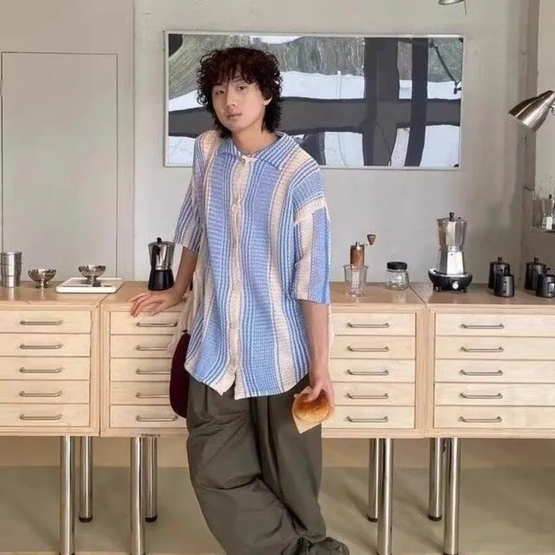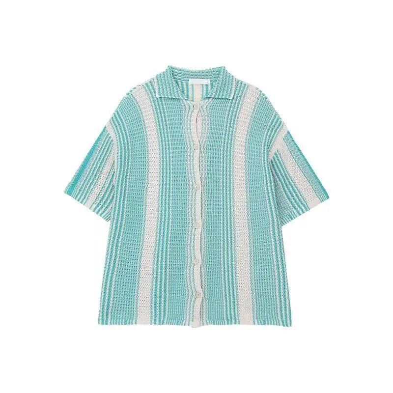 AIDASE - American Hollow Out Men's Shirt Contrast Color Retro Striped Top Summer Casual Fashion Male Short Sleeved Top