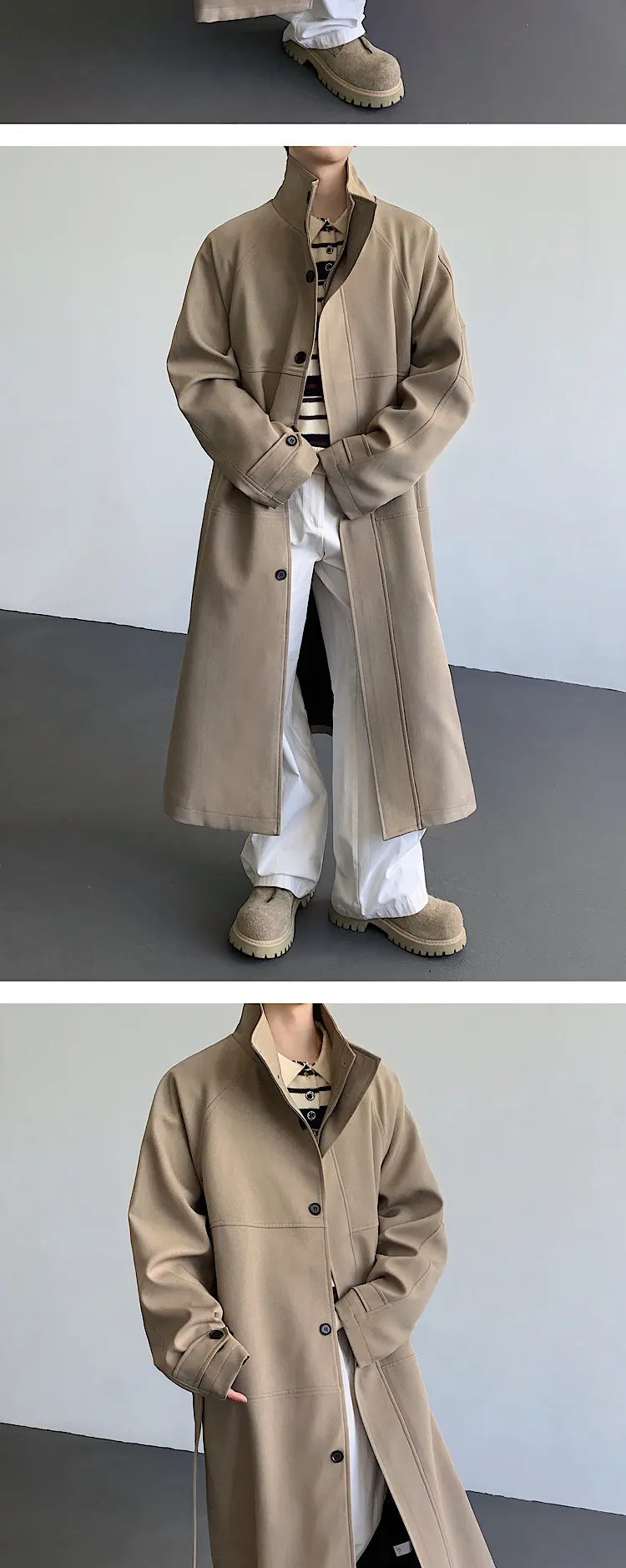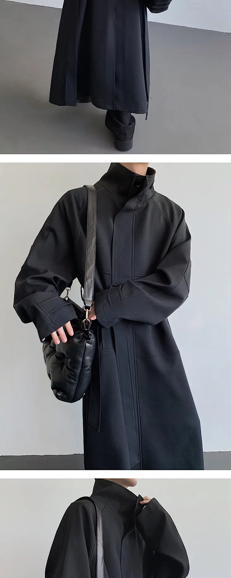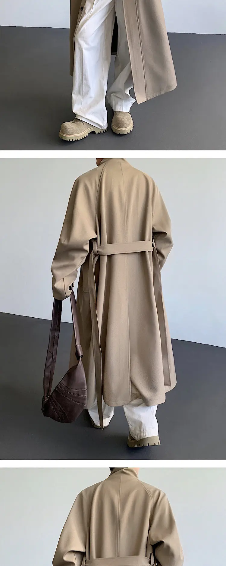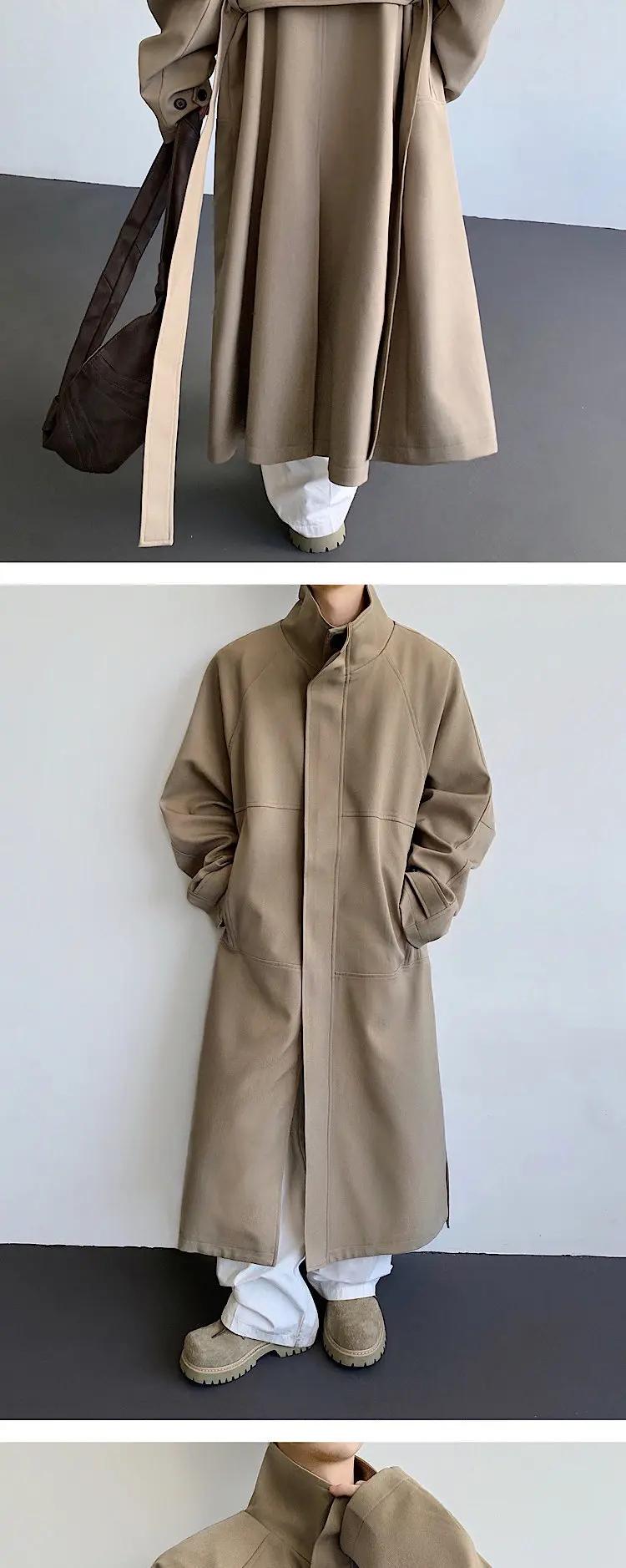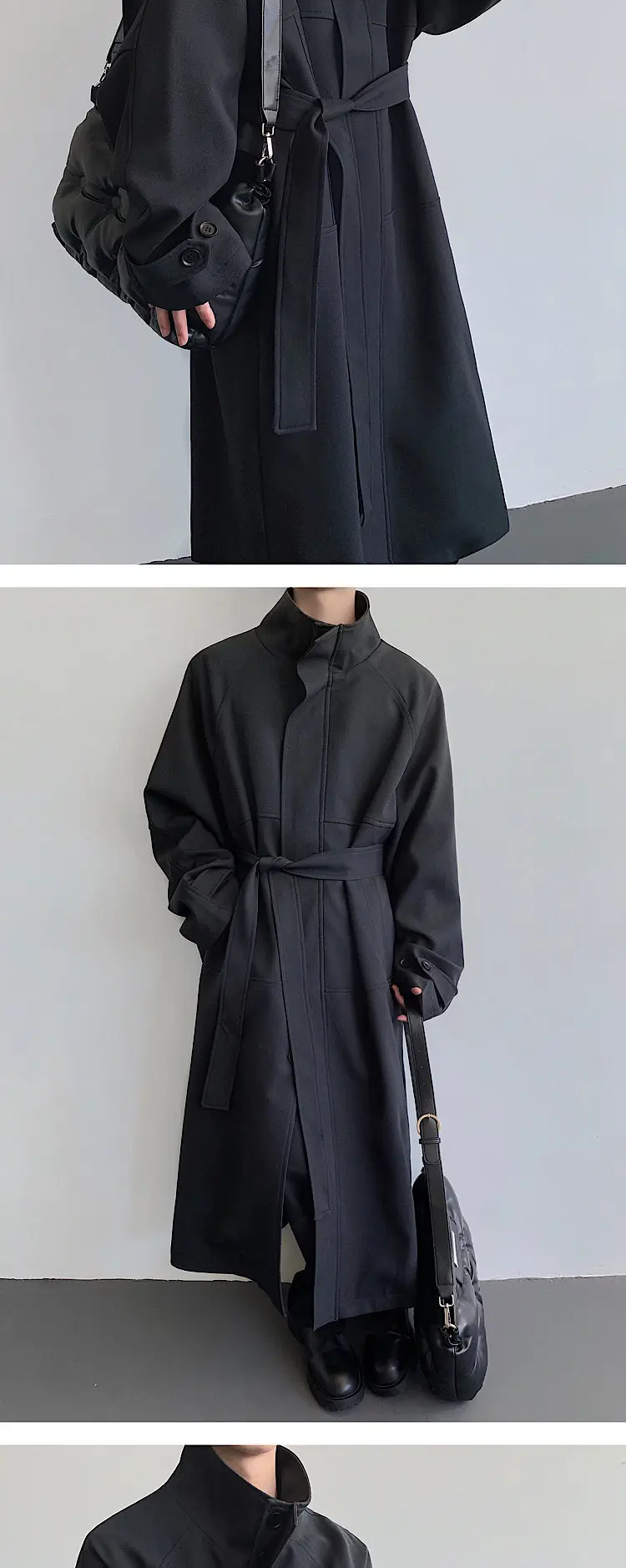 AIDASE - Autumn New Men's Mid-Length Trench Coat Korean Style Over-the-Knee Long Sleeve Lace-up Stand collar Windbreaker 21E7663