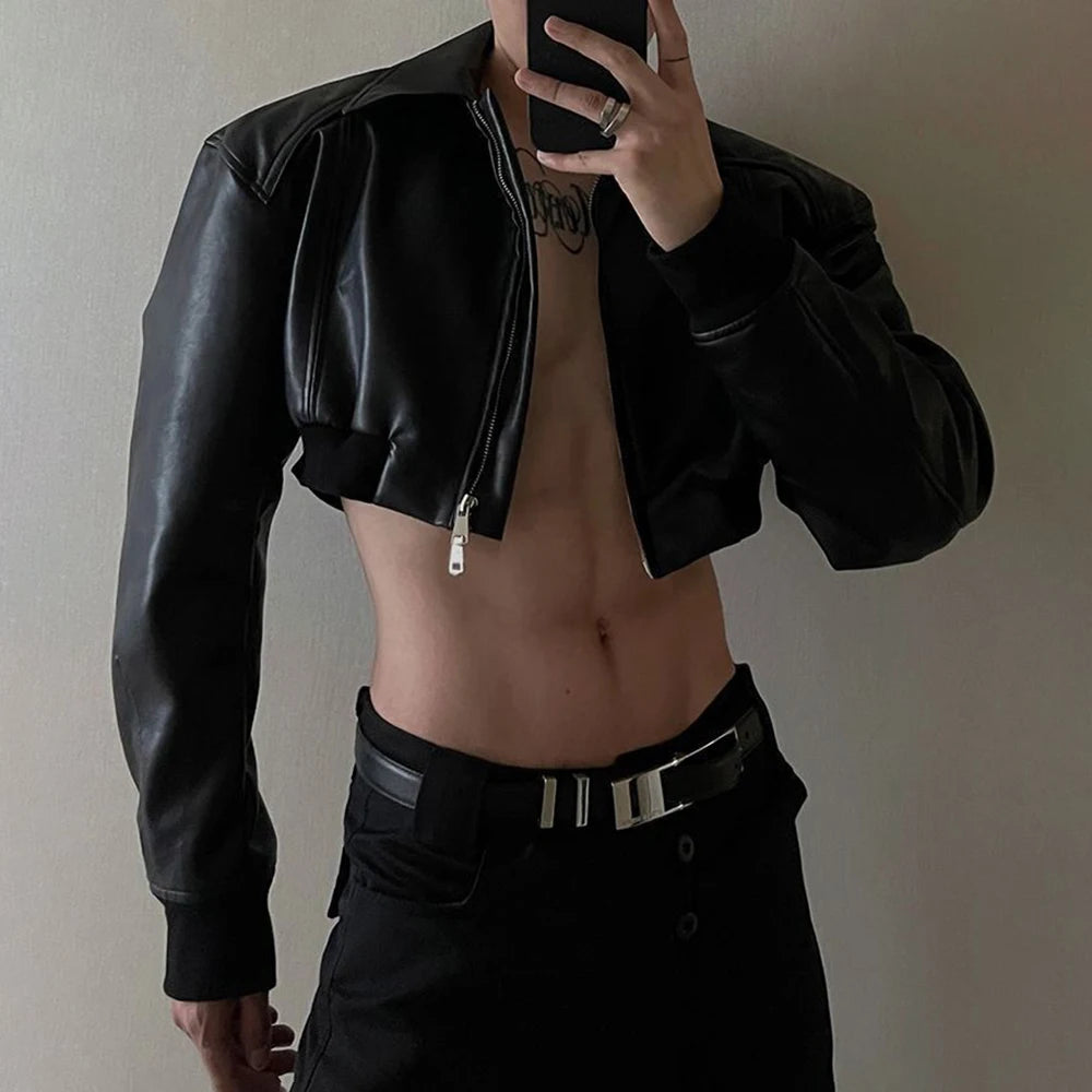Autumn Product Design Sense Lgbt Sexy Navel Exposed Fashion High Street High Waist Double Zipper Wide Shoulder Leather Jacket