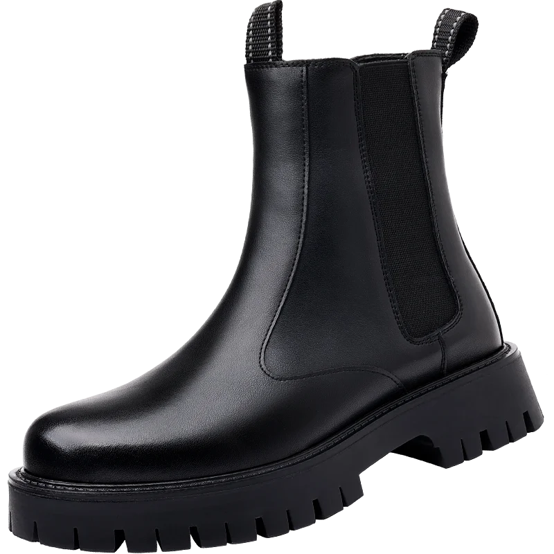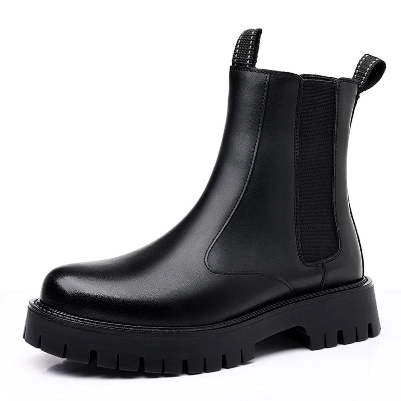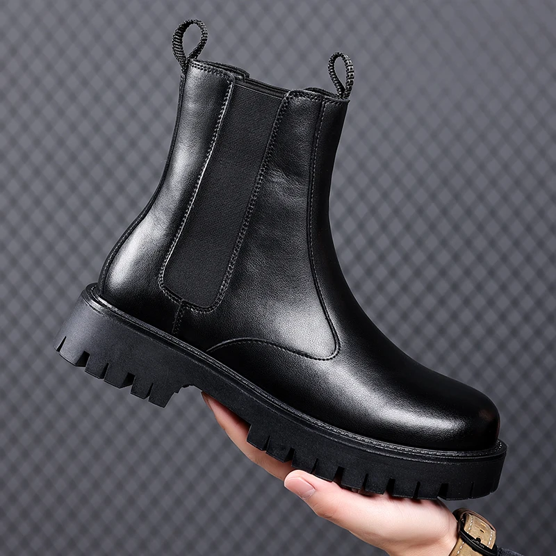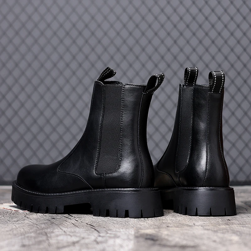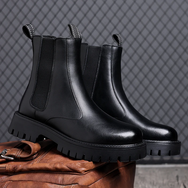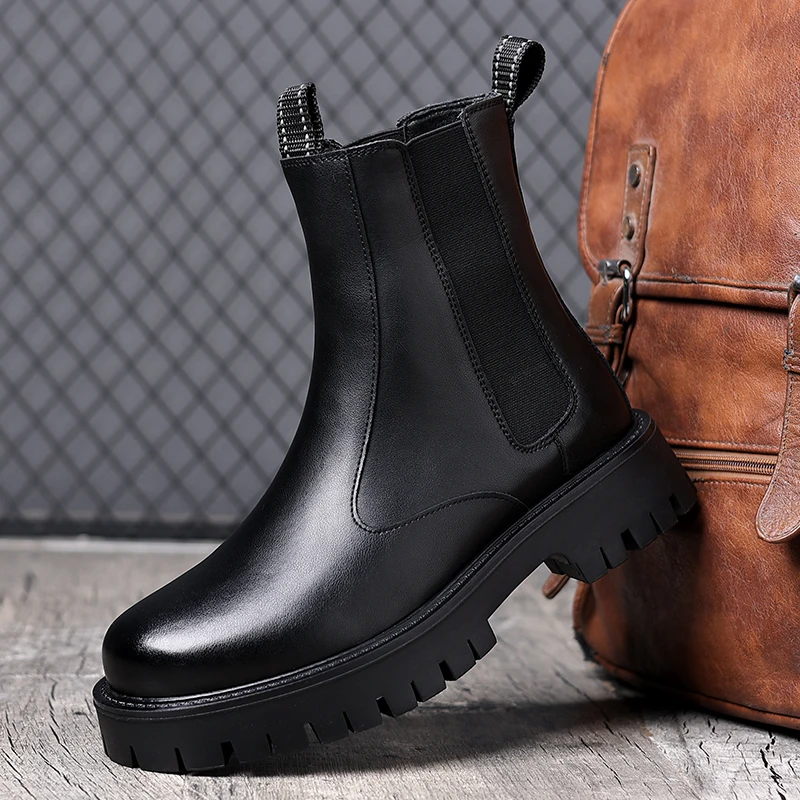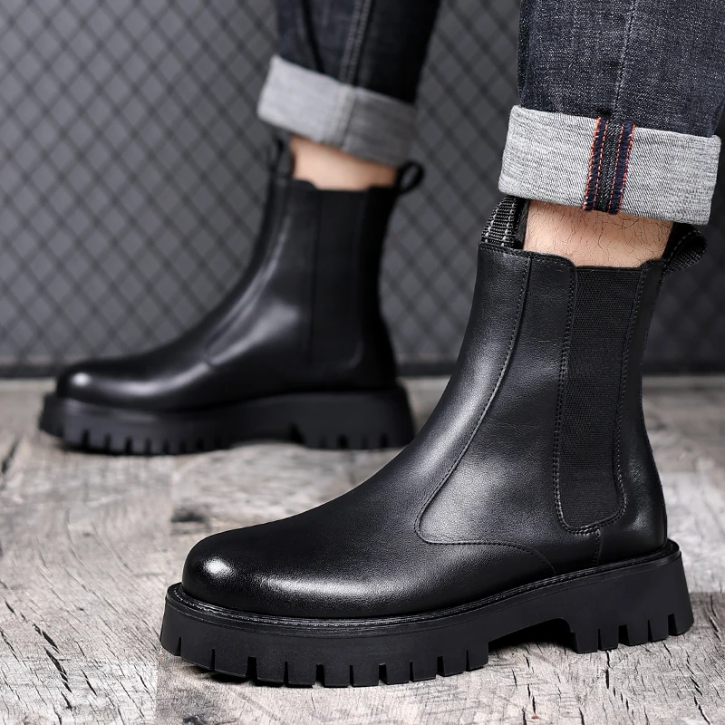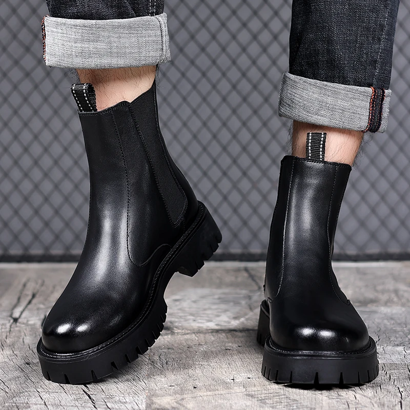 Aidase Brand Classic Black High Top Boots Men High Heel Genuine Leather Ankle Chelsea Boots Men British Style Thick Sole Mid Top Boots