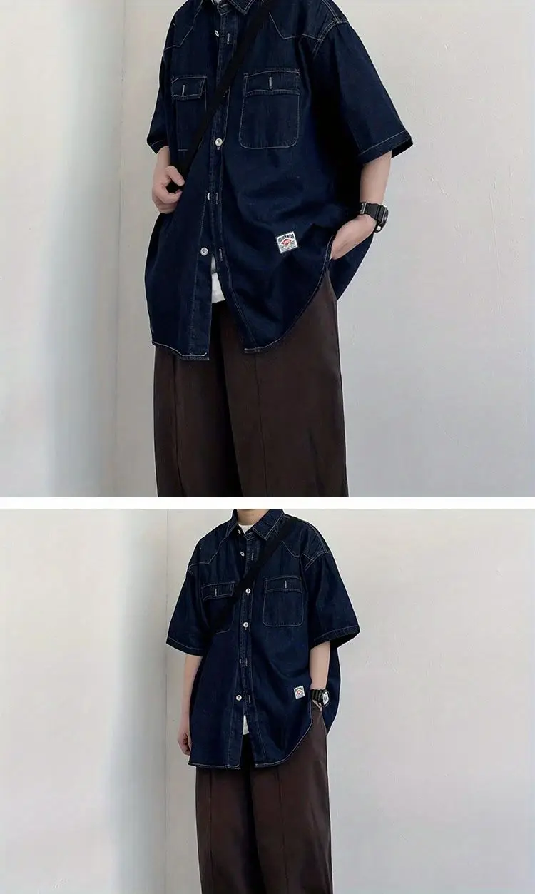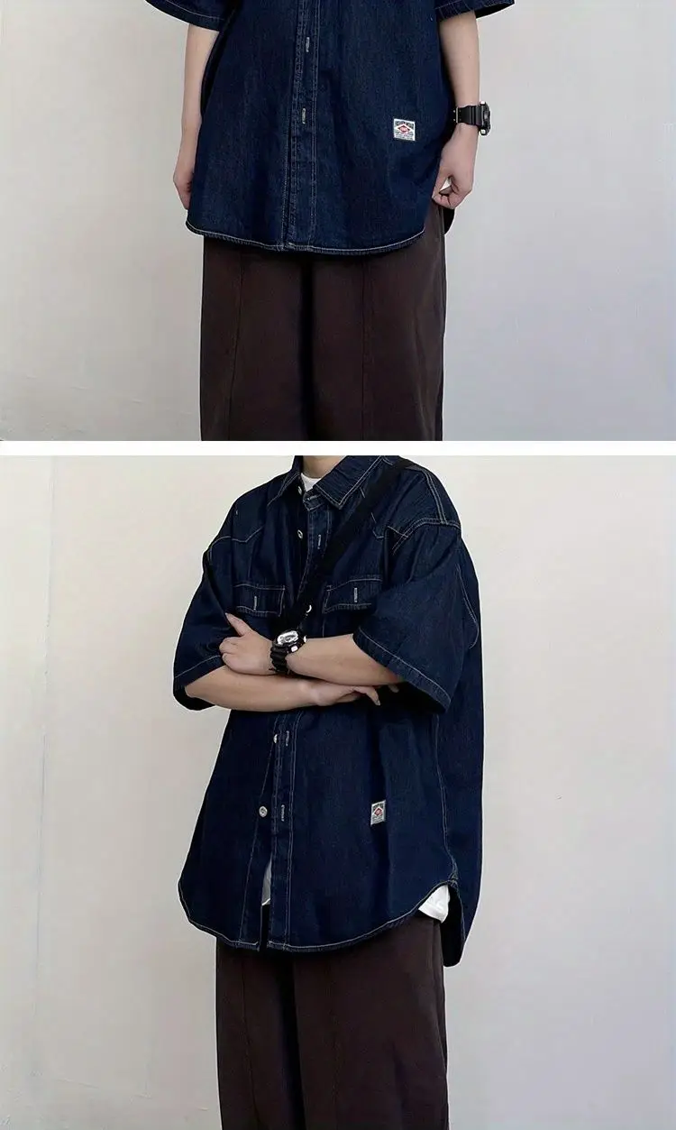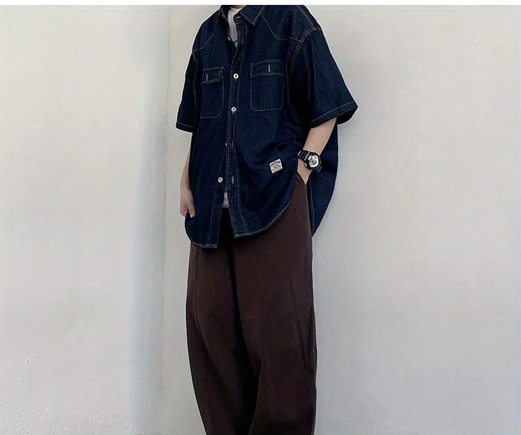 AIDASE - Cityboy Japanese Thin Short Sleeved Denim Shirt for Men Trendy Casual Loose Fitting Workwear Shirt Summer Chest Pocket Top Tees