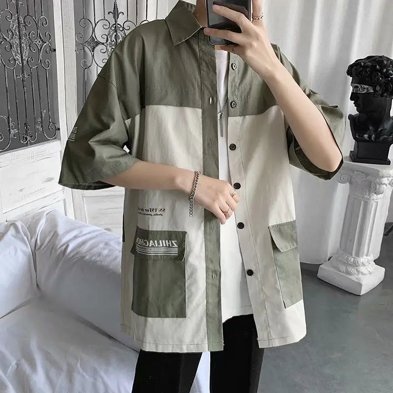 Elegant Fashion Shirts Loose Solid Patchwork Casual Turn-down Collar Short Sleeve Pockets Spring Summer Thin Men's Clothing