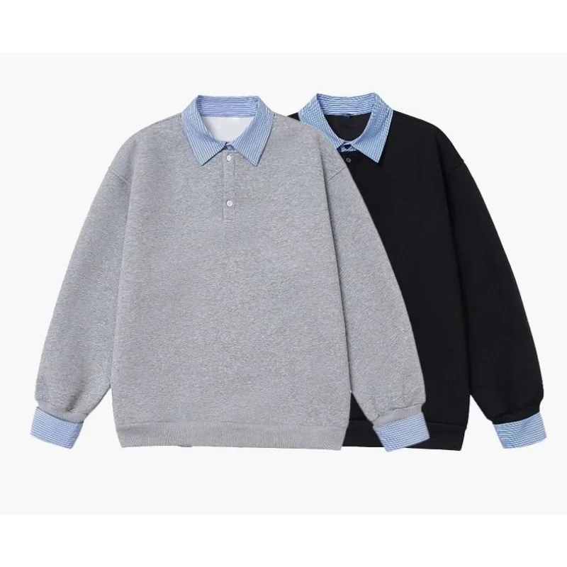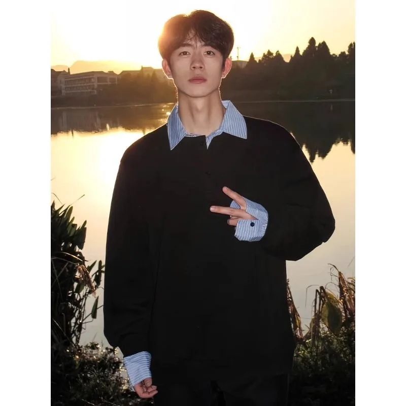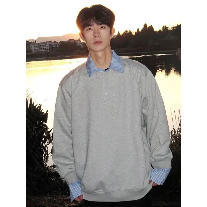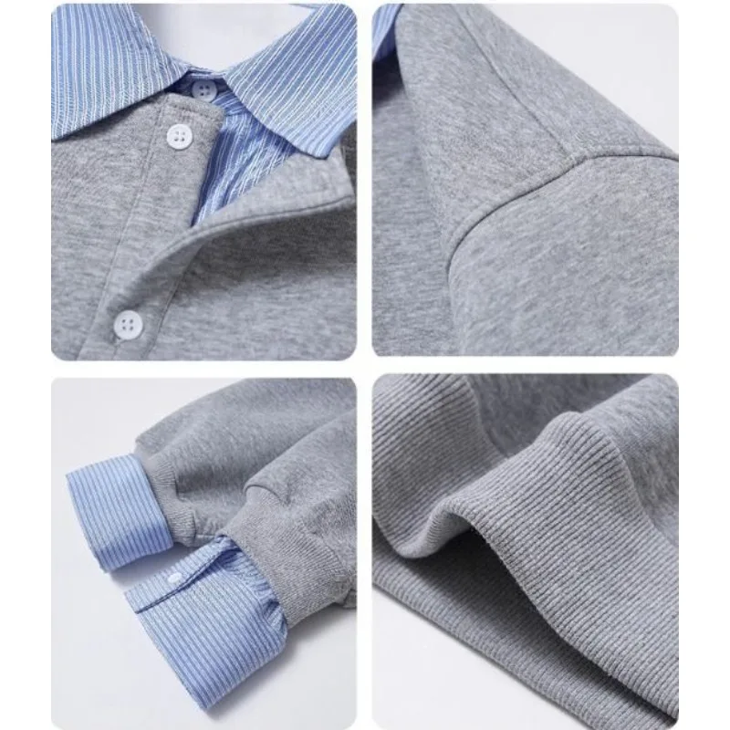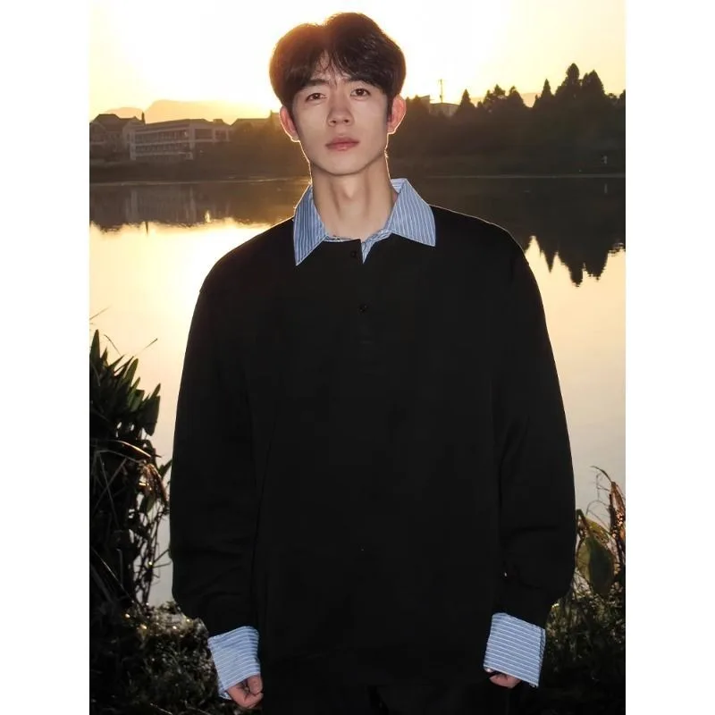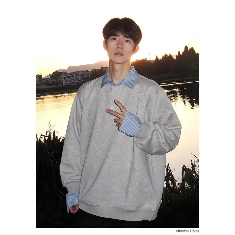 AIDASE  -  Fake Two-piece Spliced Men's Sportswear Striped Shirt Collar Top Spring Autumn Thin Male Casual Long Sleeved Sweatshirt