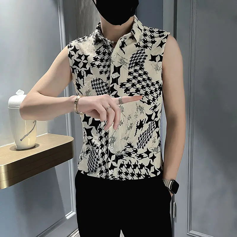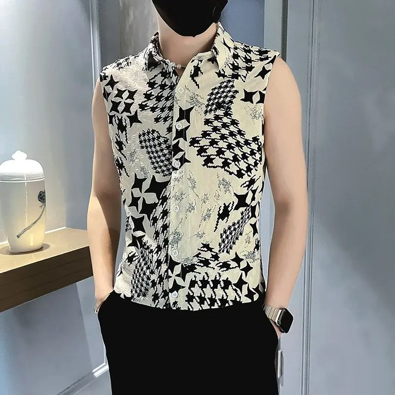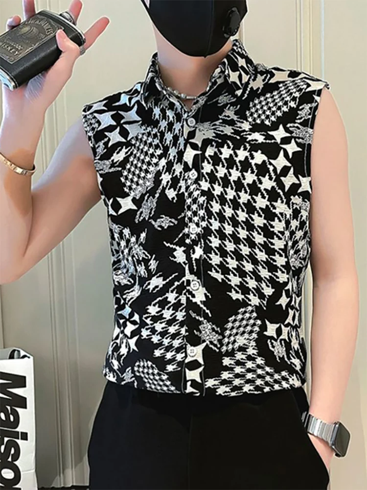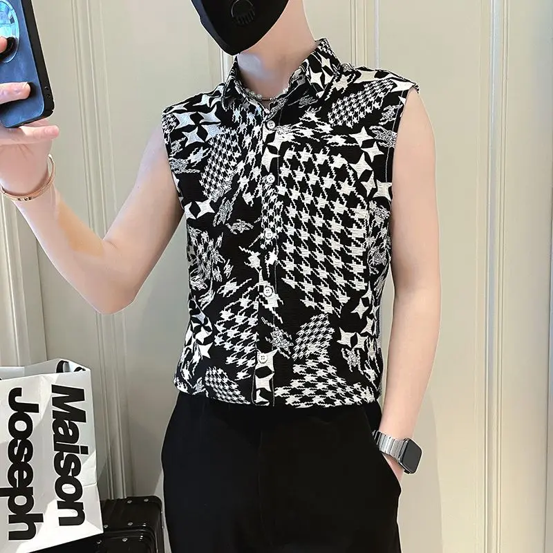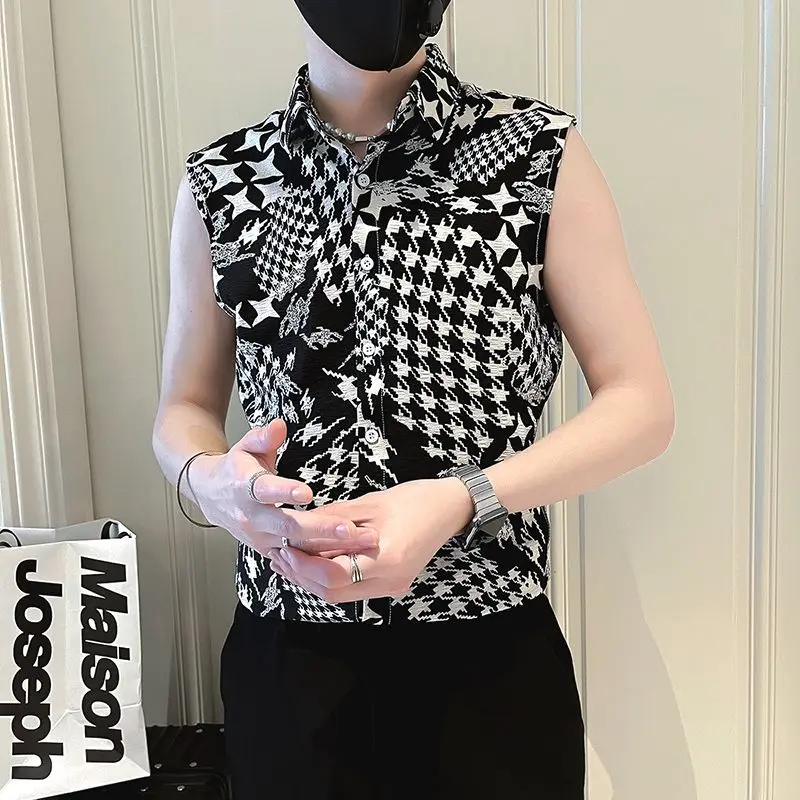 Aidase Fashion Lapel Korean Printed Houndstooth Shirts Men's Clothing 2025 Summer New Loose Casual Tops All-match Sleeveless Shirts