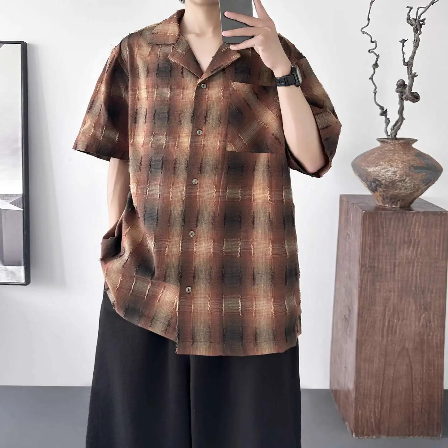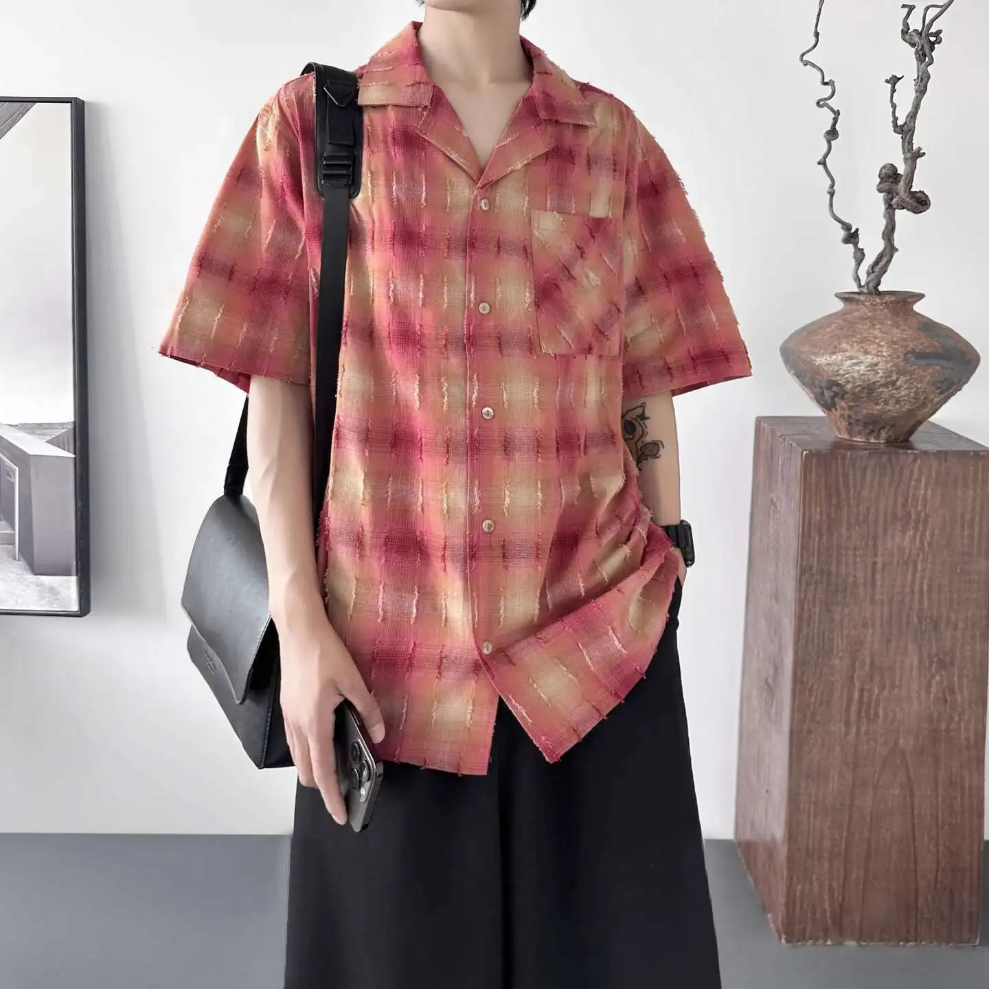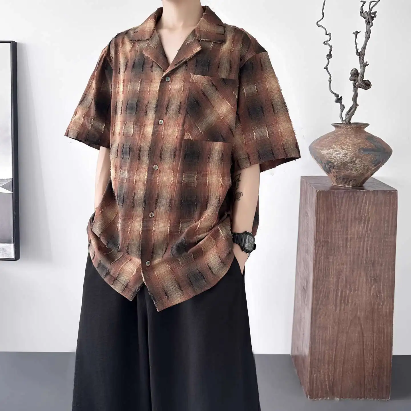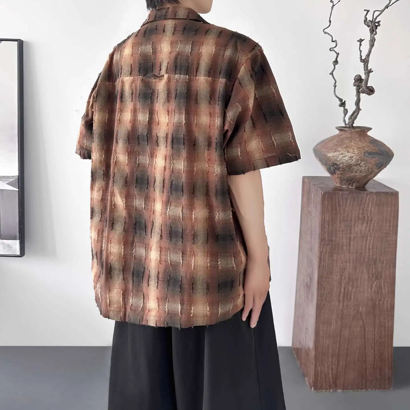 AIDASE - Fashion Men's Plaid Shirt 2025 Summer New Frayed Edges Design Lapel Short Sleeve Single Breasted Casual Loose Tops 21E6529