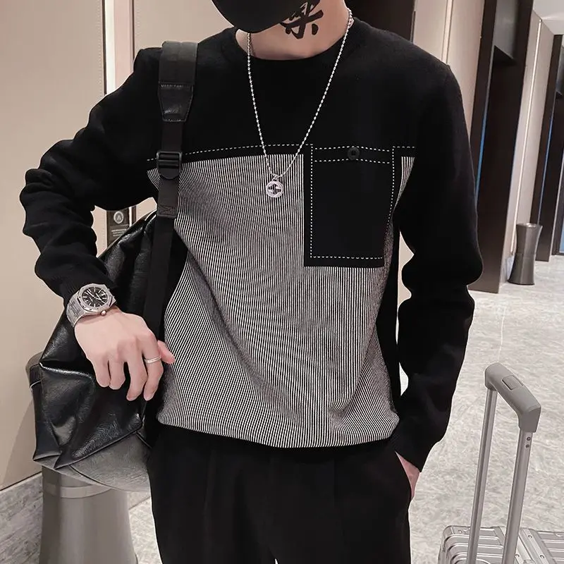 Aidase Fashion Printed Button Spliced Pockets Striped T-Shirt Men's Clothing Autumn New Oversized Casual Pullovers Loose Tee Shirt