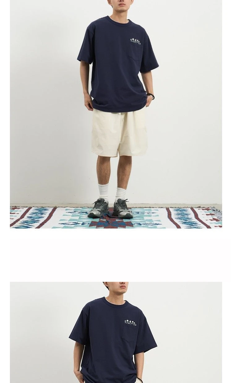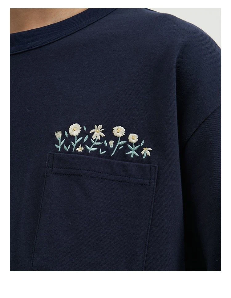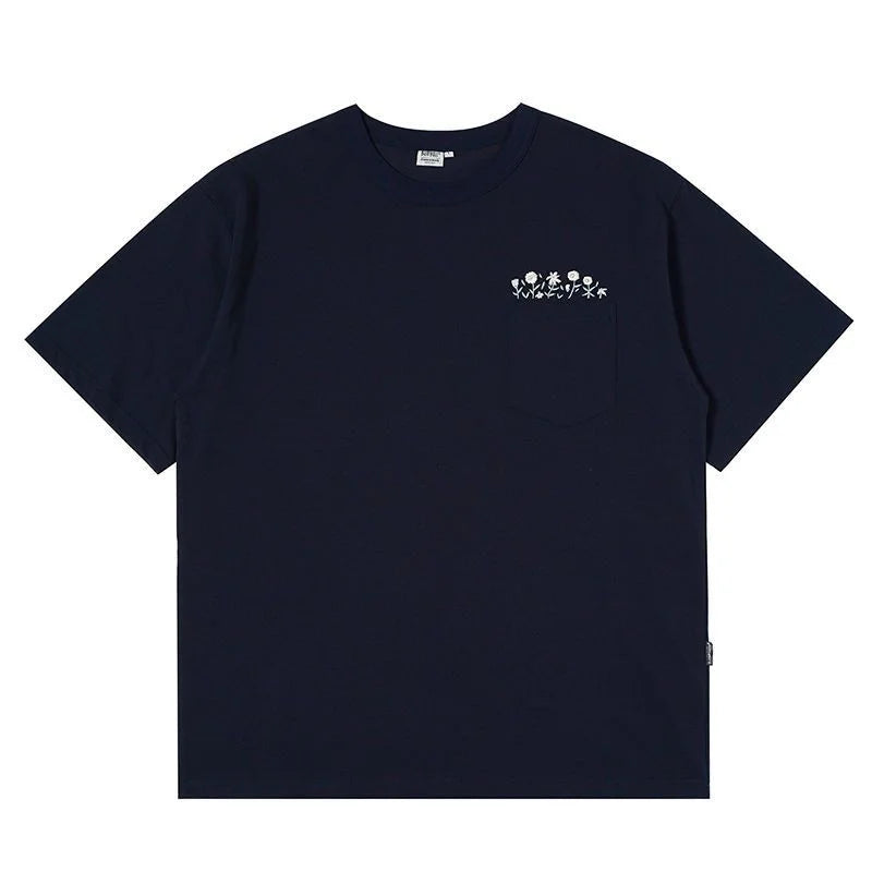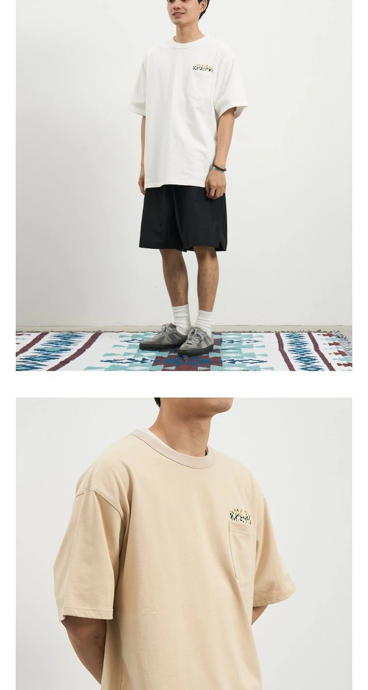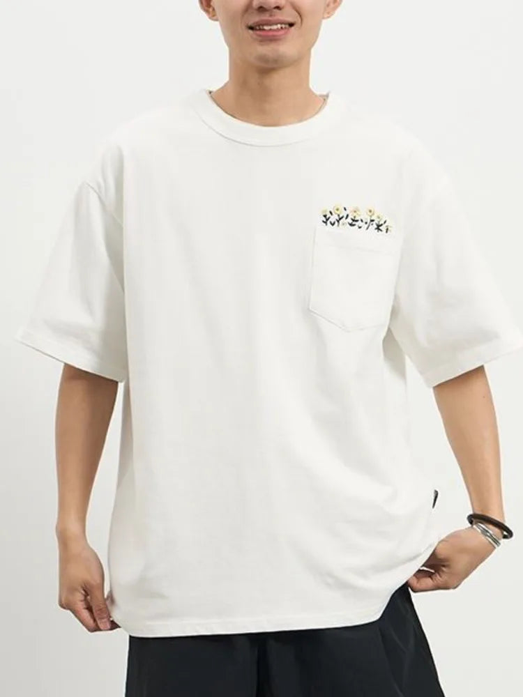 Aidase Flower Embroidered Short Sleeve Cotton T-shirt High Quality Round Neck Pocket Solid T-shirt Men Japanese Streetwear Tee Top