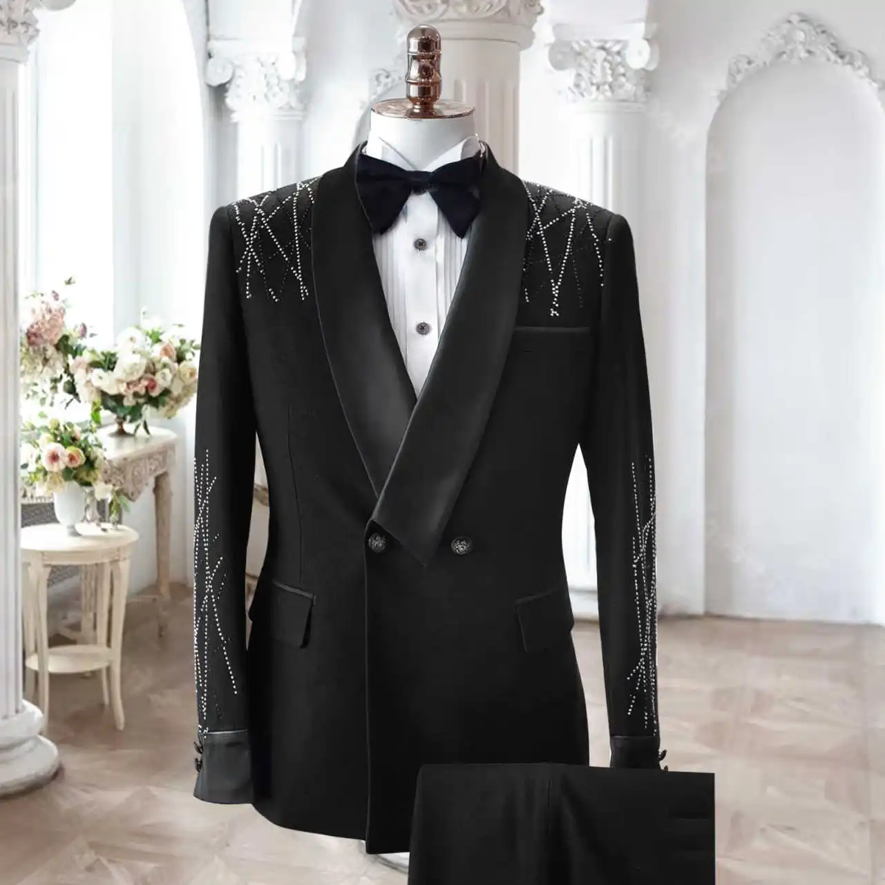 AIDASE  -  Formal Suits Men For Wedding Double Breasted Silk Shawl Lapel 2 Pieces Groom Tuxedos Tailored Beads Male Clothing
