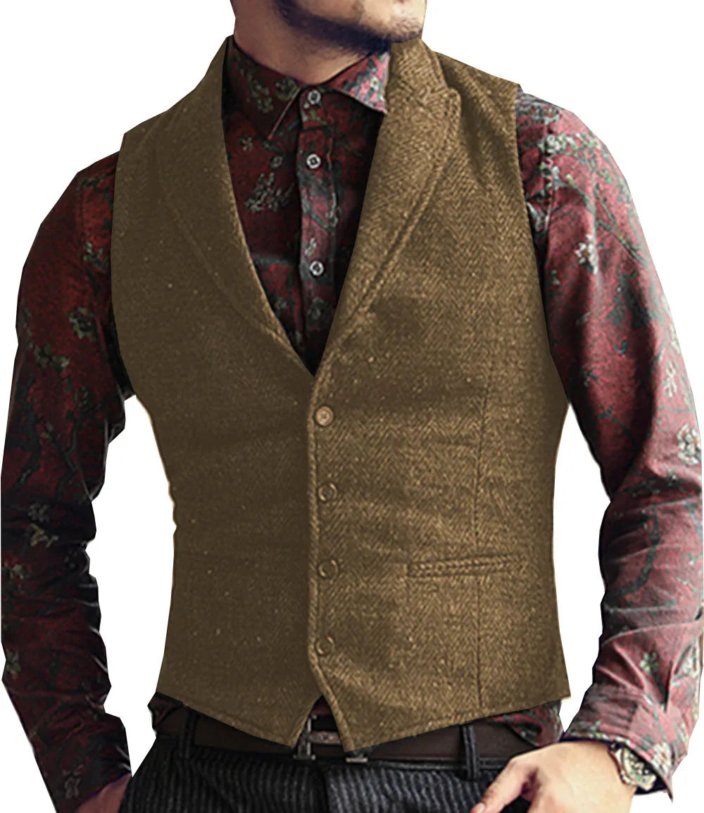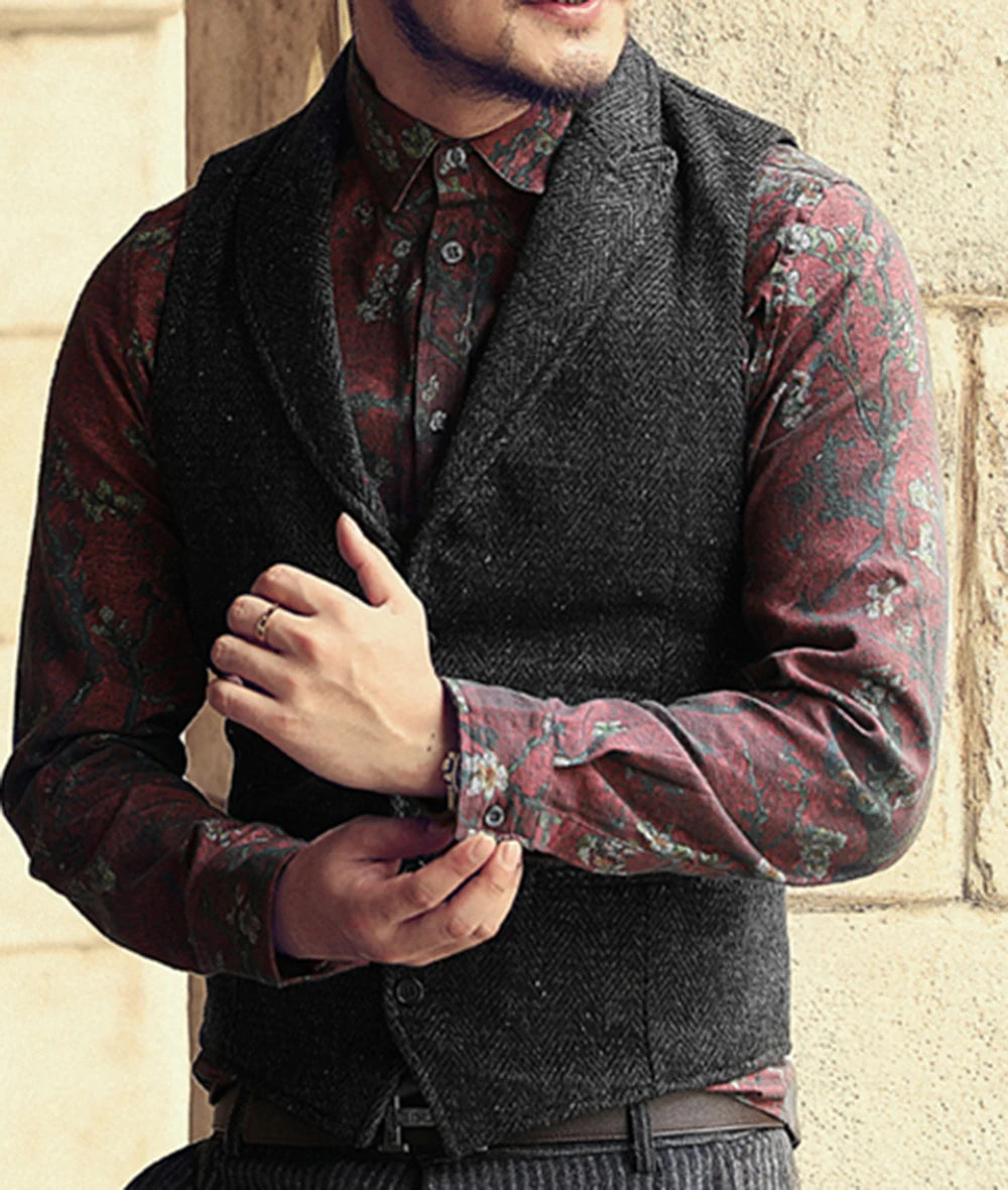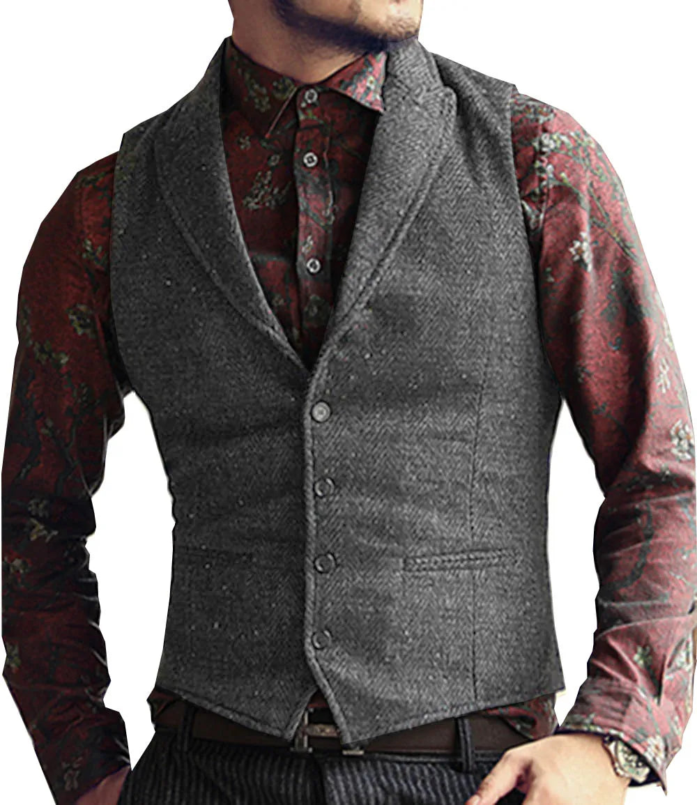 Grey Herringbone Men's Vests Lapel V Neck Wool Casual Formal Business Vest Slim Fit Gilet Waistcoat Groomman