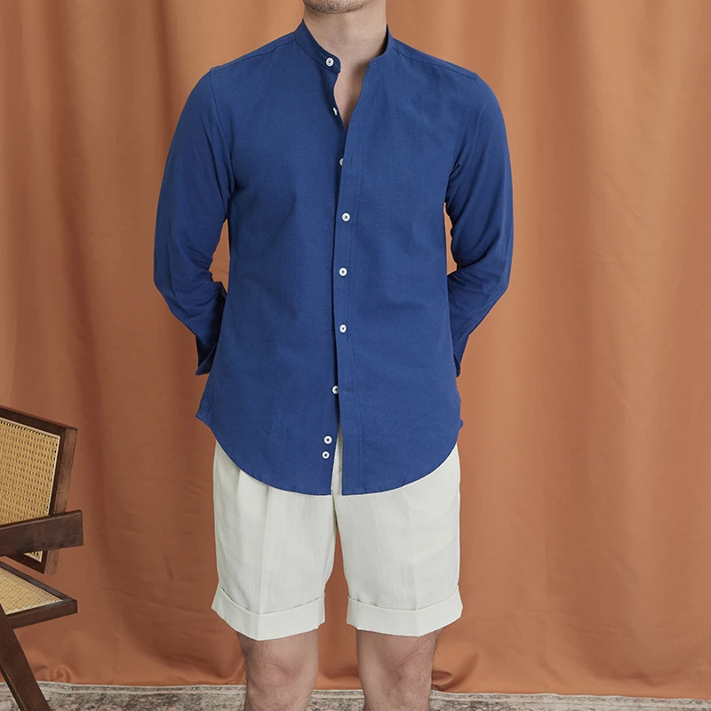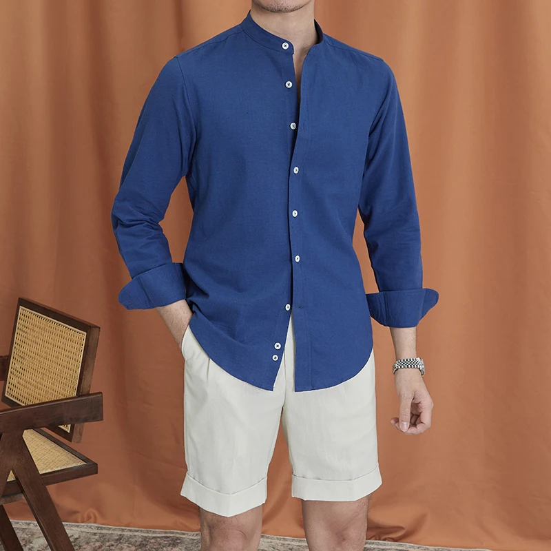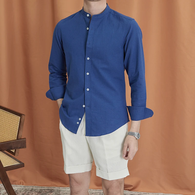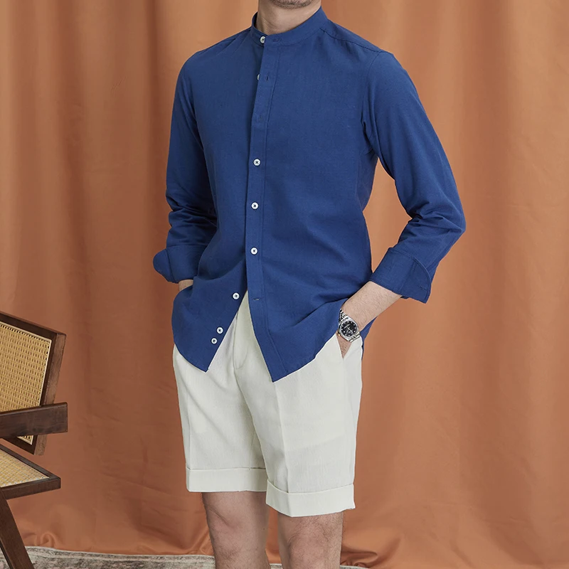 High Quality Cotton Linen Stand Collar Shirt Men Long Sleeve Blue Green White Breathable Shirt Business British Solid DressTop