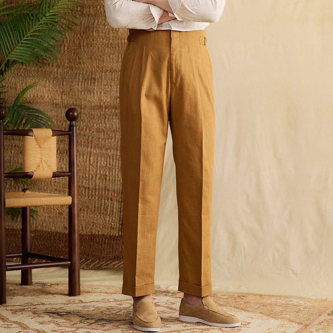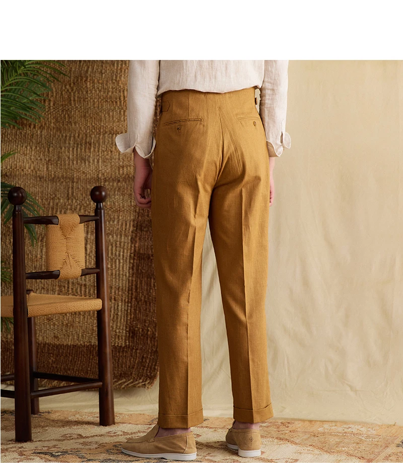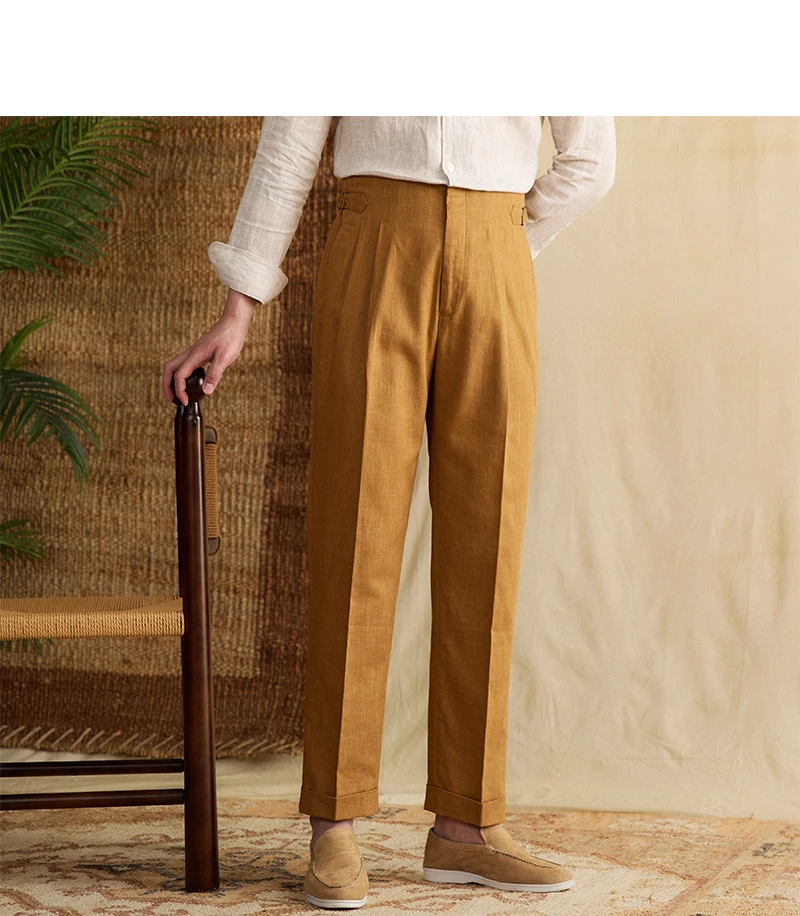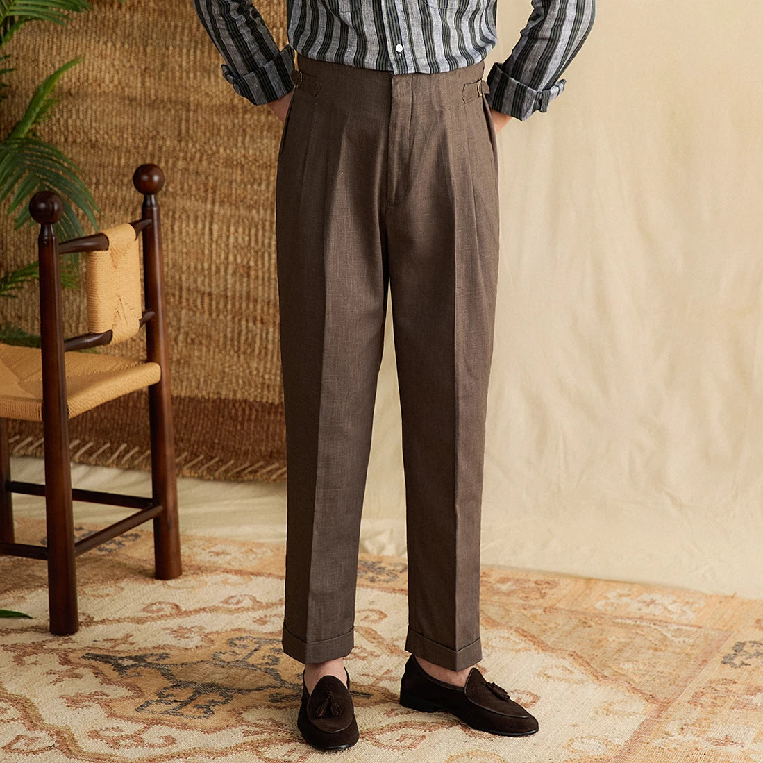 High Quality Linen Cotton Naples Straight Leg Pant Linen Breathable Adjustable Buckle Italian Men Formal Pant Pantalones Hombre