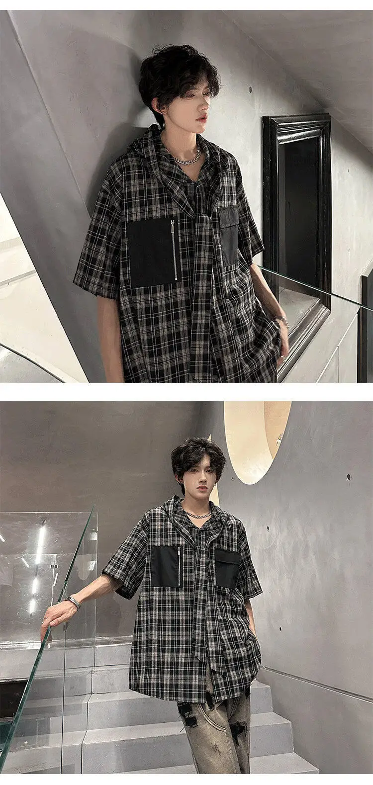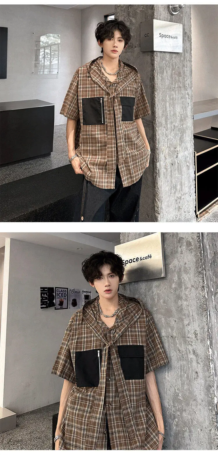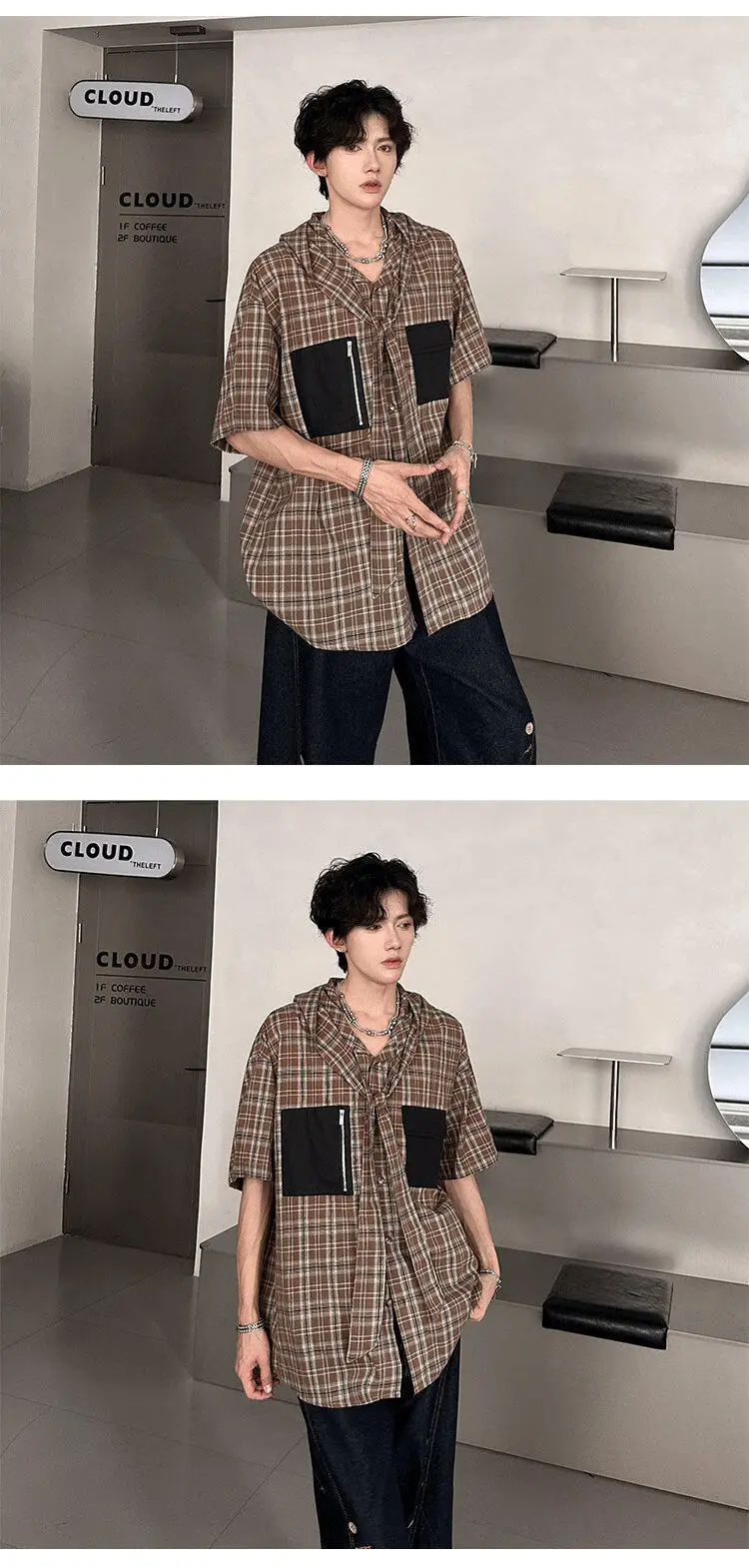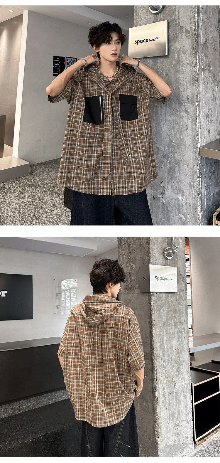 AIDASE - Hooded Lace-up Men's Plaid Shirt Pocket Spliced Contrast Color Design Trendy Men Casual Tops Niche Fashion Clothes