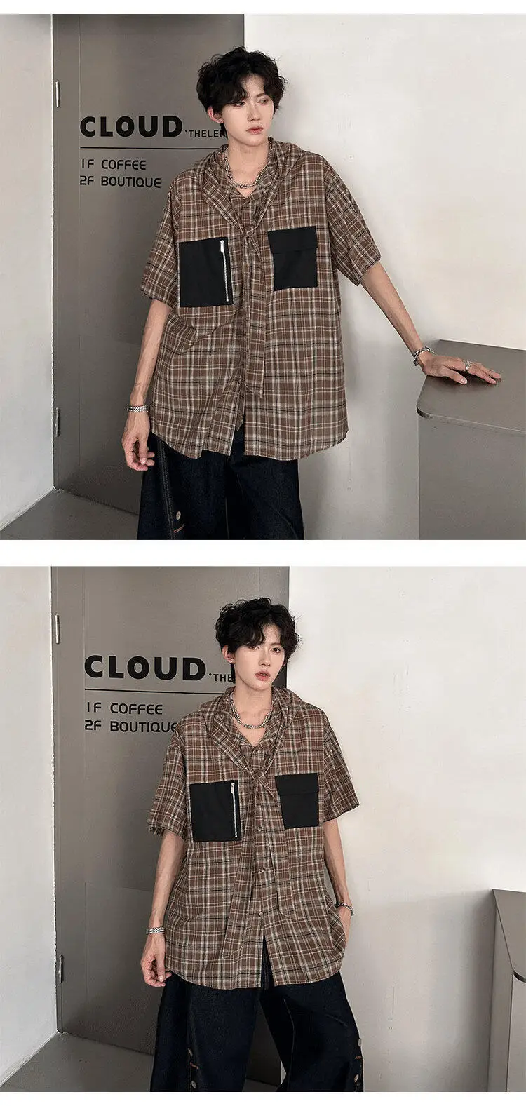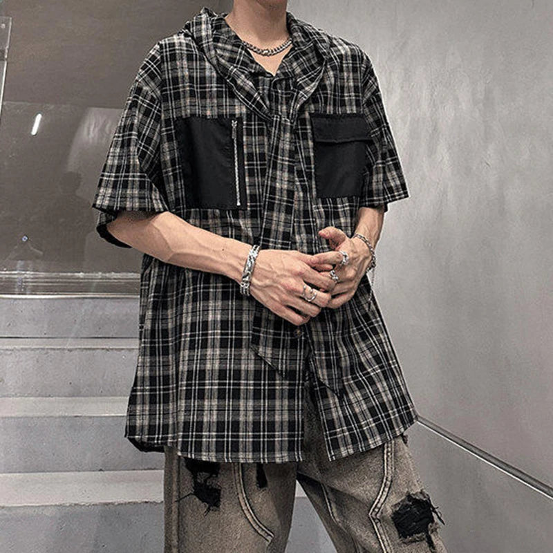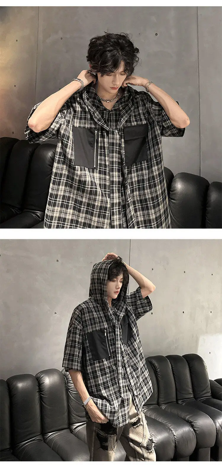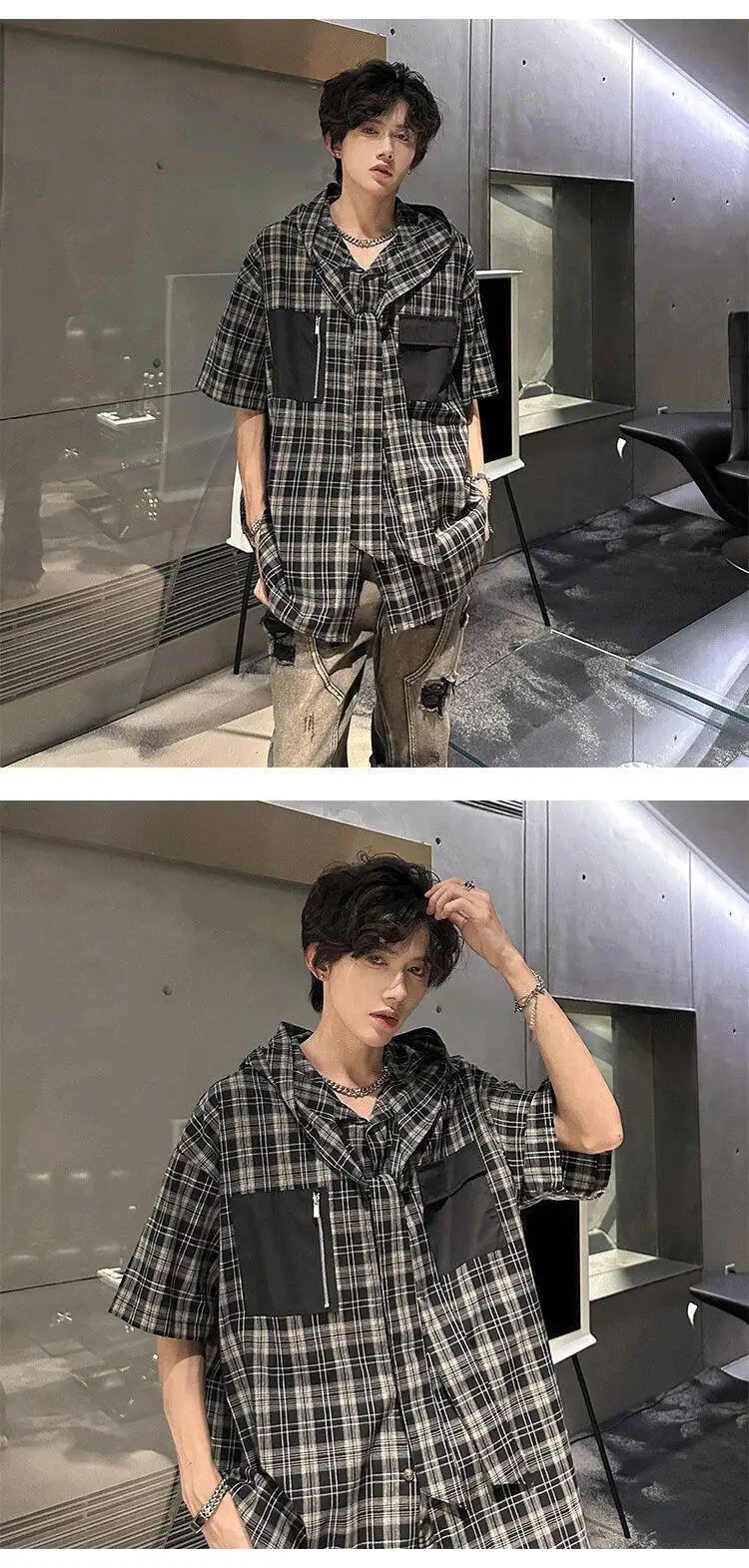 AIDASE - Hooded Lace-up Men's Plaid Shirt Pocket Spliced Contrast Color Design Trendy Men Casual Tops Niche Fashion Clothes