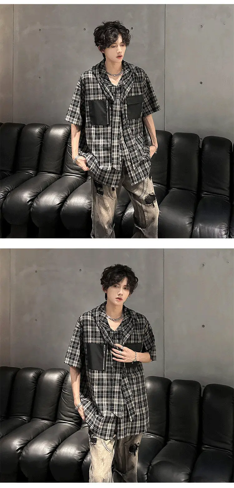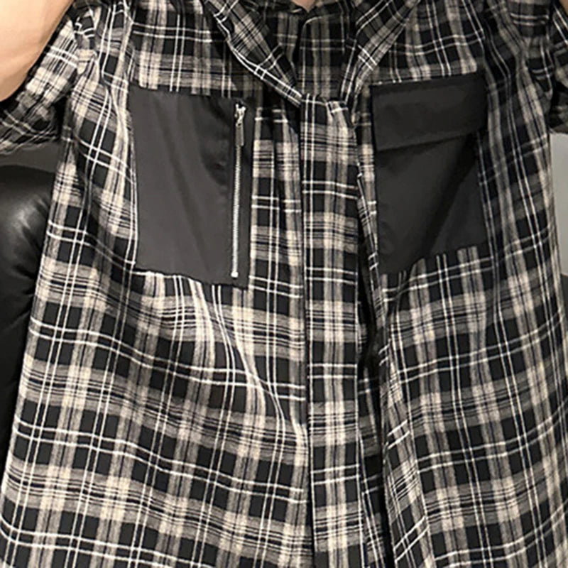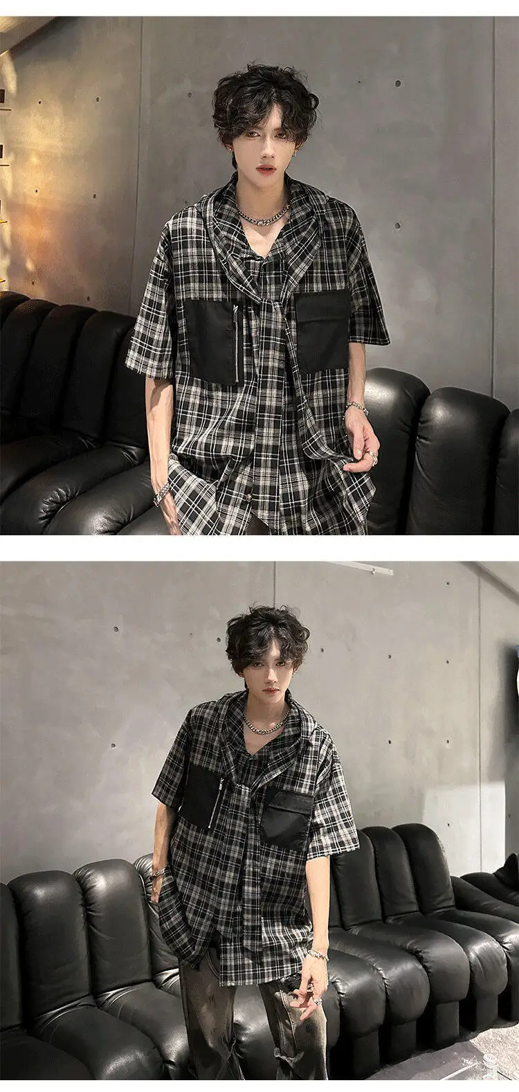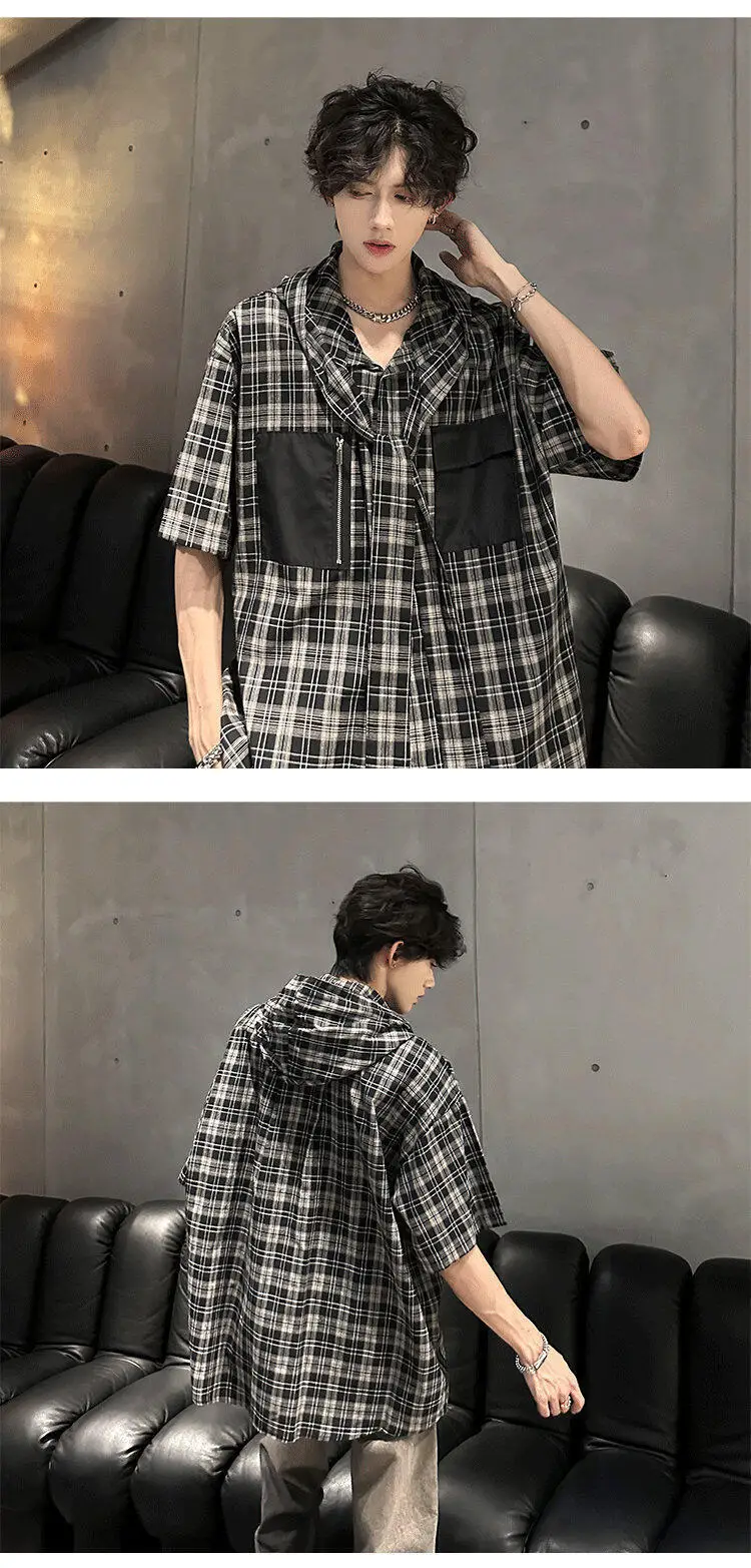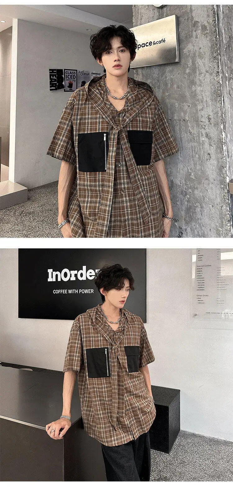 AIDASE - Hooded Lace-up Men's Plaid Shirt Pocket Spliced Contrast Color Design Trendy Men Casual Tops Niche Fashion Clothes