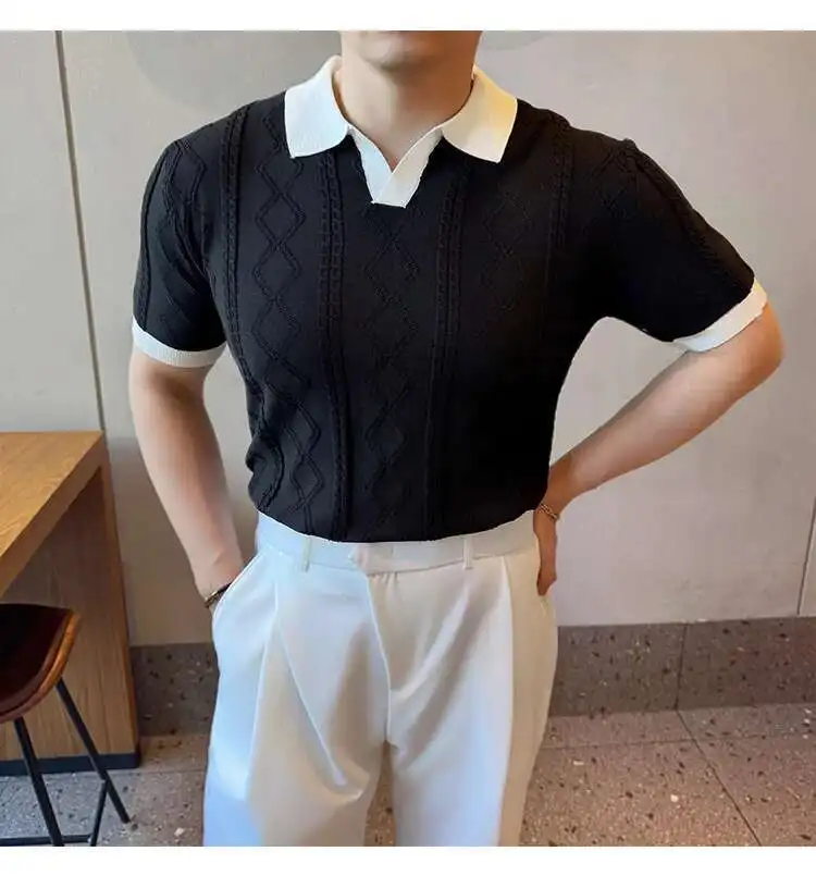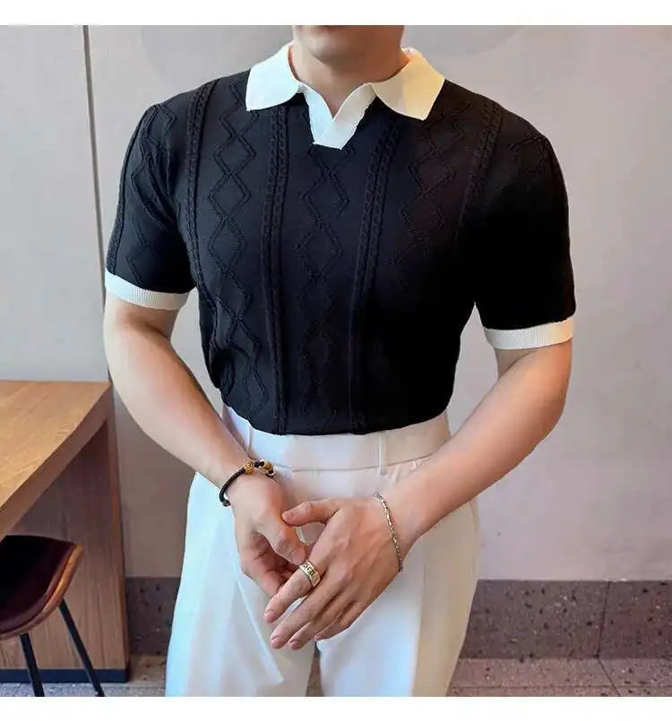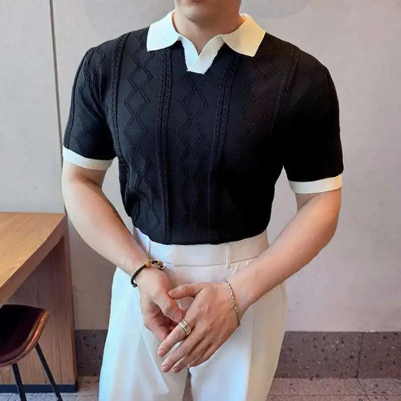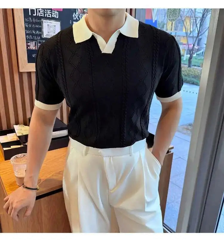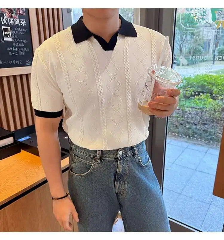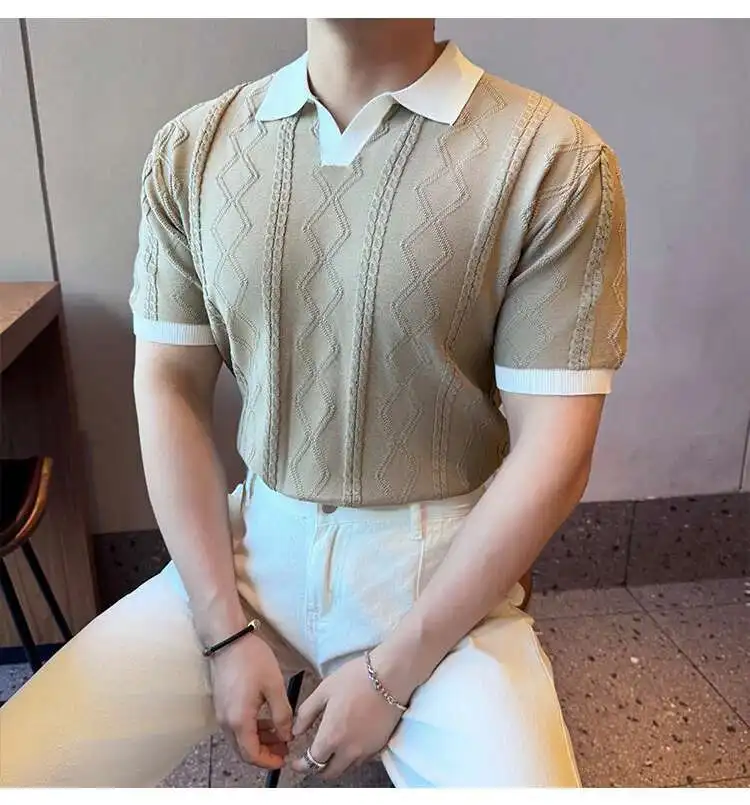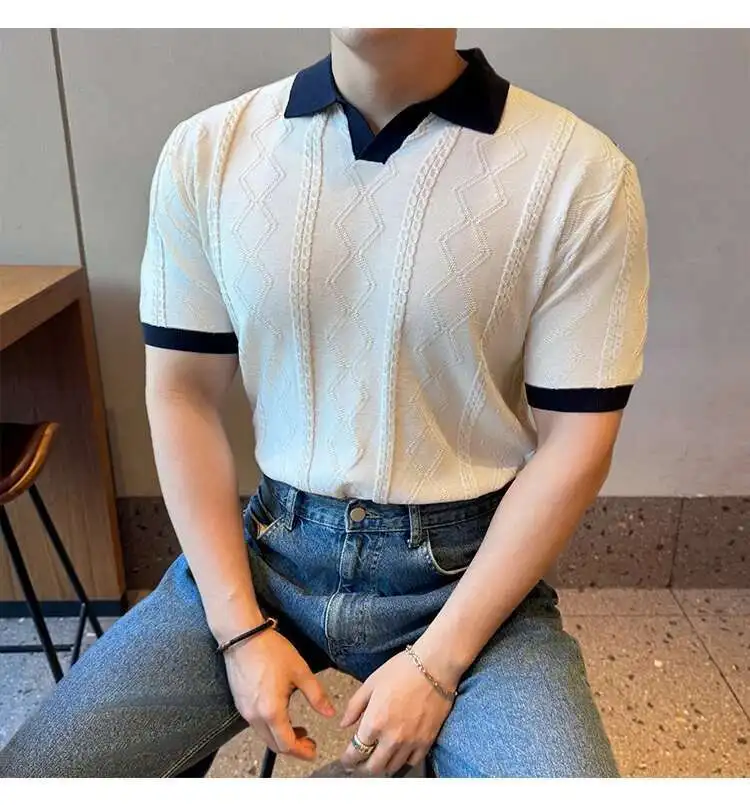AIDASE  -  Images Simple Striped Ice Silk Elastic Jacquard Turn-down Collar Short Sleeved T-shirt 2025 Contrast Color Male Tops