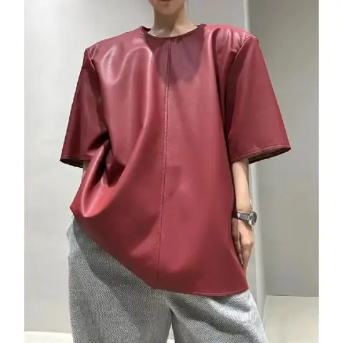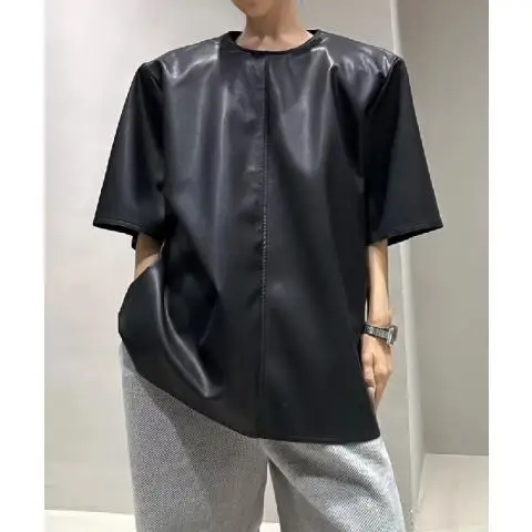 Aidase Large Size Leather Shirt Spring PU Leather Jacket High-end Feeling Short Sleeved Top Temperament Loose Fit Unisex Grunge Tees