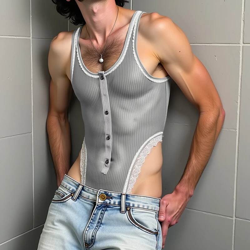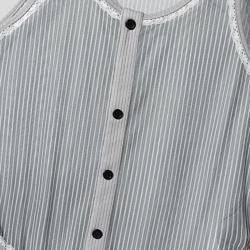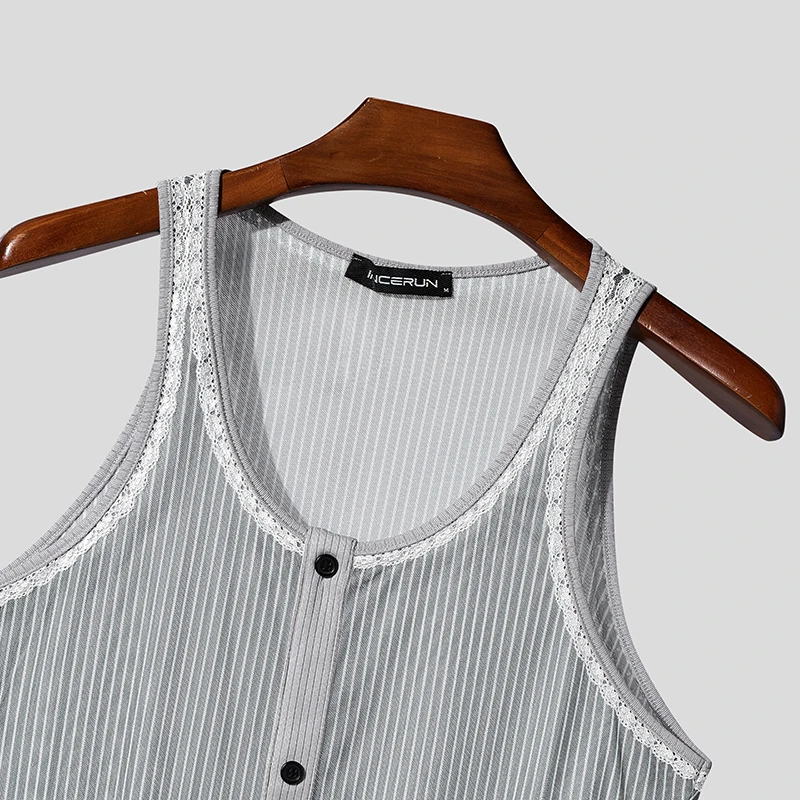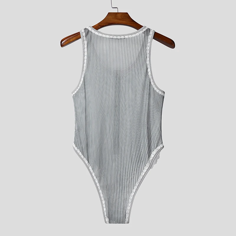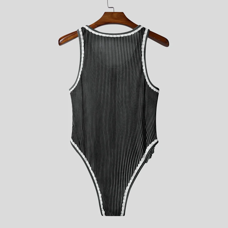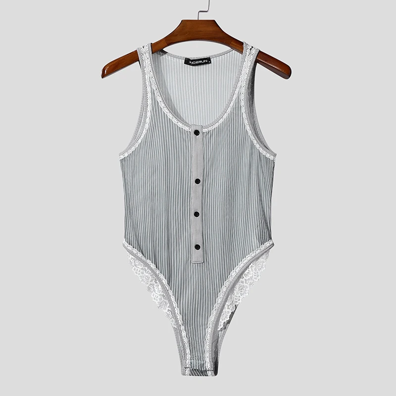 AIDASE - Men Bodysuits Lace Striped Patchwork O-neck Button Sleeveless Male Rompers Sexy 2025 Skinny Fashion Cozy Bodysuit Men