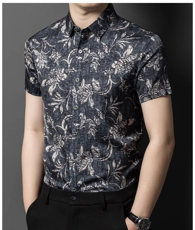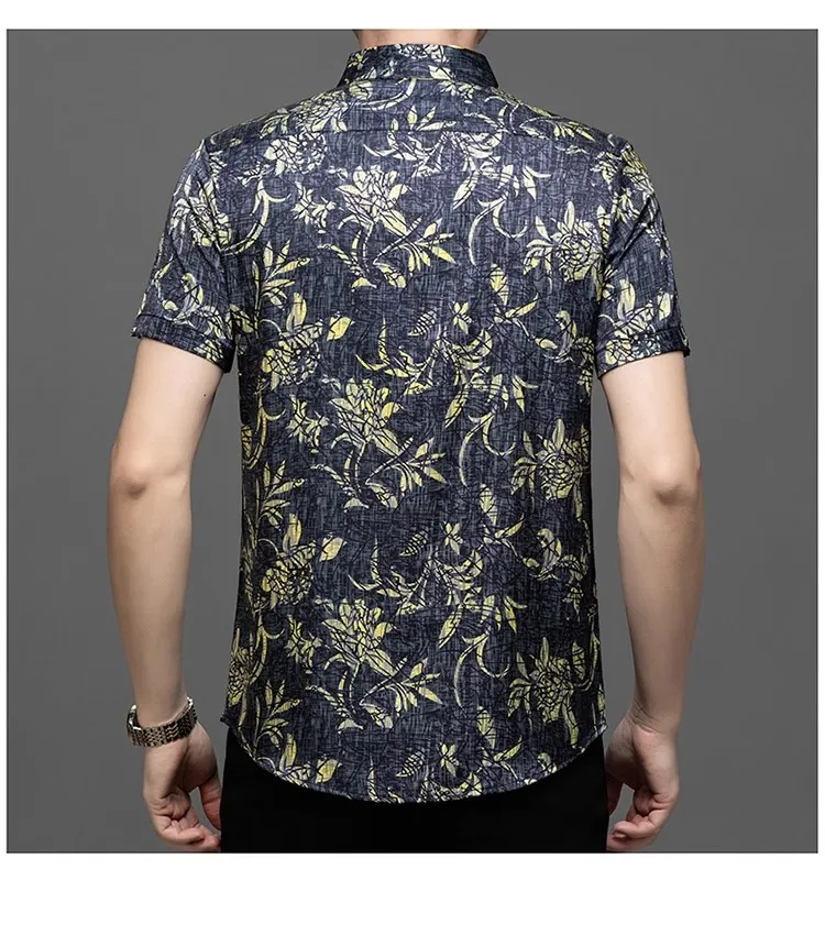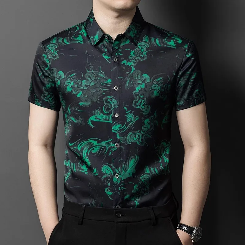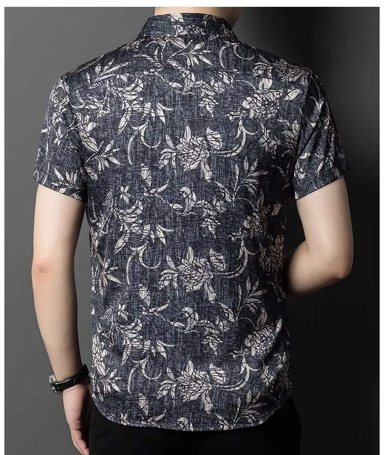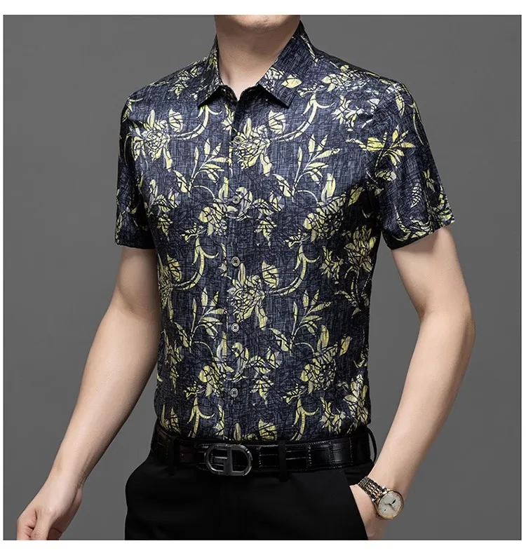 Men Floral Print Shirt Summer Silk Business Dress Shirts Short Sleeve Club Casual Flower Tops Clothing