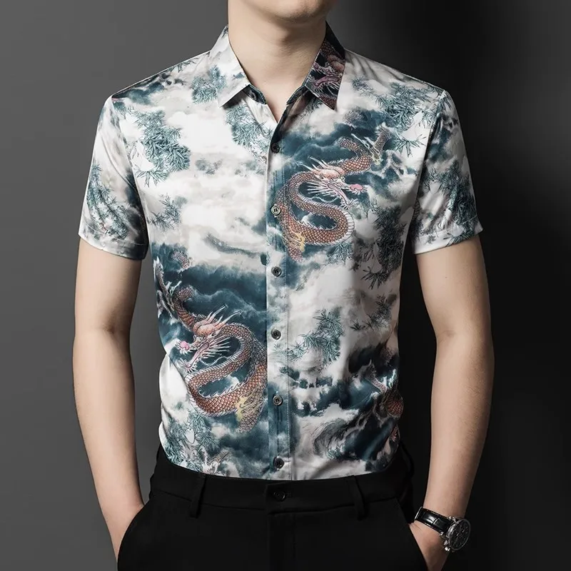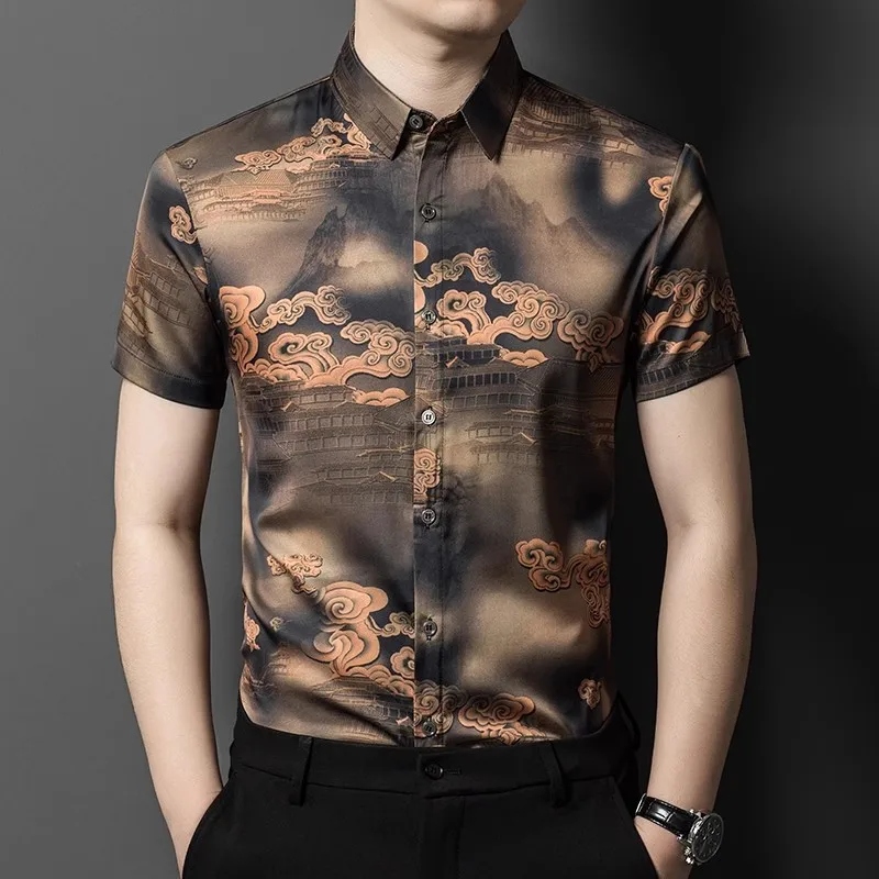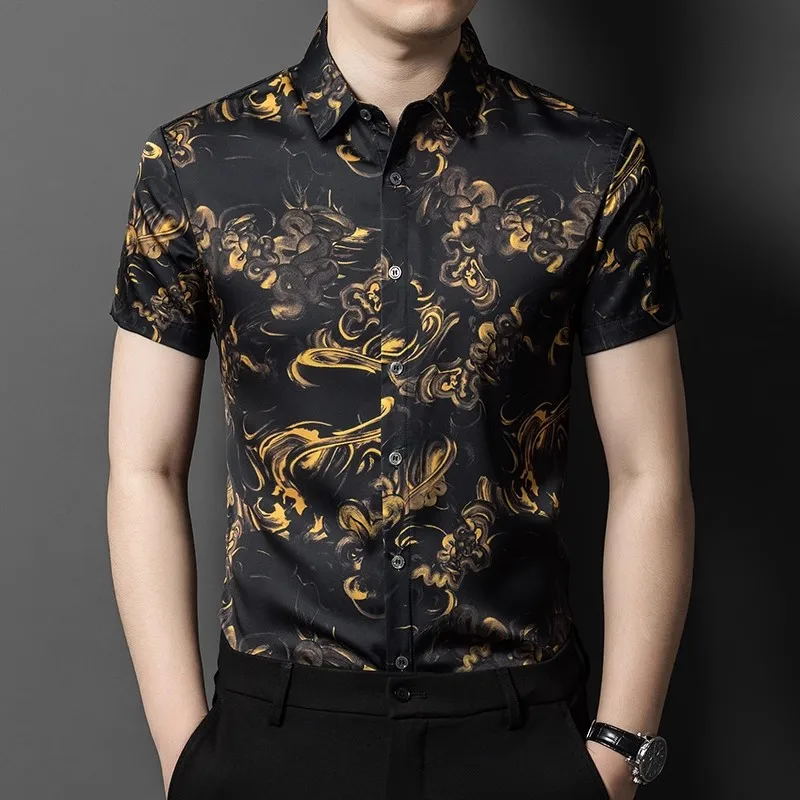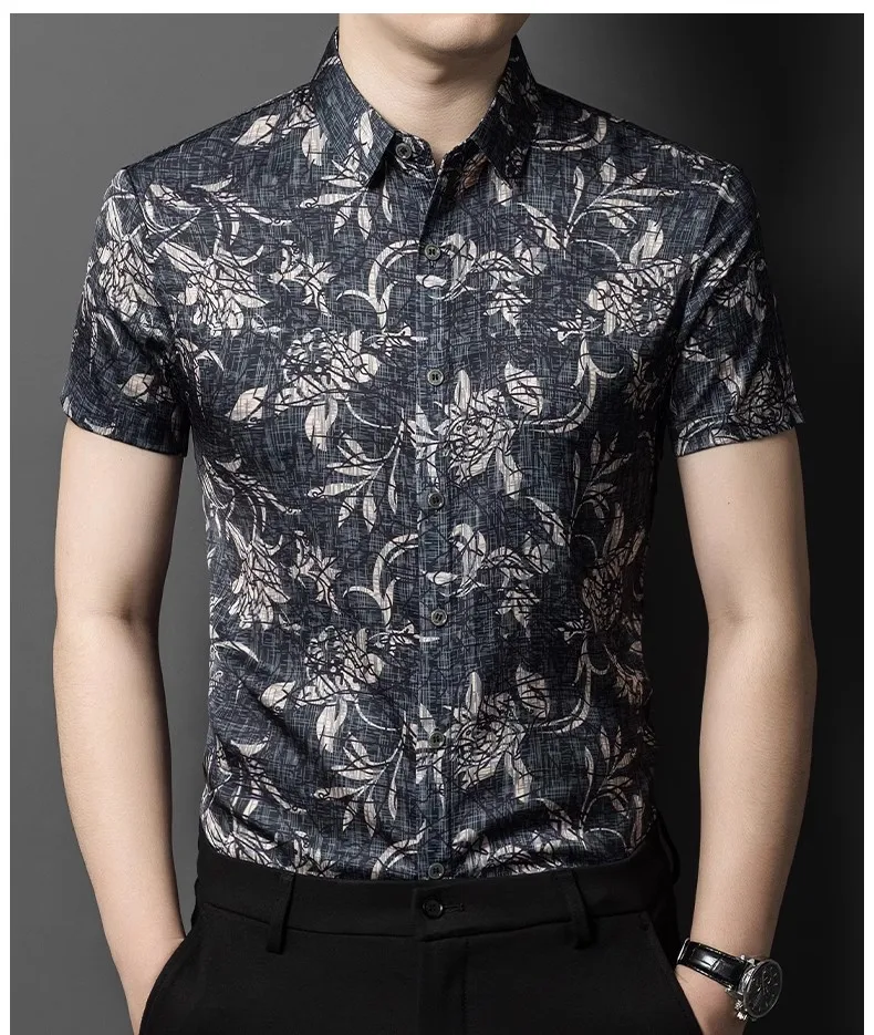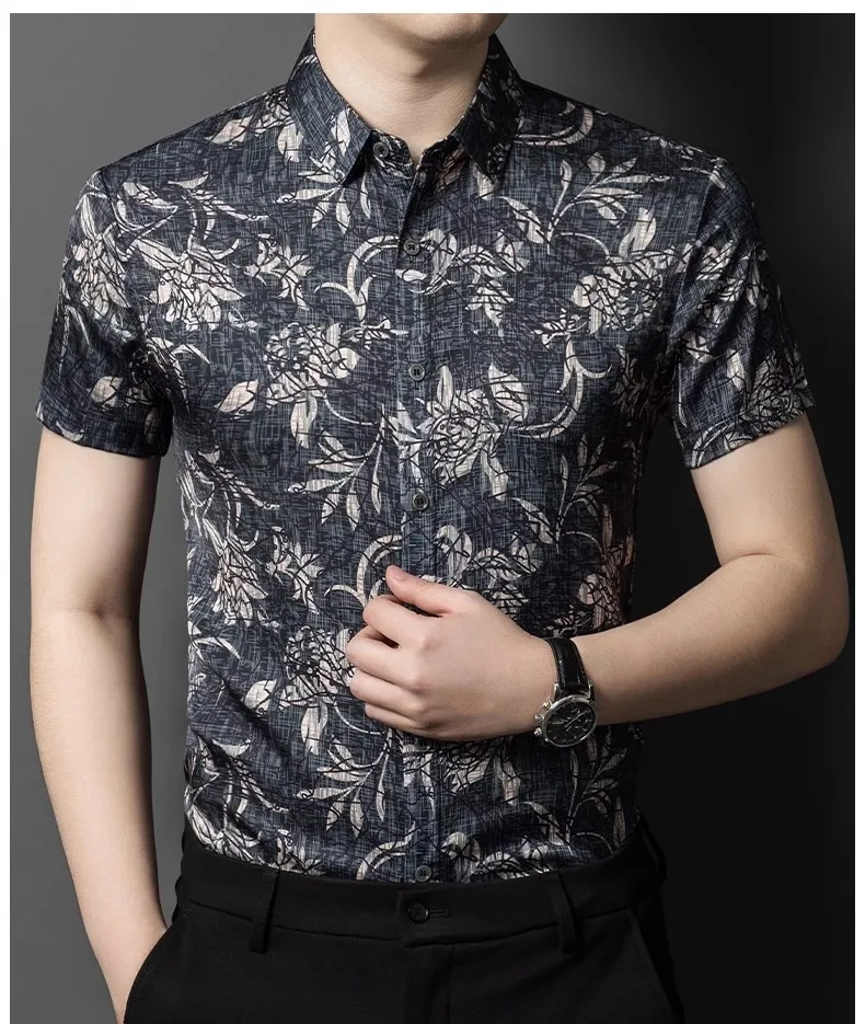 Men Floral Print Shirt Summer Silk Business Dress Shirts Short Sleeve Club Casual Flower Tops Clothing