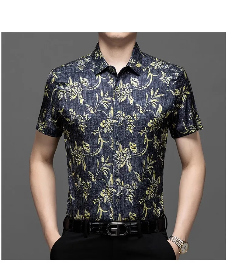 Aidase Men Floral Print Shirt Summer Silk Business Dress Shirts Short Sleeve Club Casual Flower Tops Clothing