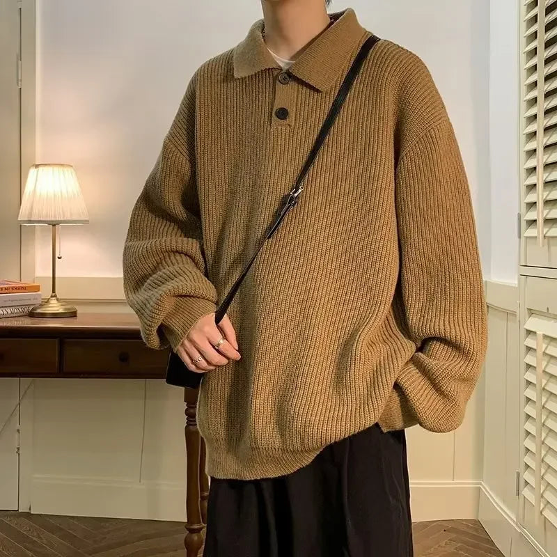 Men Japanese Style Polo Collar Button Pullover Sweater Boys Retro Apricot Brown Oversize Knit Top Long Sleeve Loose Knitwear XXL