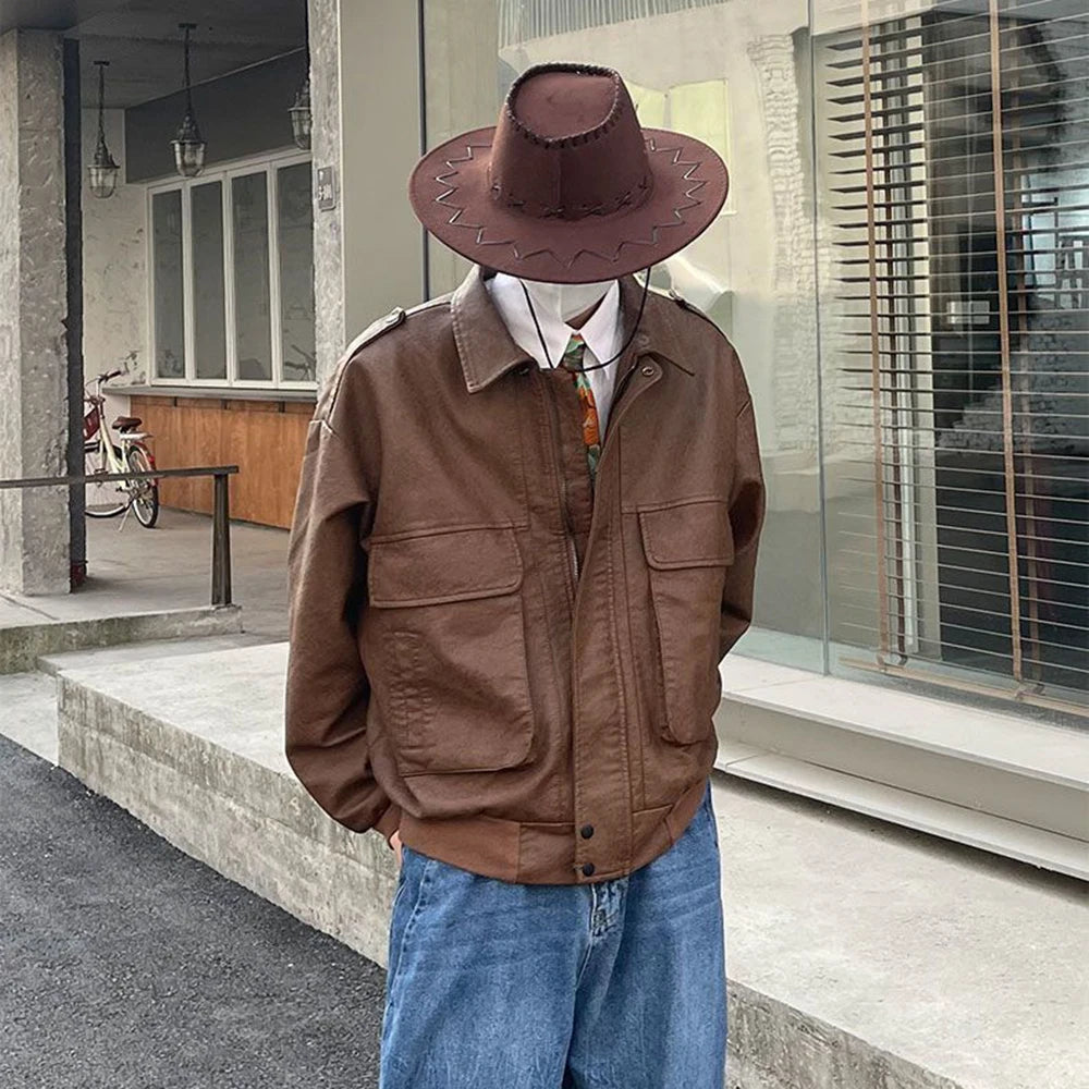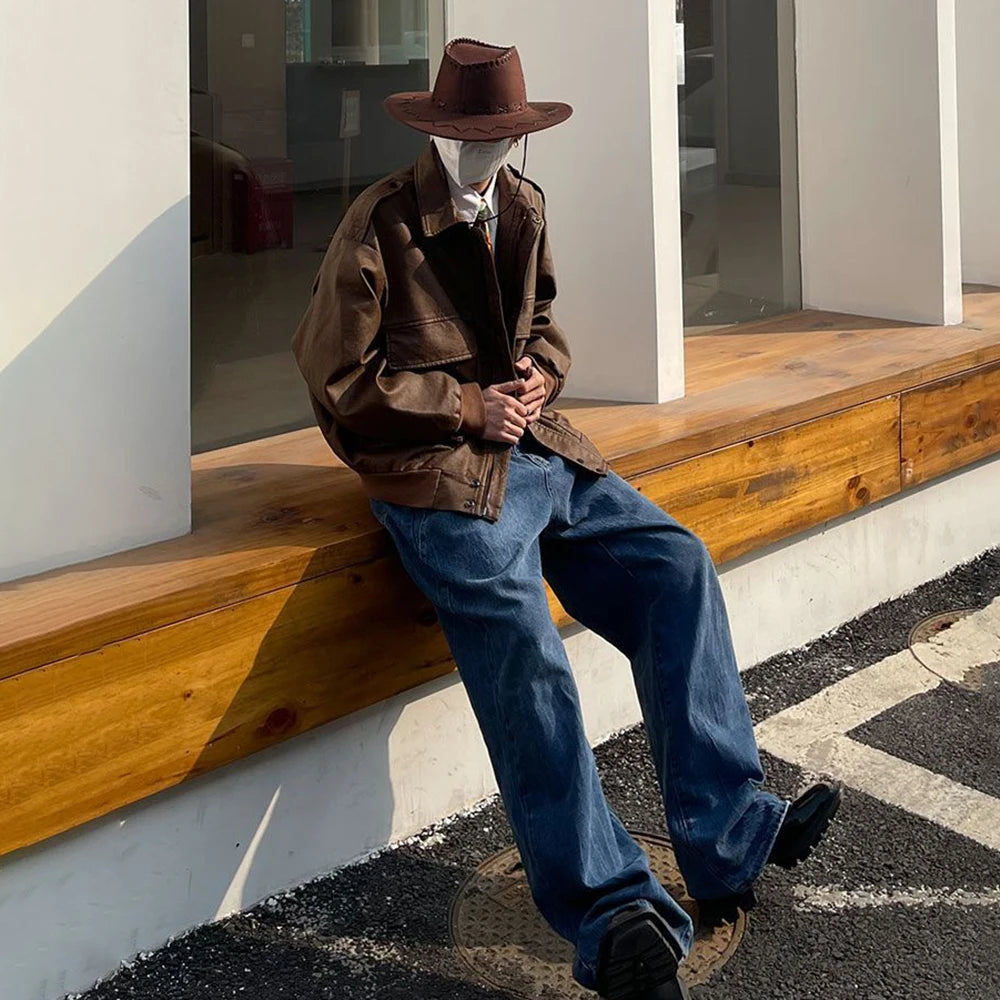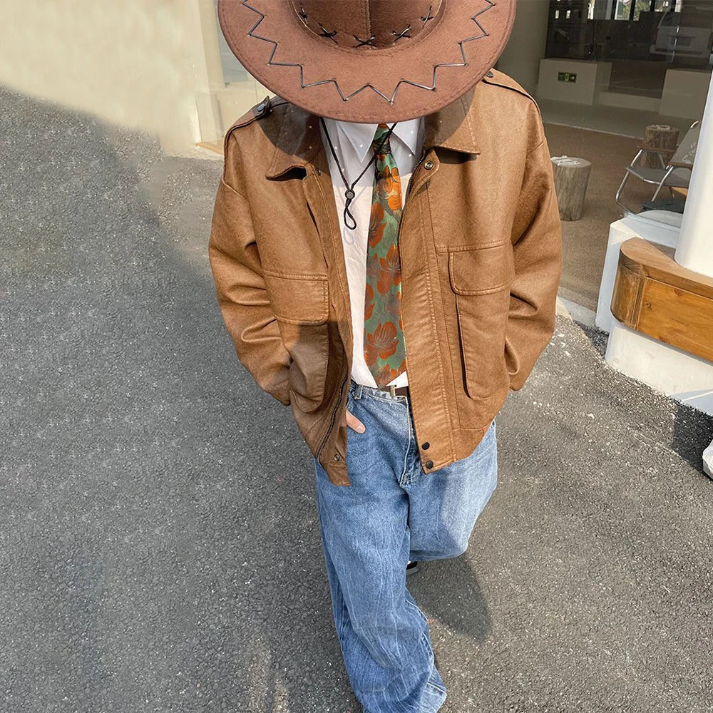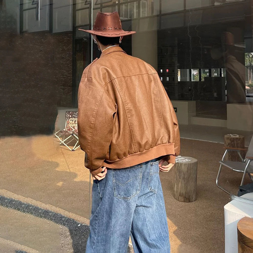 Aidase Mens Autumn Classic Retro Motorcycle Western Denim Distressed Pu Leather Jacket Korean Style Trendy Casual Jacket Unisex