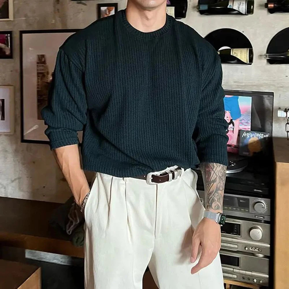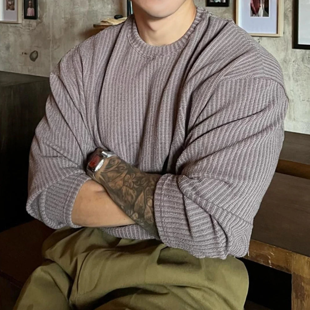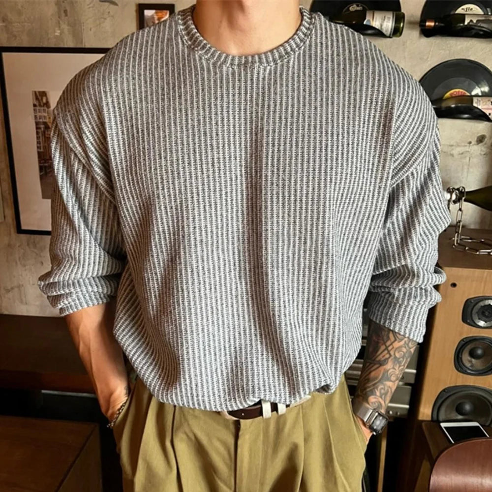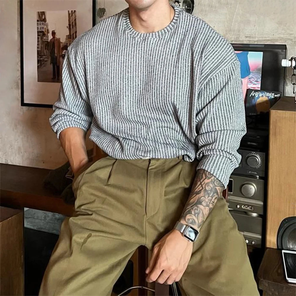 Aidase Mens Autumn Winter New Textured Vertical Striped Knitted T-Shirt Gender-Neutral Loose Casual Simple Long-Sleeved Top Unisex