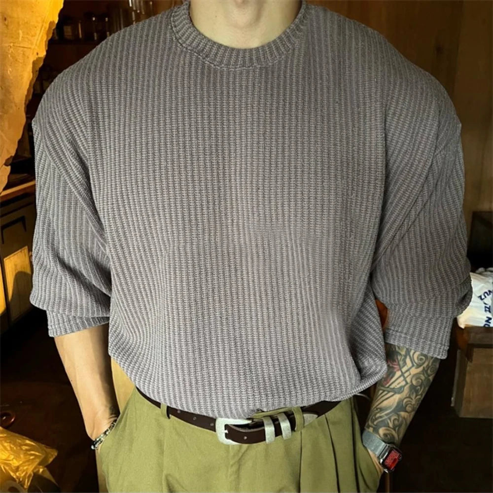Mens Autumn Winter New Textured Vertical Striped Knitted T-Shirt Gender-Neutral Loose Casual Simple Long-Sleeved Top Unisex