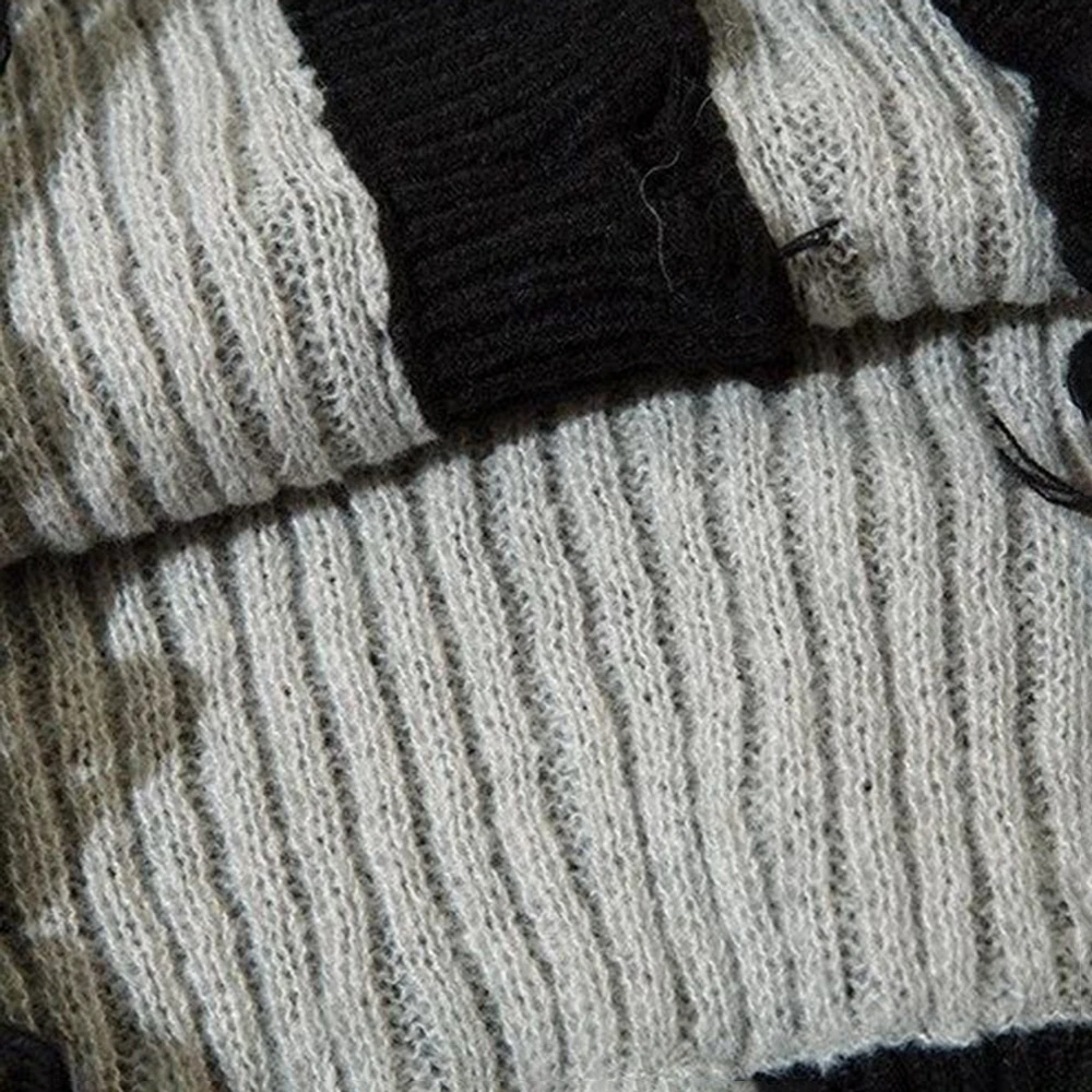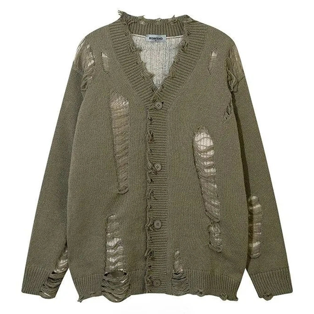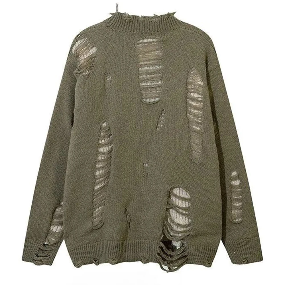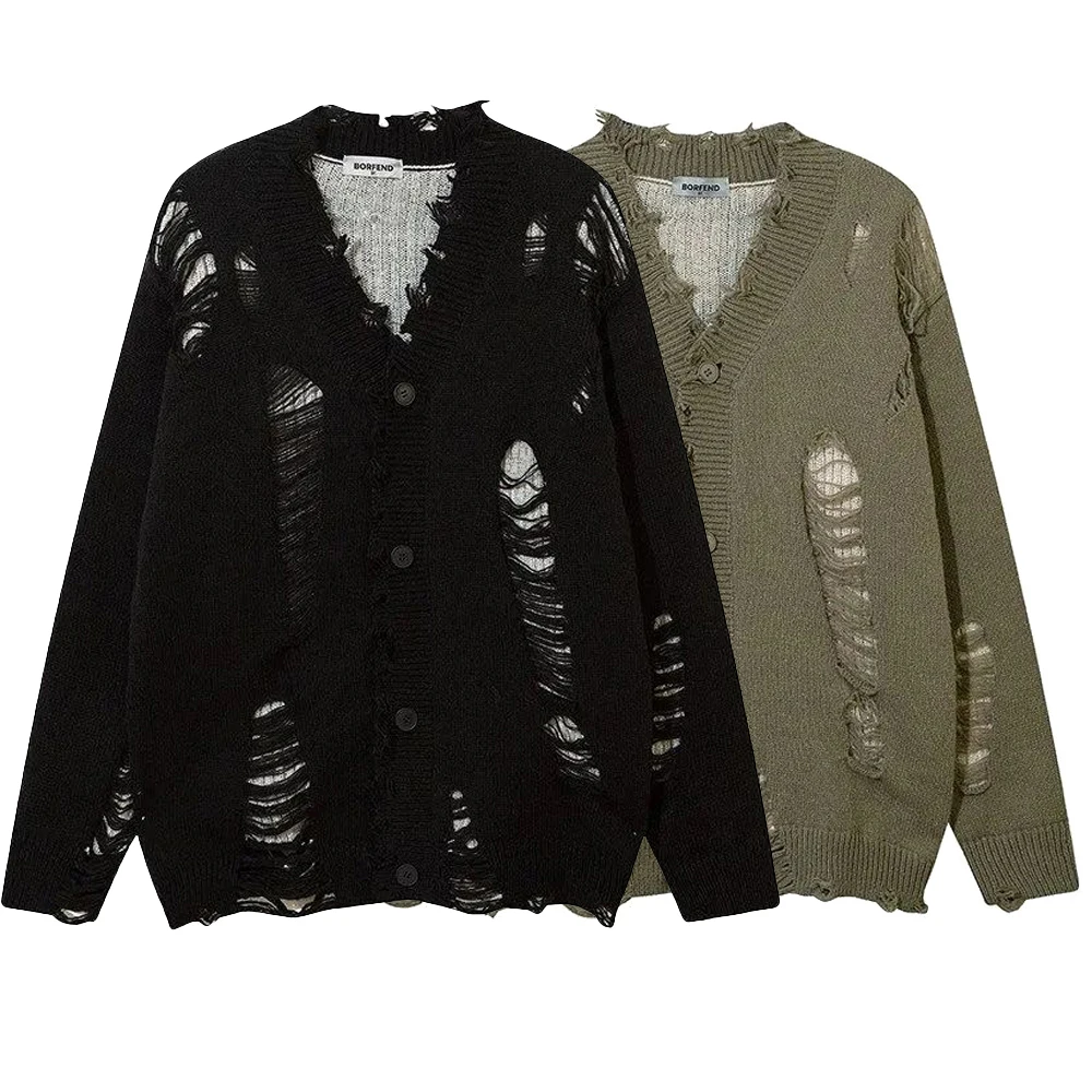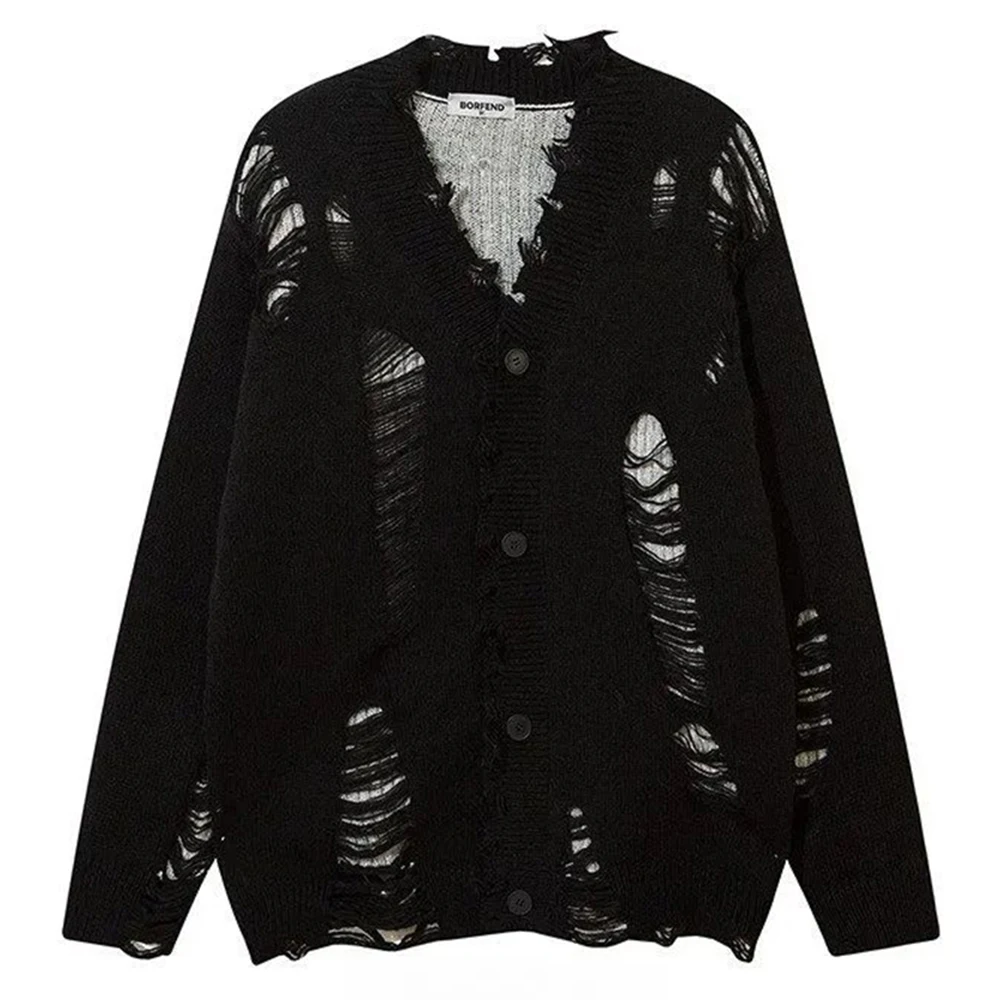 Aidase Mens Autumn Winter Ripped Sexy Cardigan Knitted Sweater Essential Hollow American High Street Loose Knitted Jacket For Couples