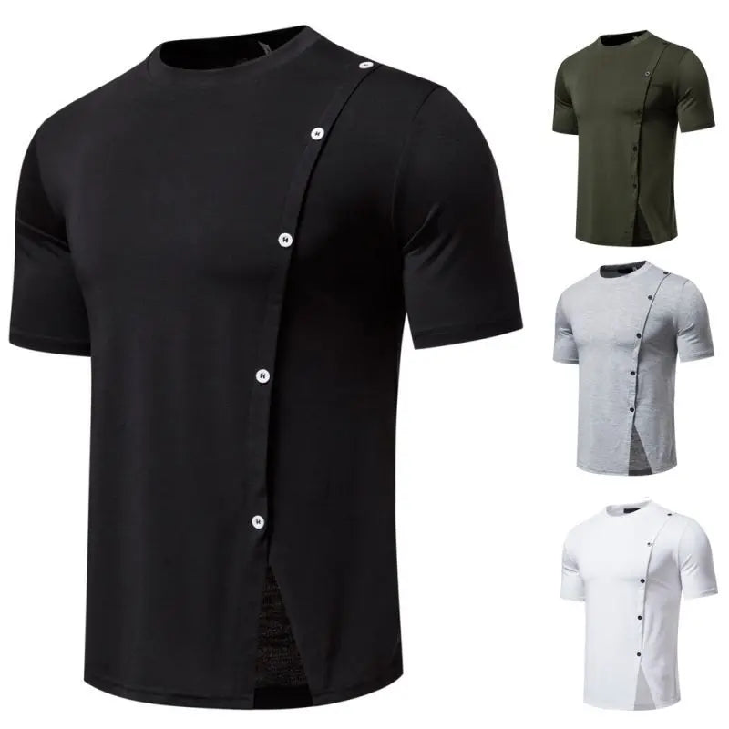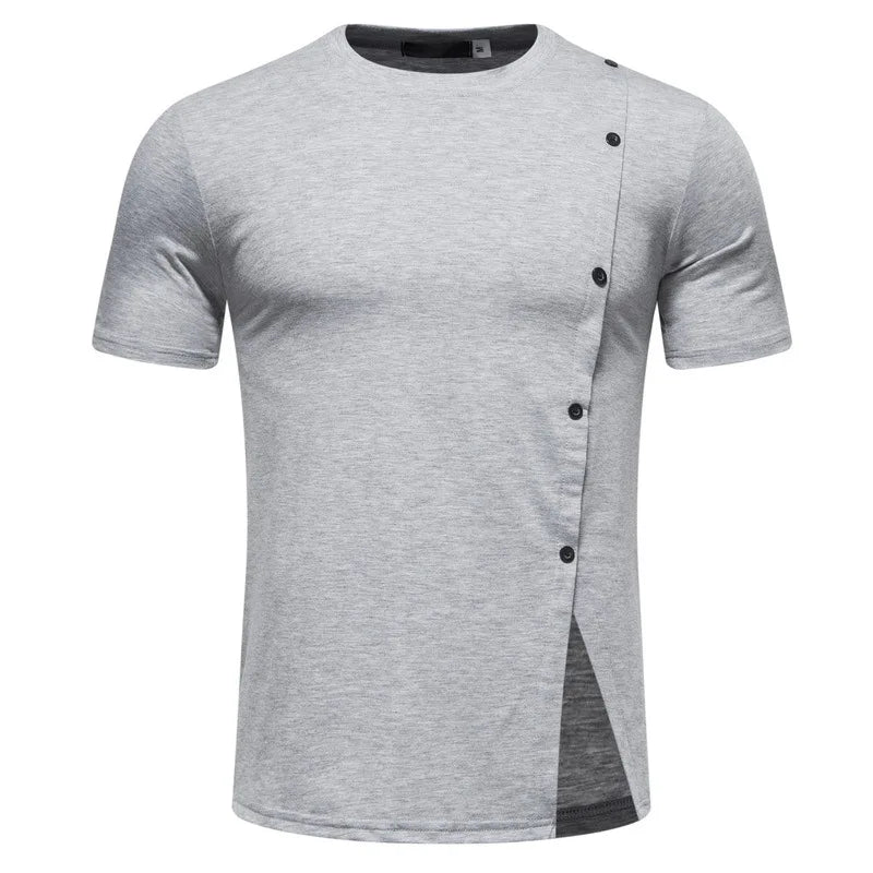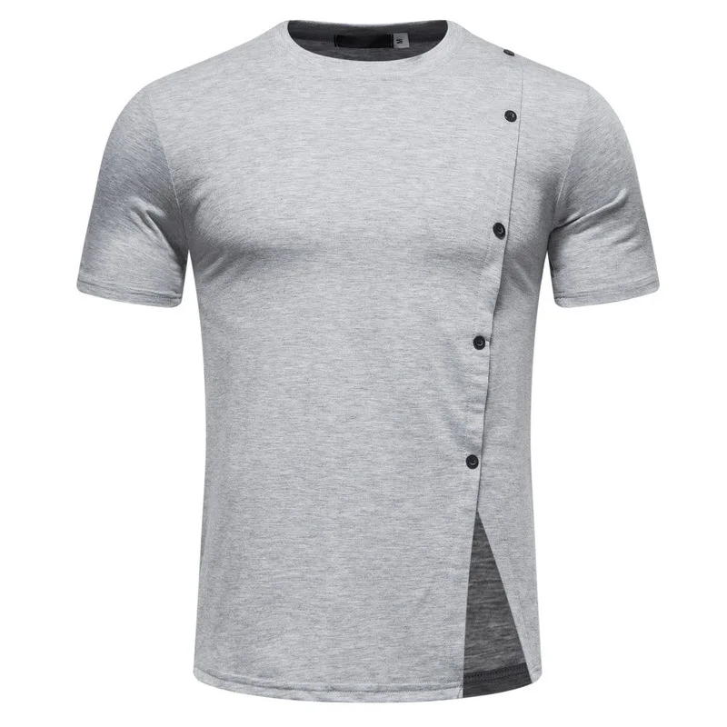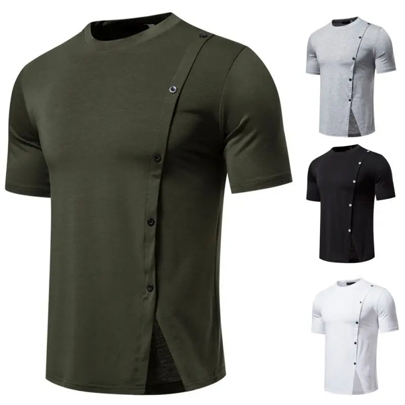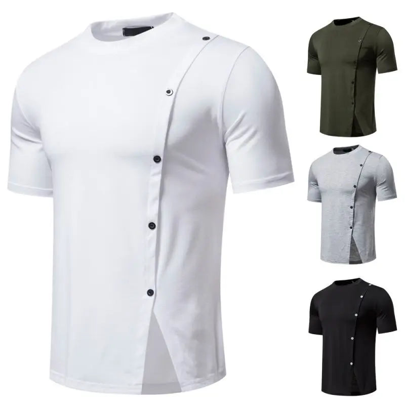 AIDASE  -  Men's Casual and Fashionable Short Sleeved T-shirt with Button Decoration on The Hem, Split Round Neck Short Sleeved T-shirt