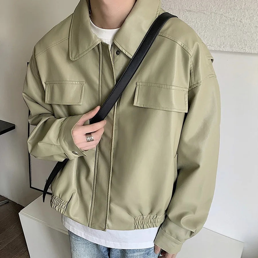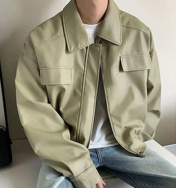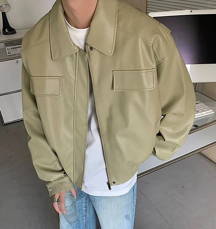 Aidase Men's Casual Texture PU Leather Jacket High Street Zippers Turn-down Collar Long Sleeve Retro Coat with Pocket Spring Autumn