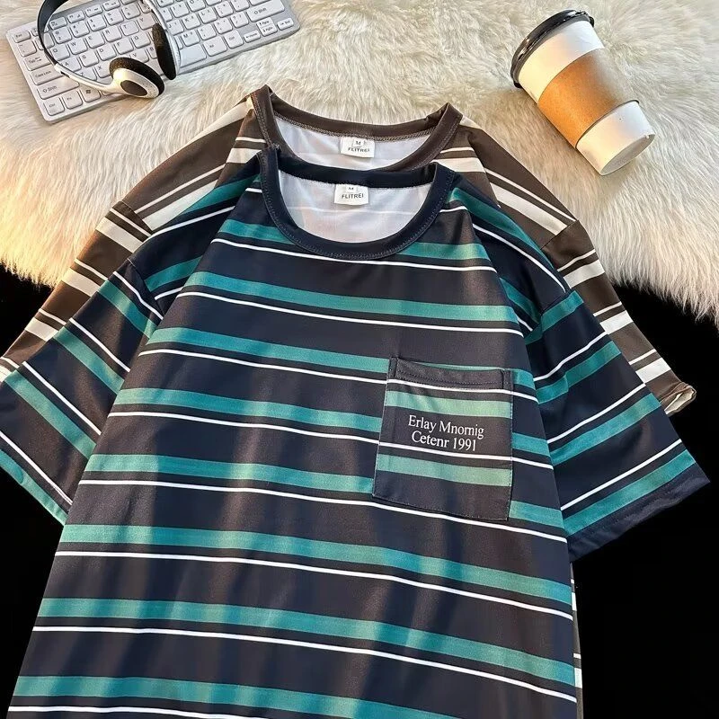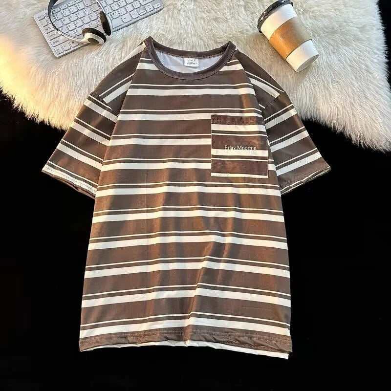 AIDASE - Men's Contrasting Striped T-shirt Japanese Retro Male Short Sleeved Summer Loose Casual Round Neck Pullover