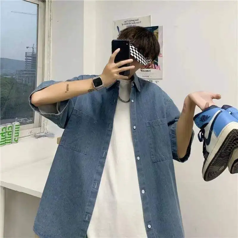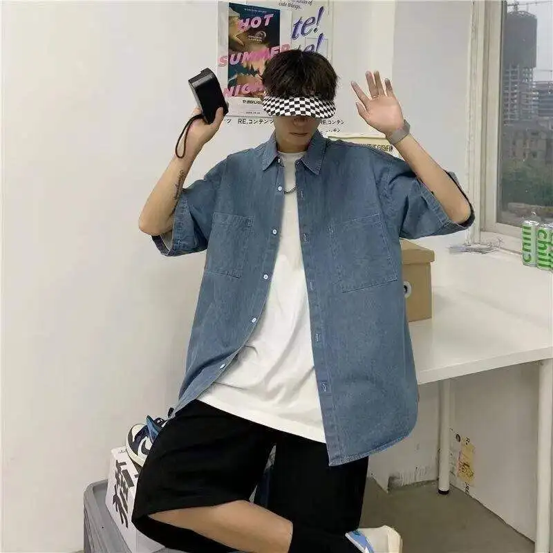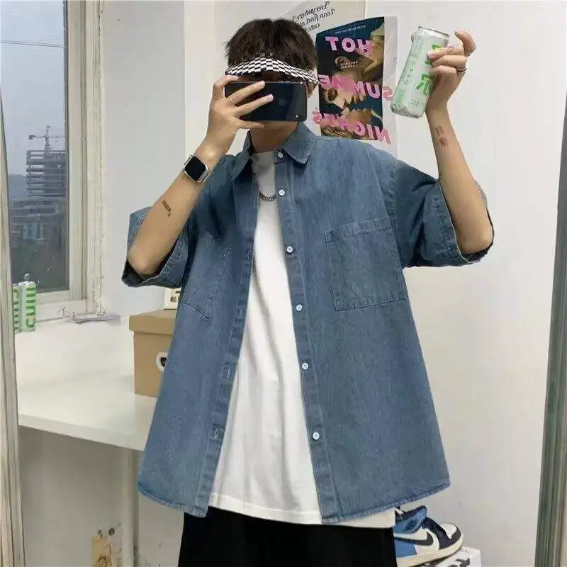 AIDASE - Men's Denim Short Sleeve Shirt Summer Korean Style Trendy Loose Cardigan Lapel Single Breasted Casual Male Tops