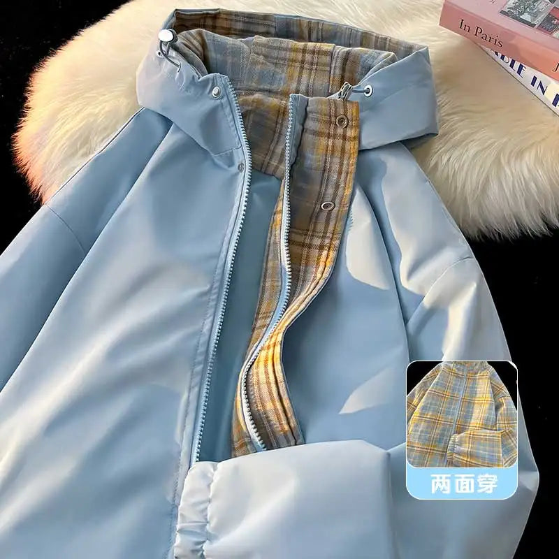 Mens Jacket Korean Streetwear New Reversible Plaid Jacket Varsity Coat Casual Plus Size Outwear Autumn Winter Unisex Windbreaker