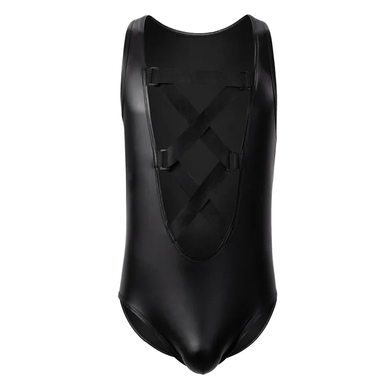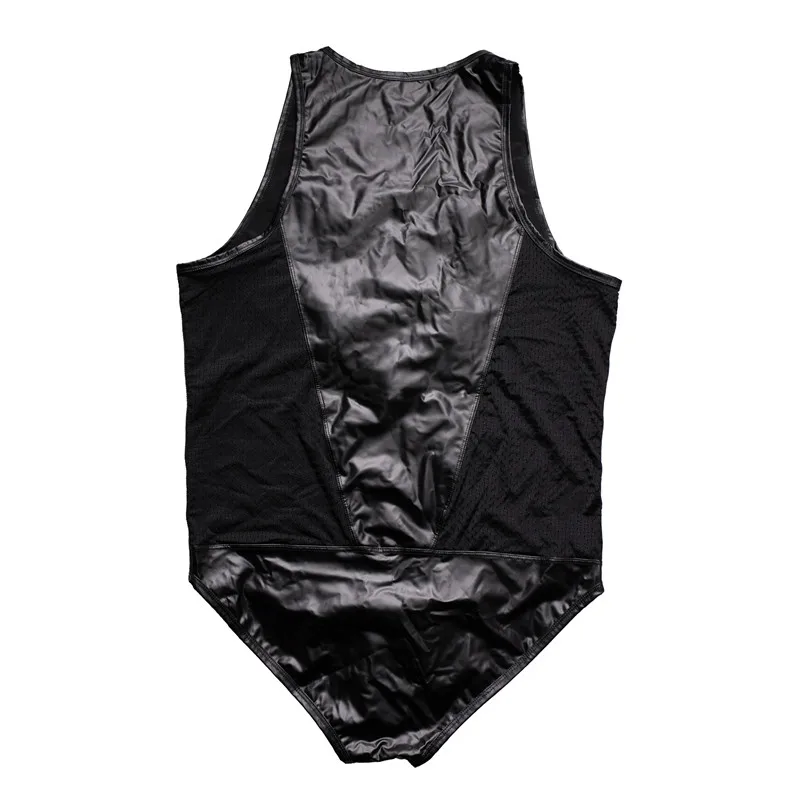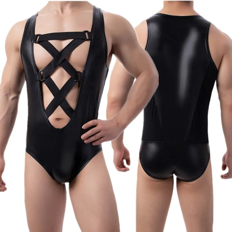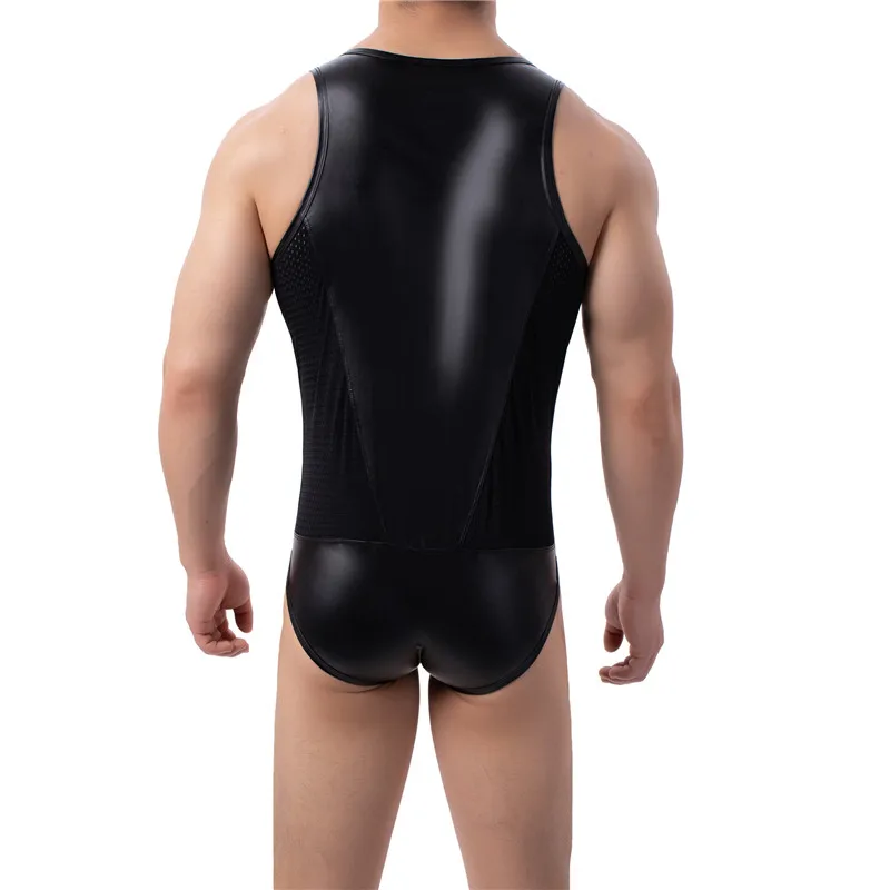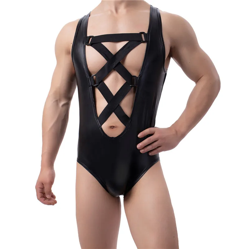 AIDASE - Mens PU Leather Bodysuits Sleeveless Leotard Front Hollow Out Rompers Faux Leather Jumpsuit Wrestling Singlet Nightclub Bodysuit