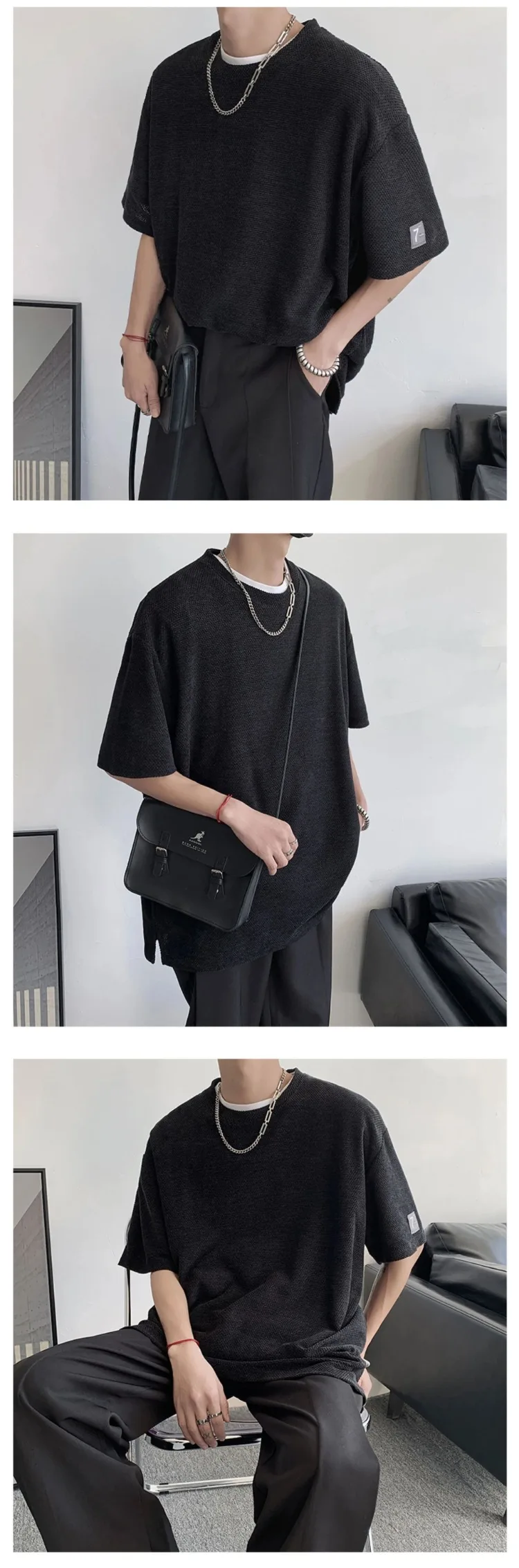 AIDASE - Men's Round Neck Short Sleeved T-shirt Summer Trendy Loose Casual Coffee Heavyweight Top Tees Oversize Honeycomb Knitting