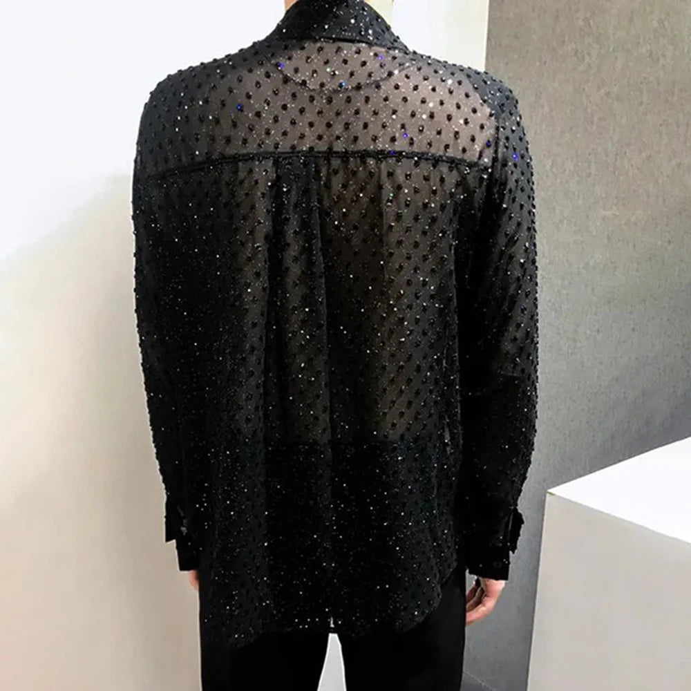 Mens Sexy Mesh See-Through Long-Sleeved Shirt Autumn Genderless Fashion Youth Nightclub Shiny Breathable Performance Top Unisex