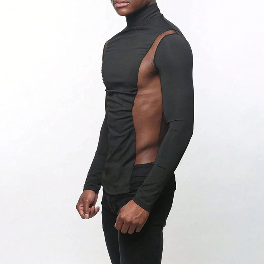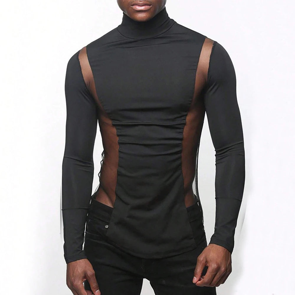 Mens Sexy Tight-Fitting Sports Fitness Mesh Long-Sleeved Tops Autumn Nightclubs Perspective Stitching Stretch Turtleneck Tops