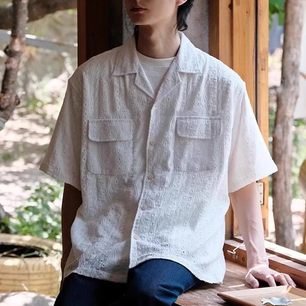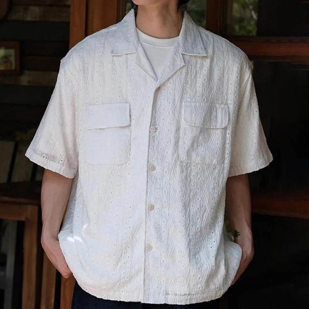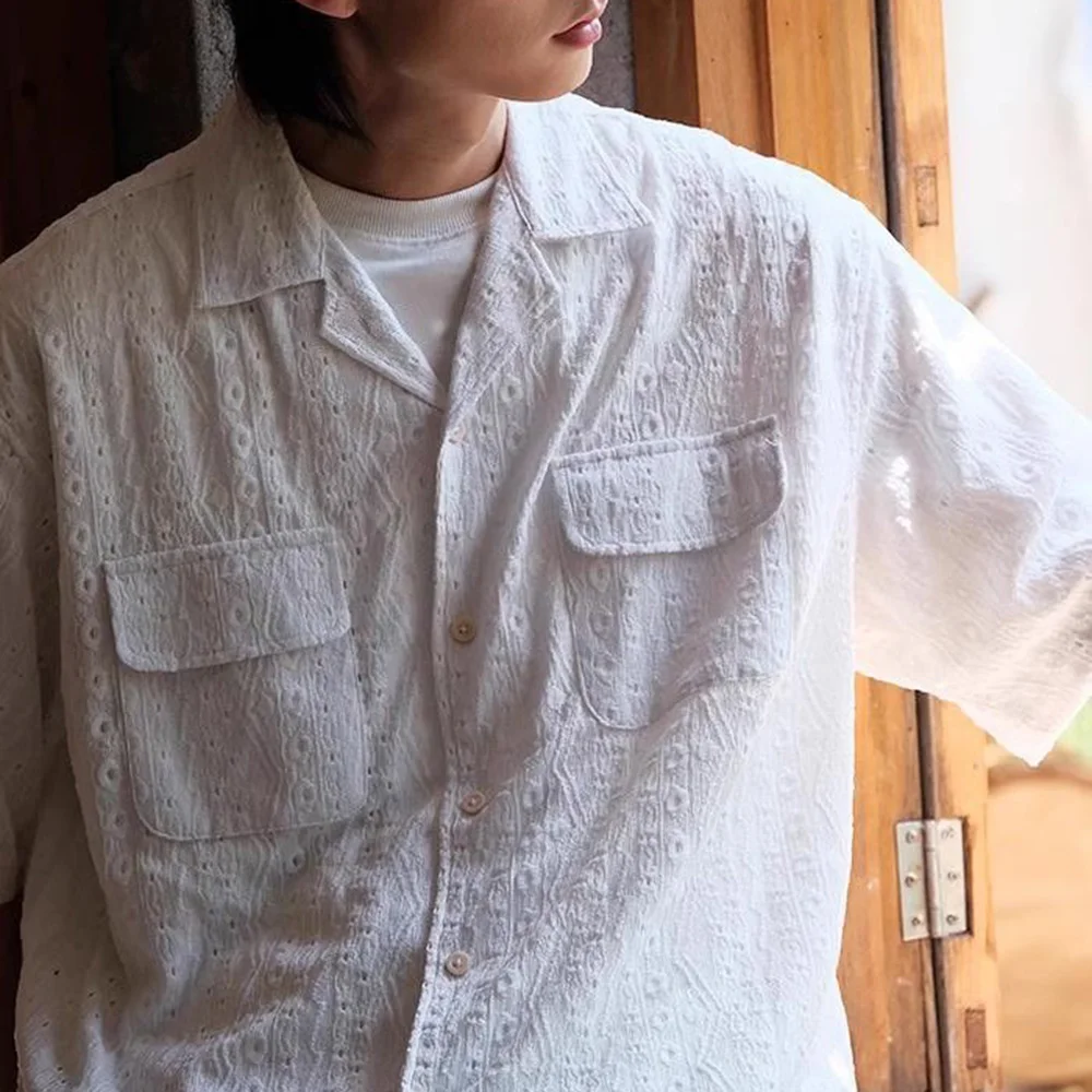 Mens Shirt Textured Pocket Casual Shirt Summer Streetwear Beach Vacation Solid Color Camping Short-Sleeve Top Men'S Clothing